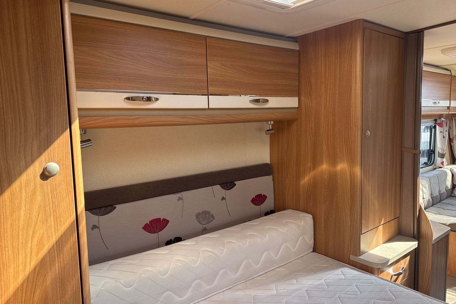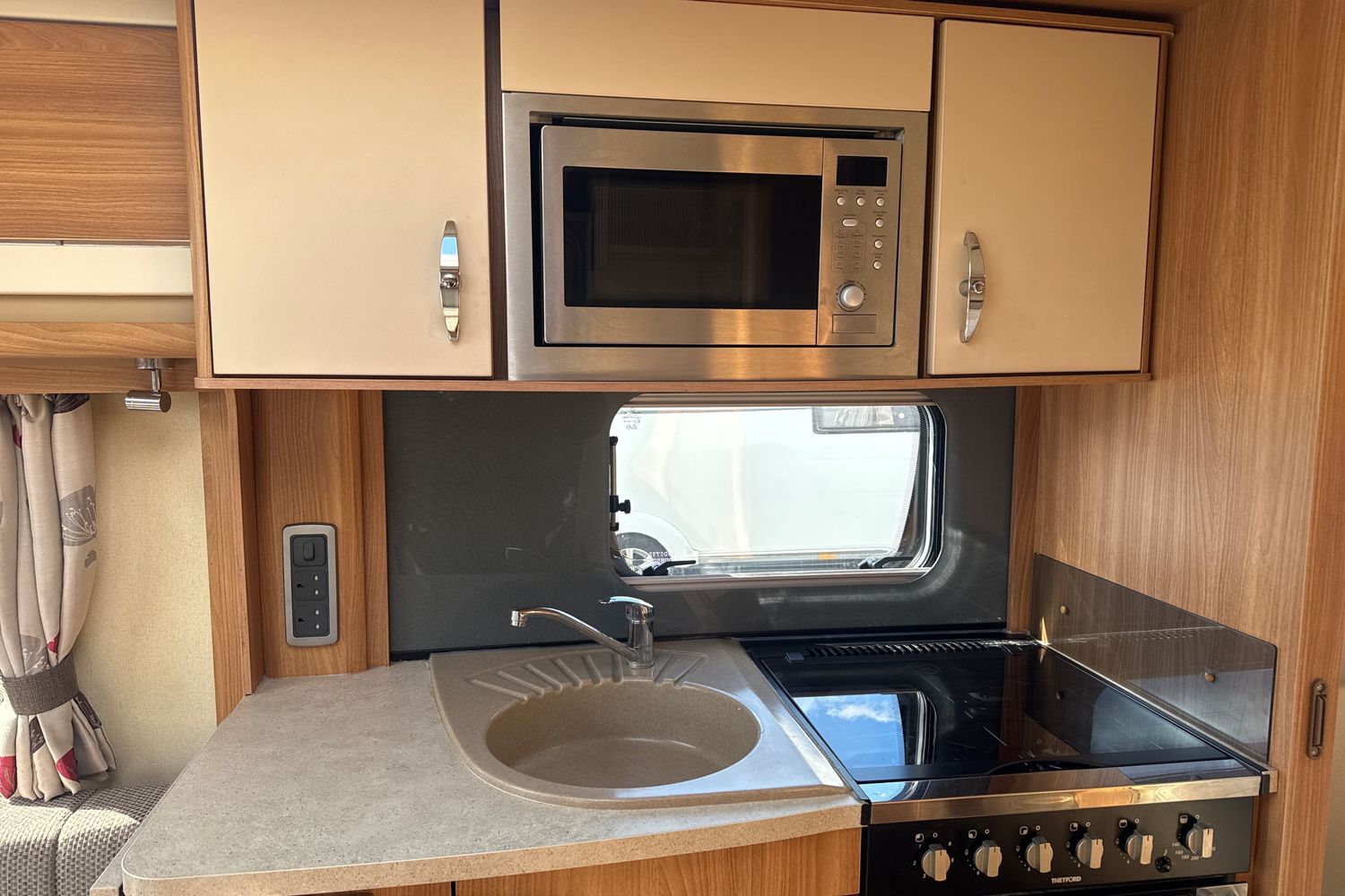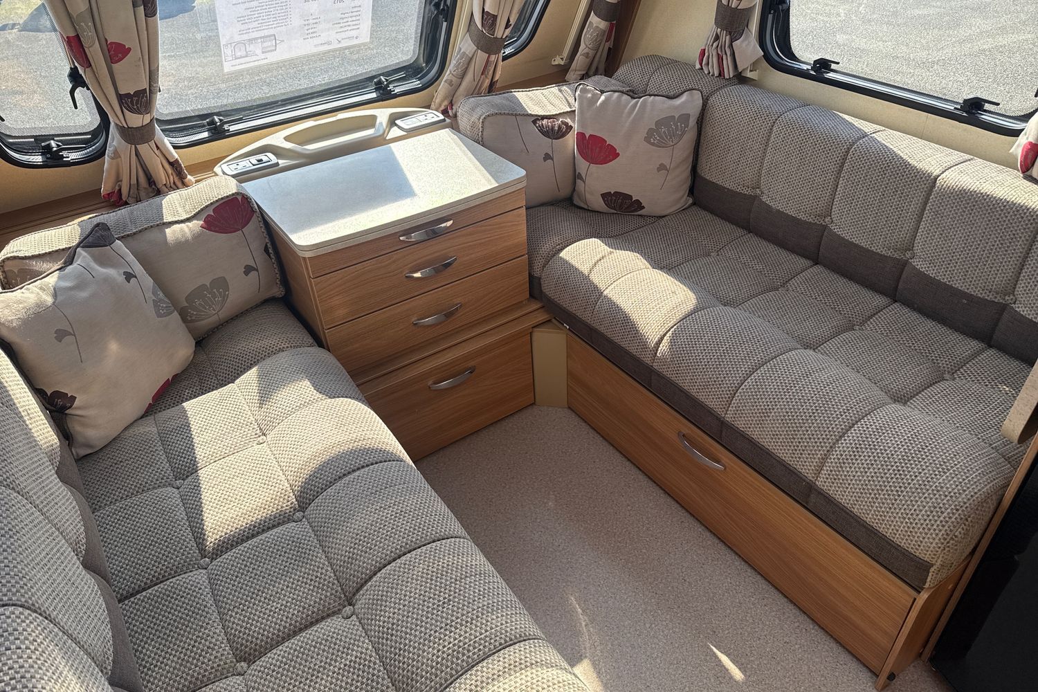 Popular single axle model which features a dedicated full width rear washroom with seperate walk in fully lined shower compartment, sink and vanity unit with back-lit vanity mirror and thetford swivel cassette toilet with electric flush operation.