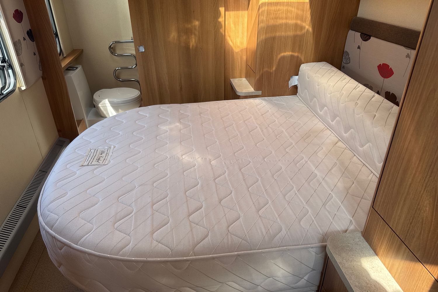 Centre fixed 'transverse' walk around island bed which retracts 500mm during the daytime and also features a duvalite duvalay domestic style mattress that will offer a generous nights rest and relaxation. His 'n' her wardrobes either side of the bed complaete with overhead storage lockers plus an abundance of useable under bed storage.