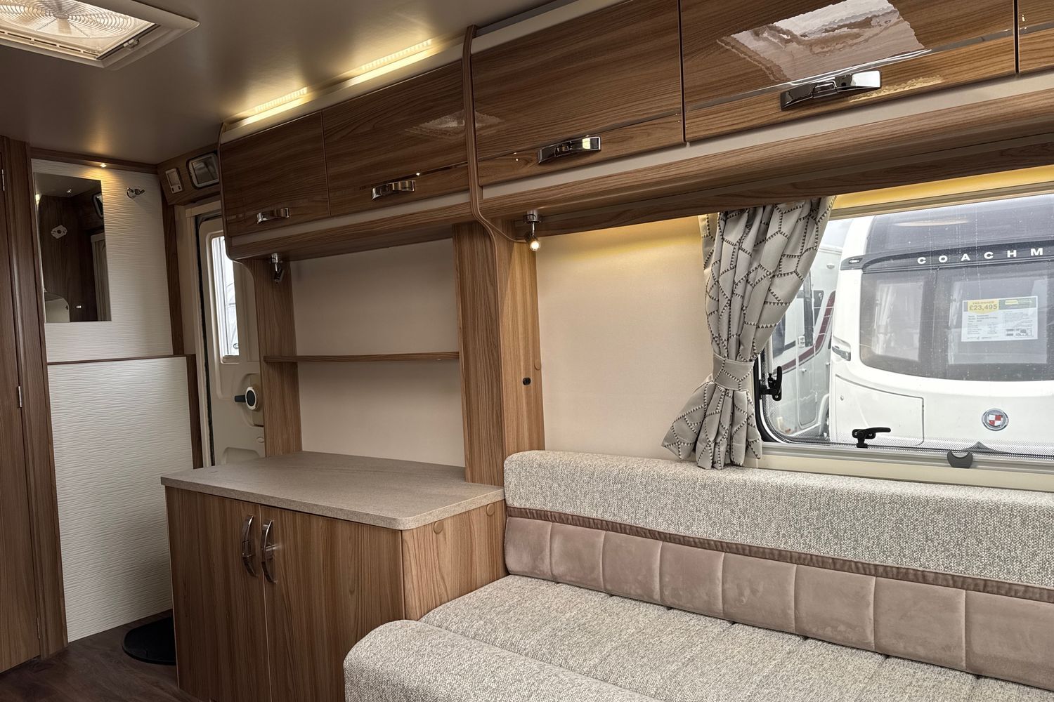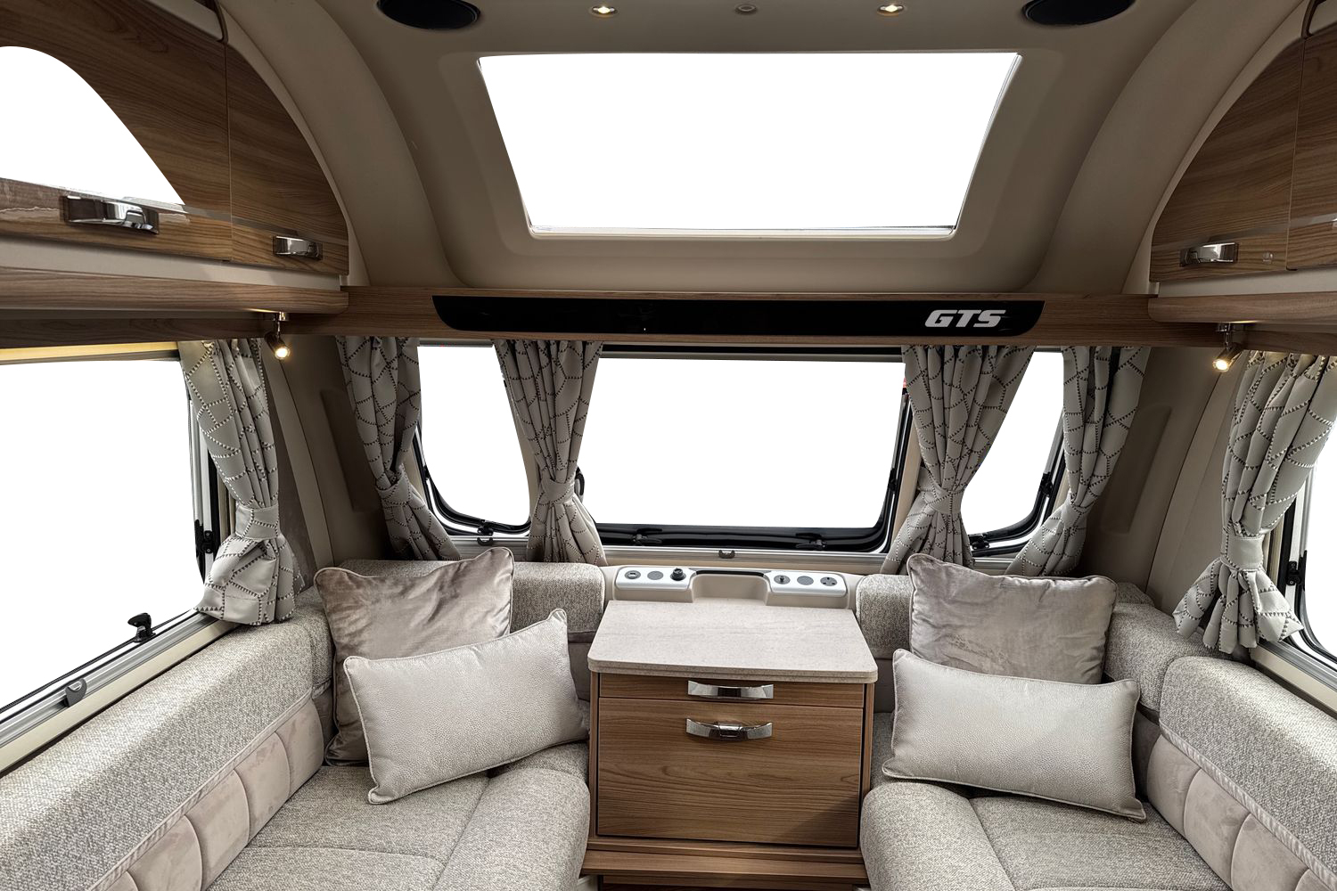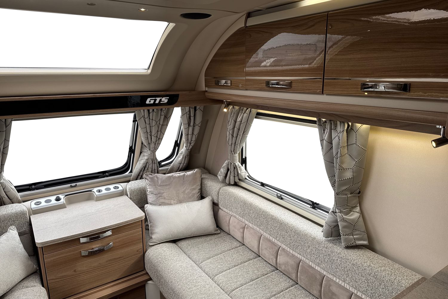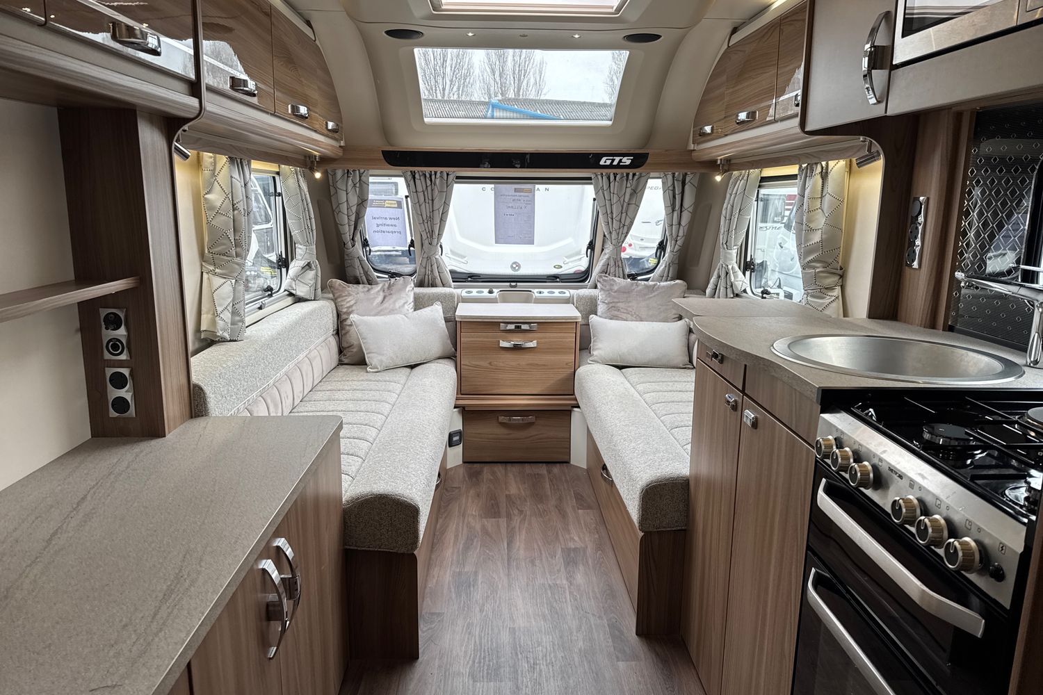 Parallel front lounge arrangement finished off in unspoilt and original upgraded soft furnishings with matching curtains/tie-backs, original scatter cushions and drop-in removeable bound edge carpet set. Front lounge converts into a large double bed or can be used as two single long day beds. Full width pamormaic front sunroof lets in generous amounts of natural daylight, full LED dimmable lighting, pleated Horex night blinds and flyscreens, luxury ALDE wet central heating and hot water system, and all utilities are controlled by a Swift Command 7" TFT control panel.