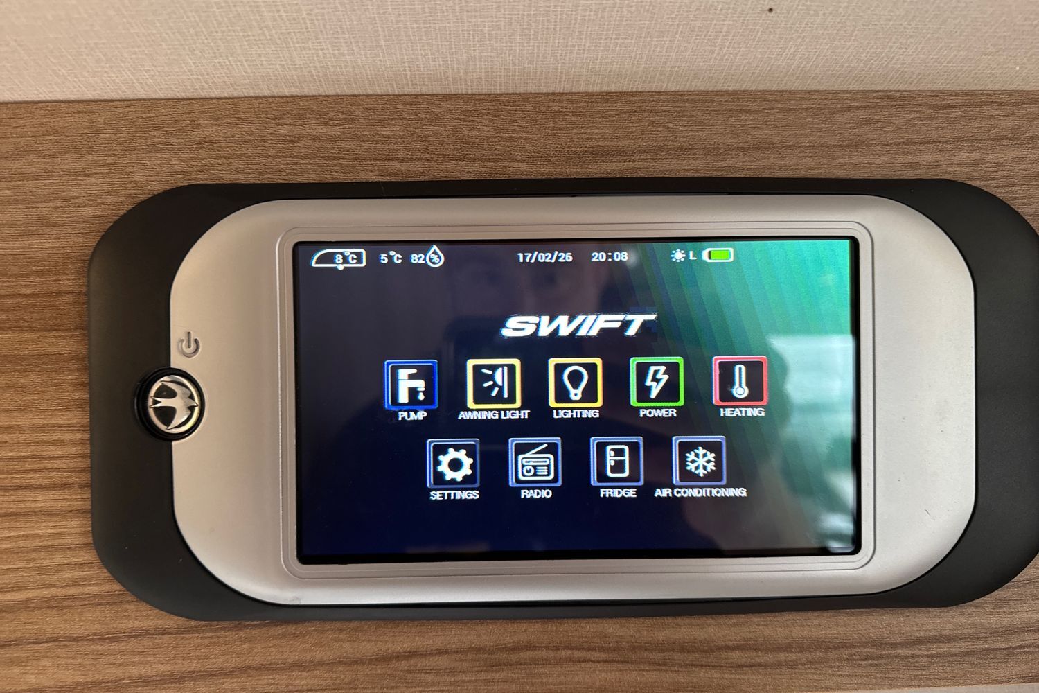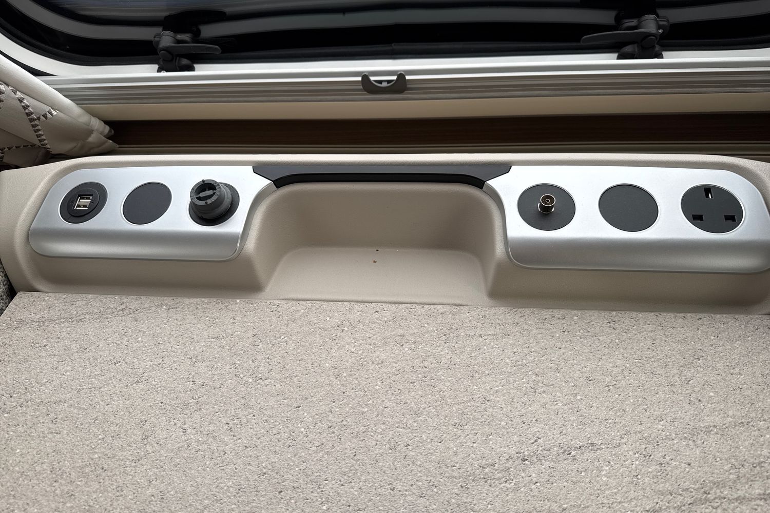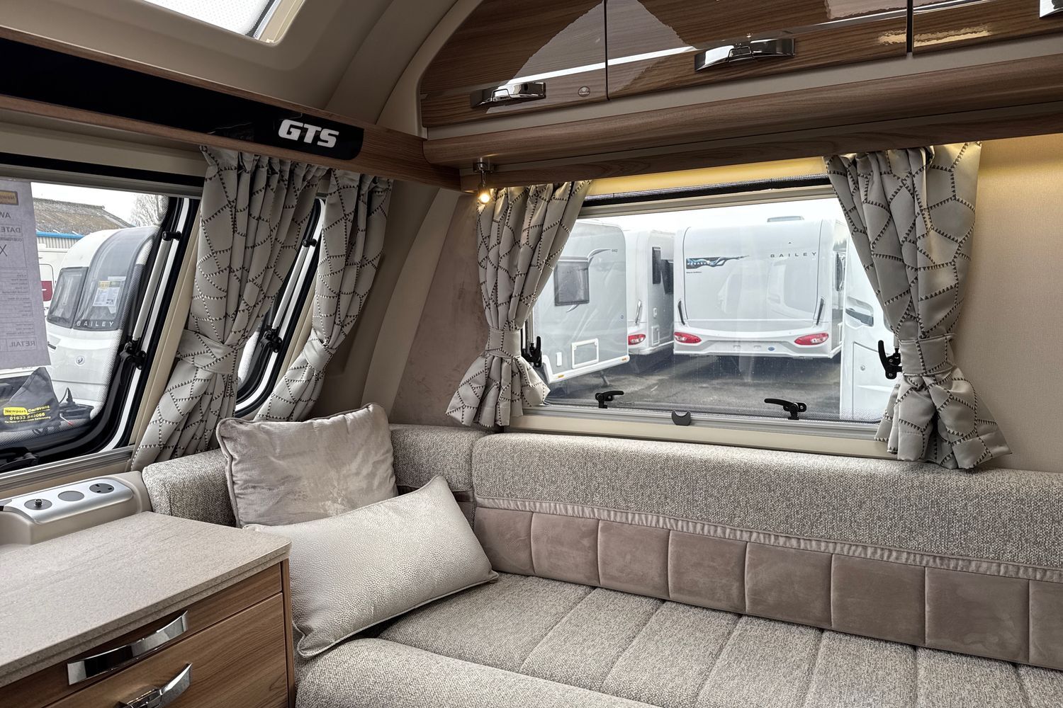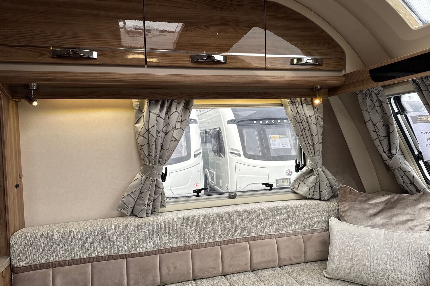 Parallel front lounge arrangement finished off in unspoilt and original upgraded soft furnishings with matching curtains/tie-backs, original scatter cushions and drop-in removeable bound edge carpet set. Front lounge converts into a large double bed or can be used as two single long day beds. Full width pamormaic front sunroof lets in generous amounts of natural daylight, full LED dimmable lighting, pleated Horex night blinds and flyscreens, luxury ALDE wet central heating and hot water system, and all utilities are controlled by a Swift Command 7" TFT control panel.