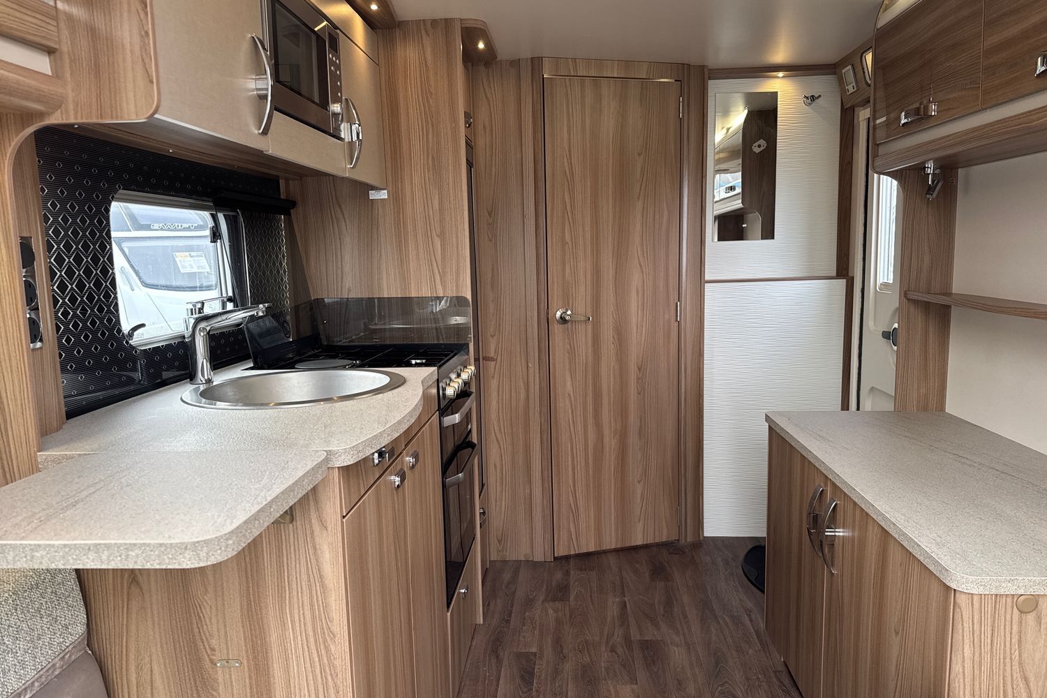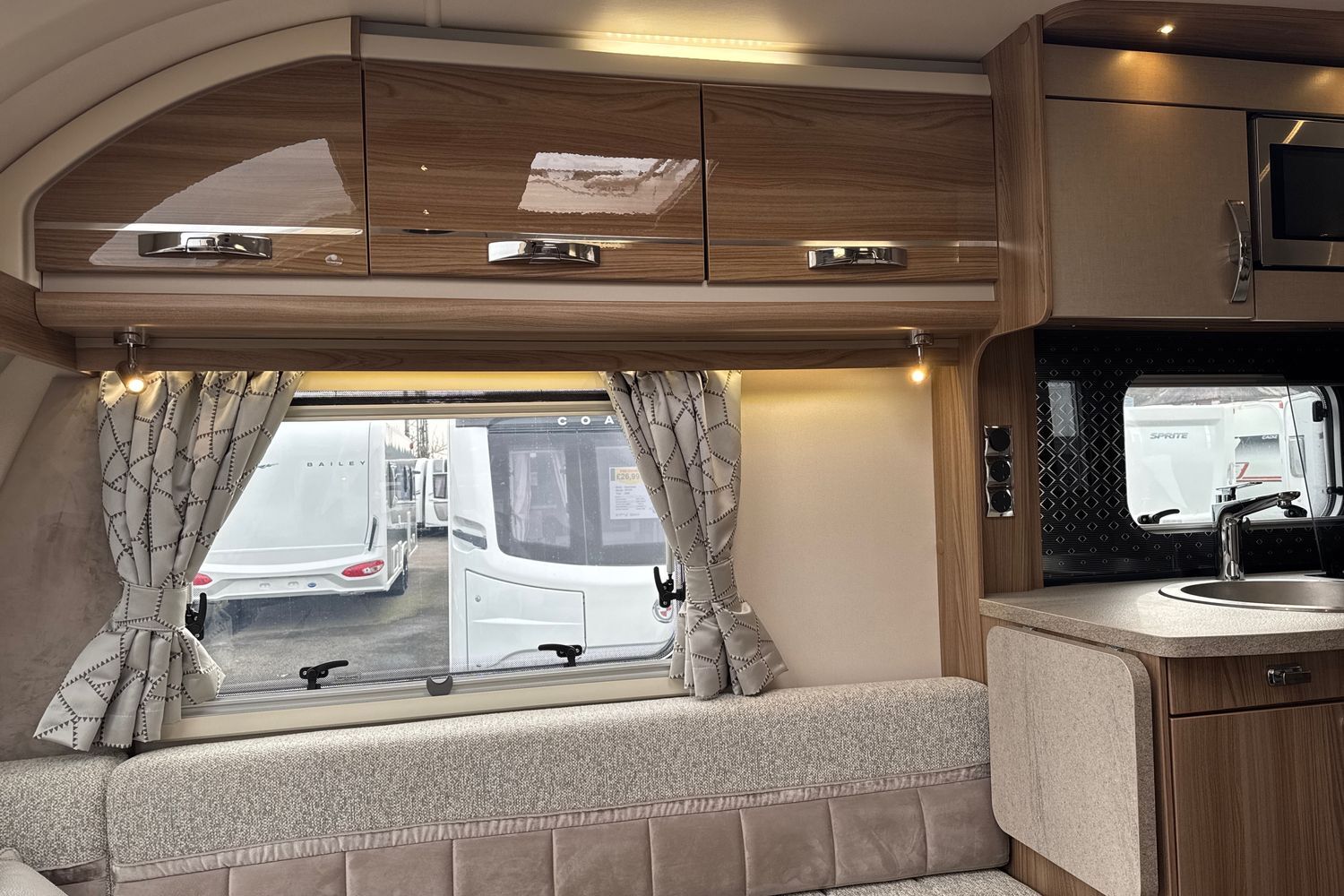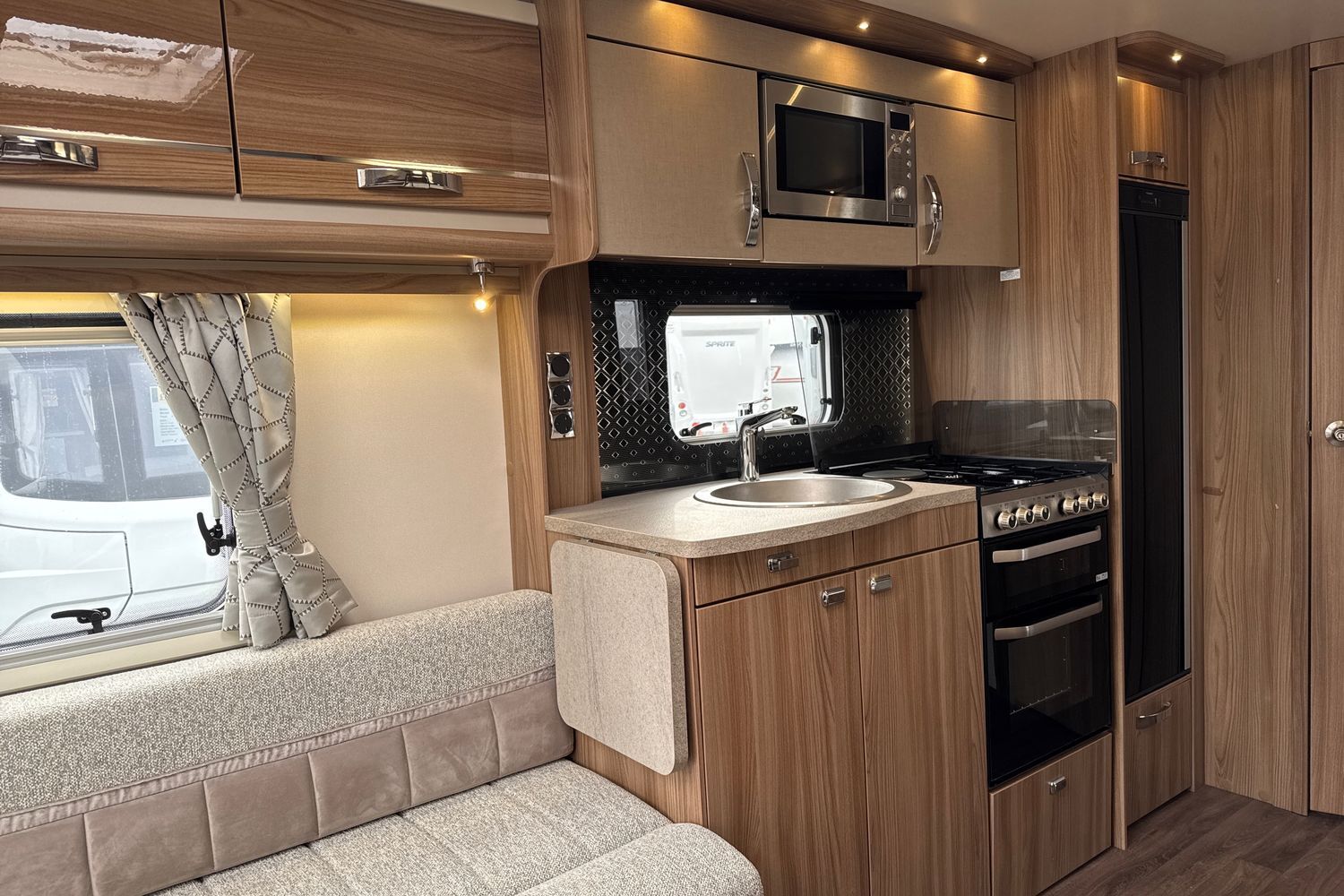 Well appointed centrally located kitchen area compete with large low sideboard opposite which is great area for food preparation. Domestic style gas oven, grill, hob with additional 800w electric hotplate, brushed aluminium microwave, recessed circular sink with clip on draining board and dometic tall/slimline gloss black fronted fridge with integral freezer compartment.