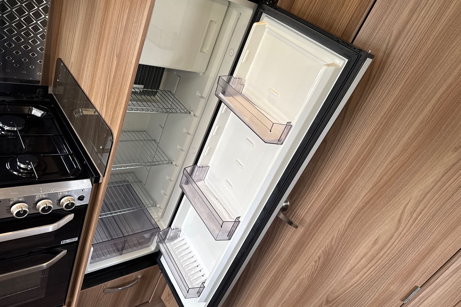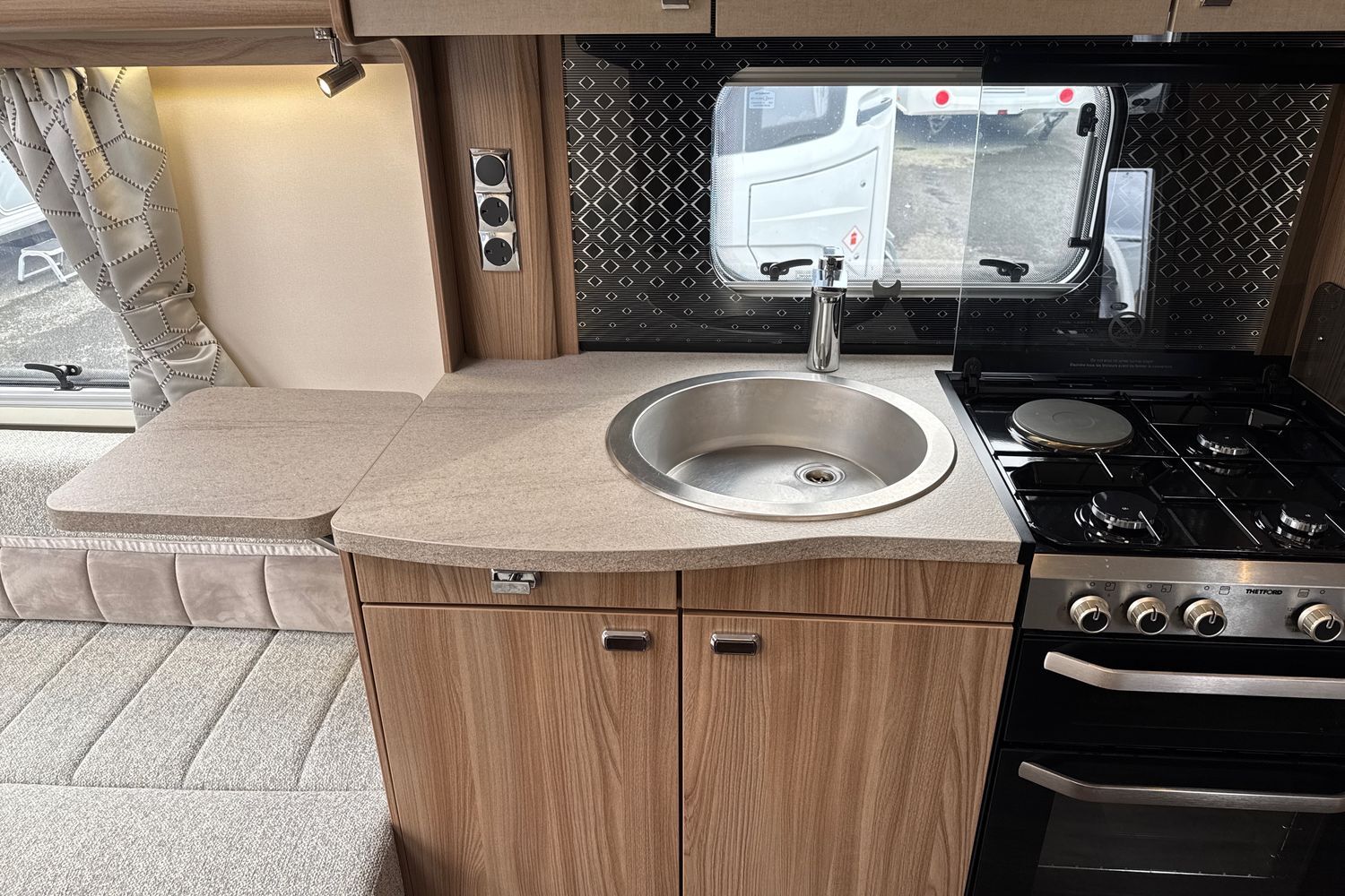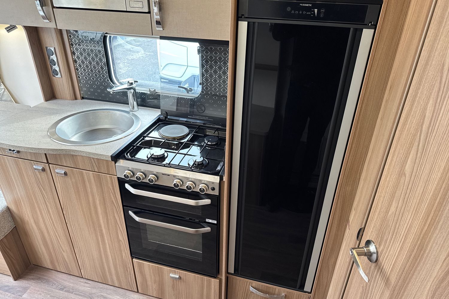 Well appointed centrally located kitchen area compete with large low sideboard opposite which is great area for food preparation. Domestic style gas oven, grill, hob with additional 800w electric hotplate, brushed aluminium microwave, recessed circular sink with clip on draining board and dometic tall/slimline gloss black fronted fridge with integral freezer compartment.