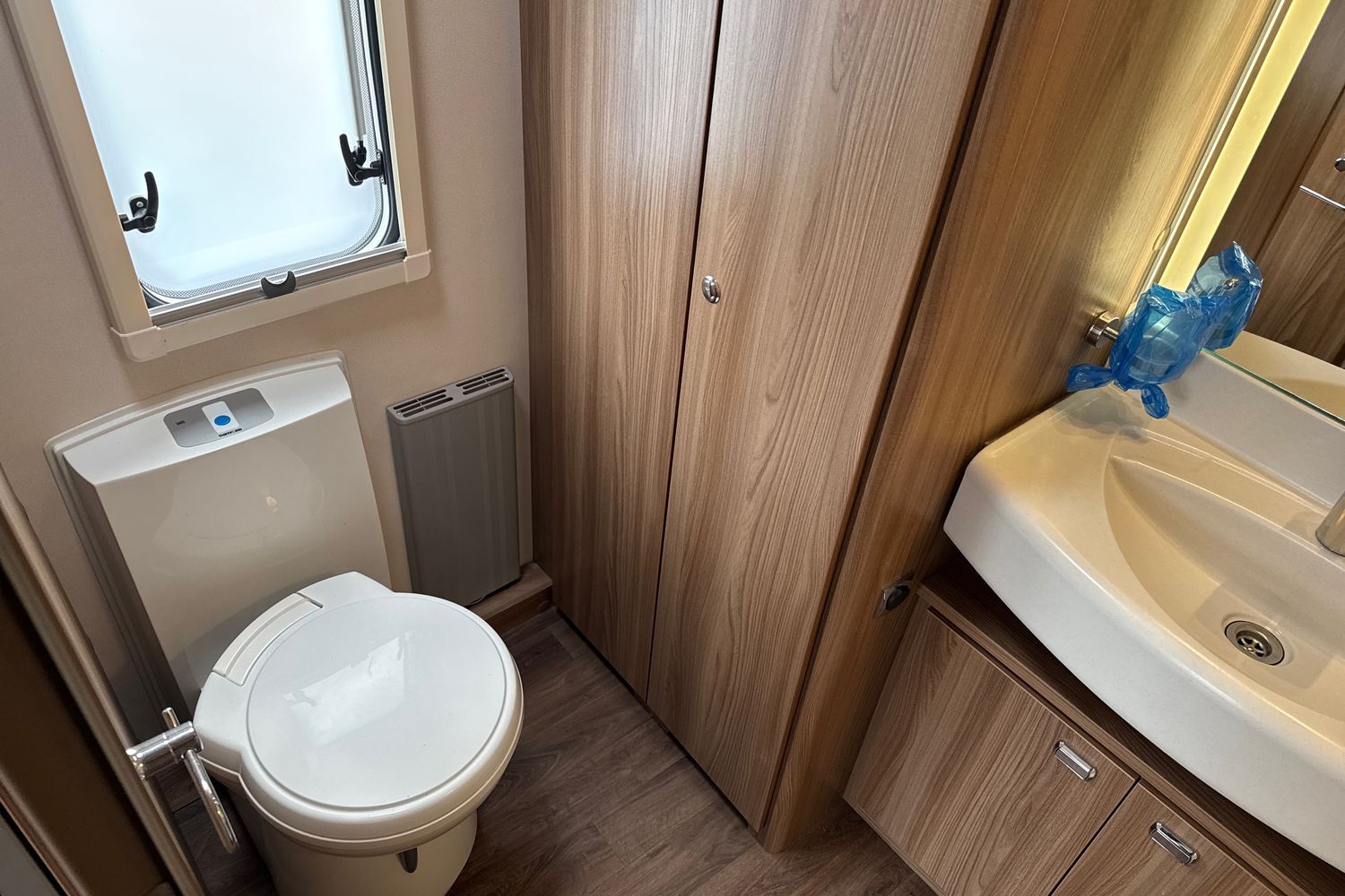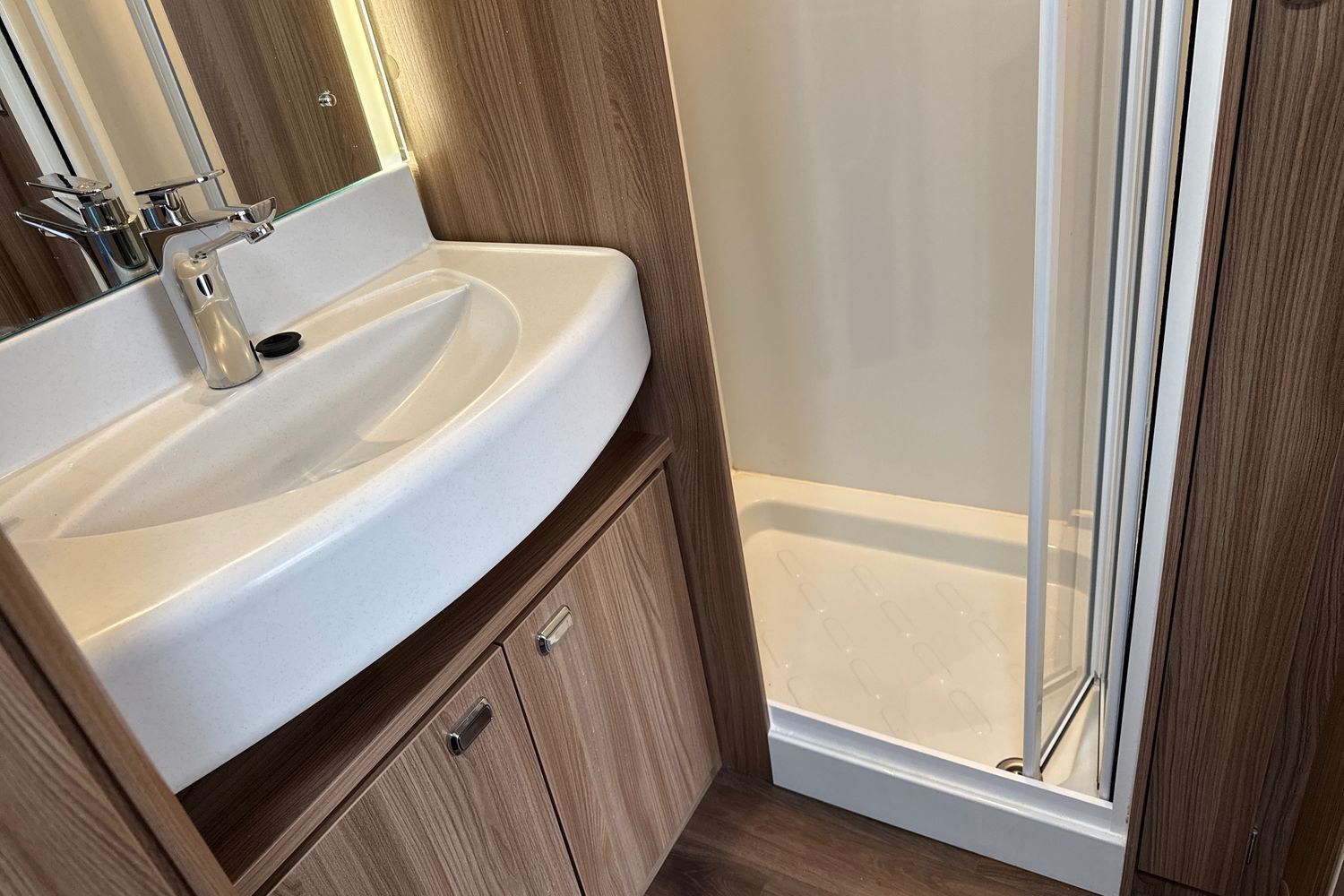 Rear full width bathroom features a dedicated walk in shower unit with hot and cold shower mixer tap with water saving eco-camel orbit showerhead, sink and vanity unit with LED backlit vanity mirror, large wardrobe and thetford swivel cassette toilet with electric flush operation.
