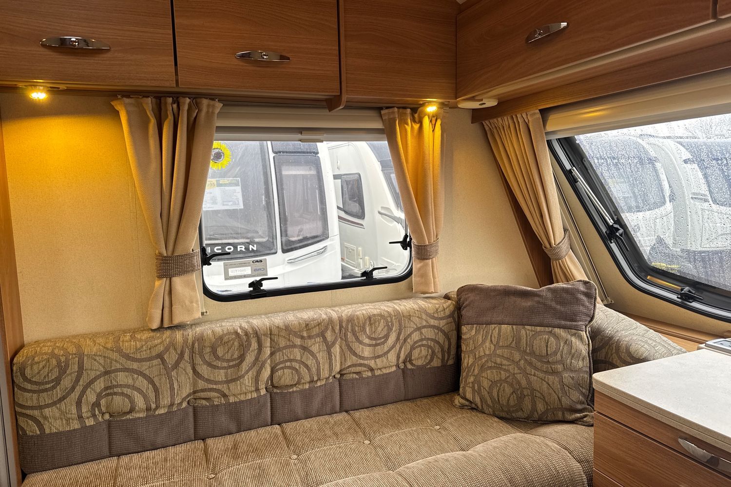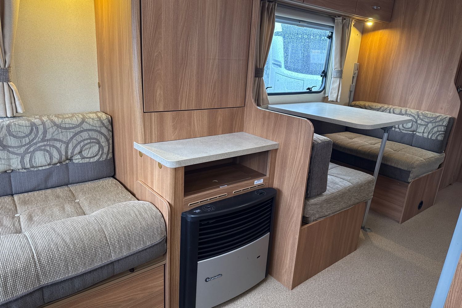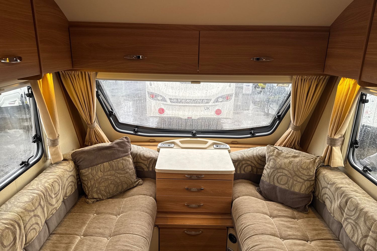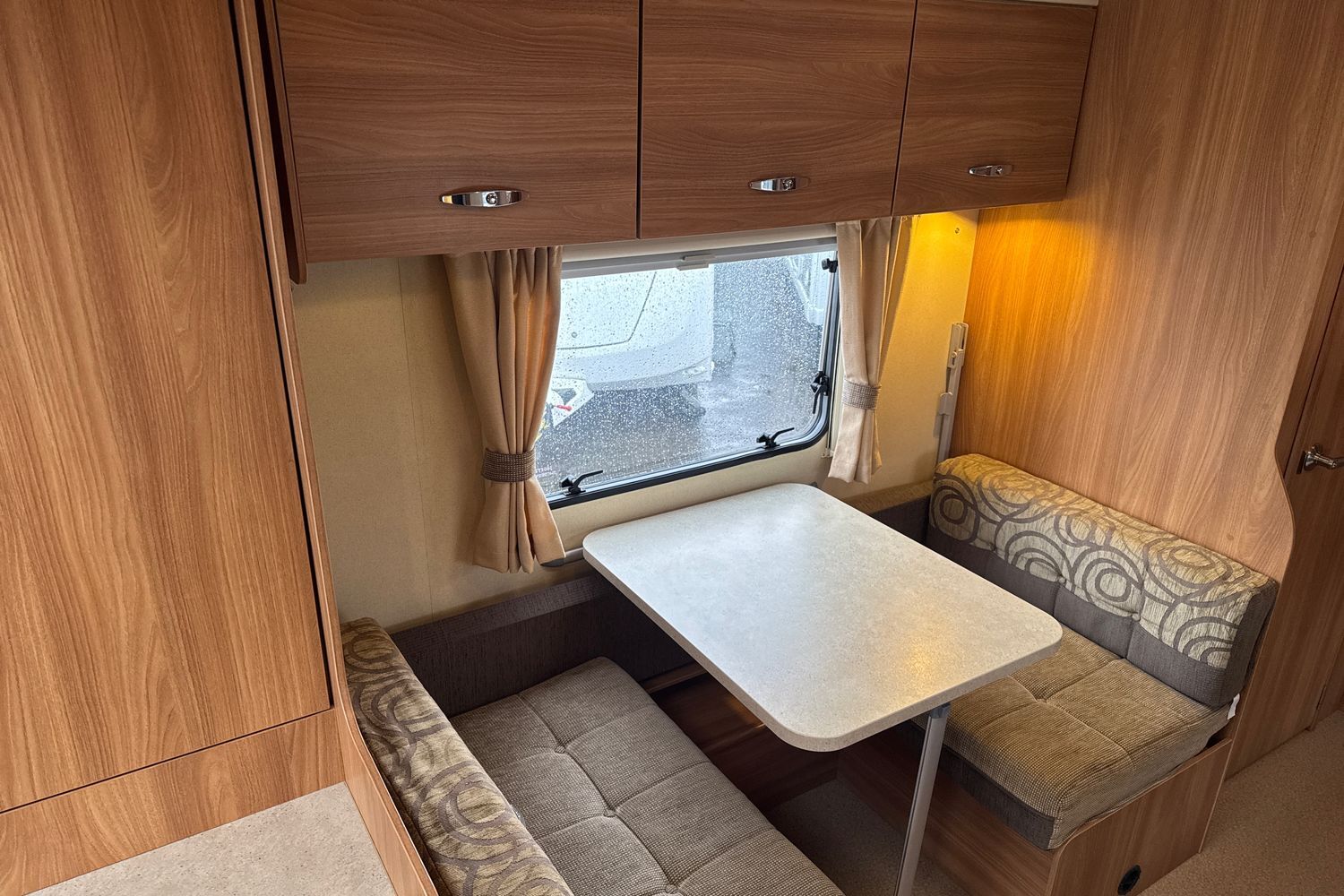 Delightful front lounge arrangment finished off in upgraded upholstery (from Swift Challenger range), lounge easily converts into a large double bed.