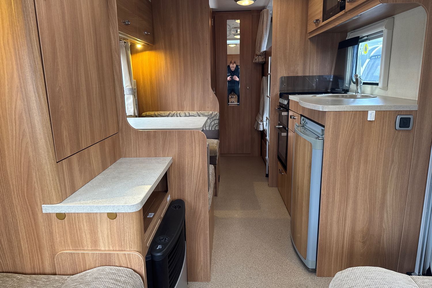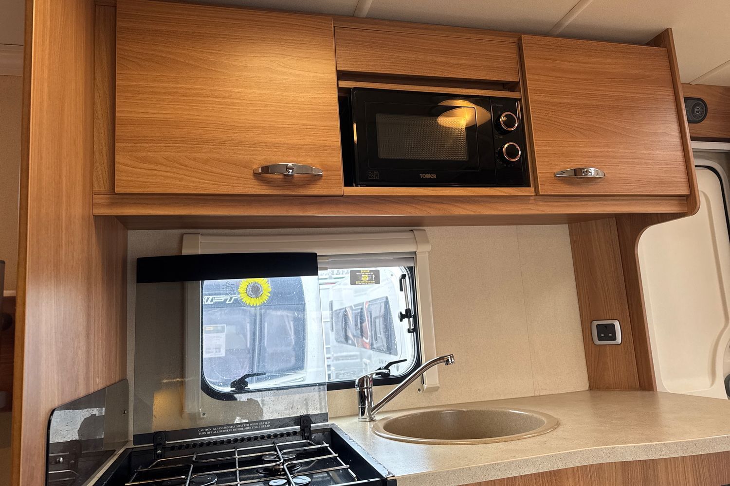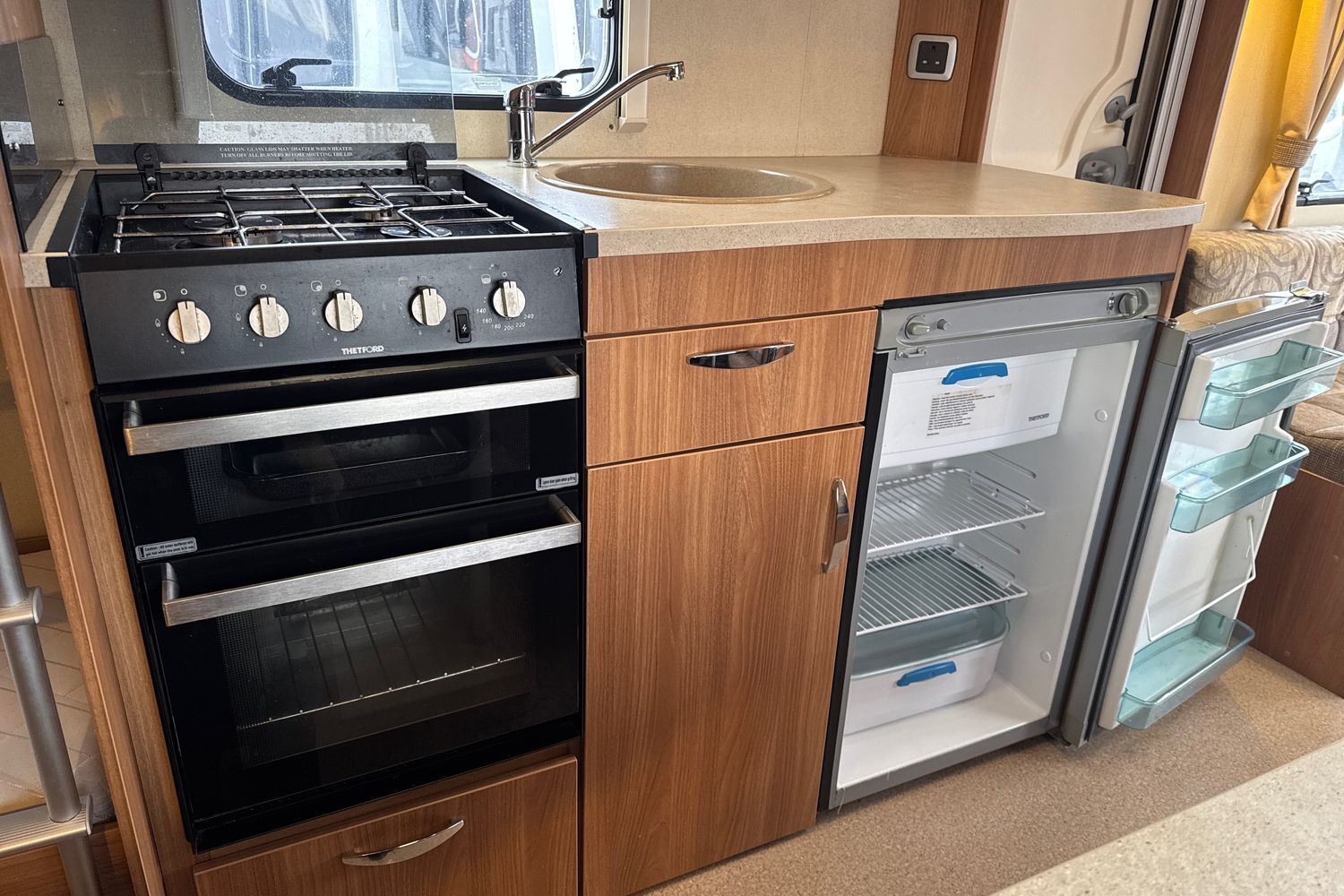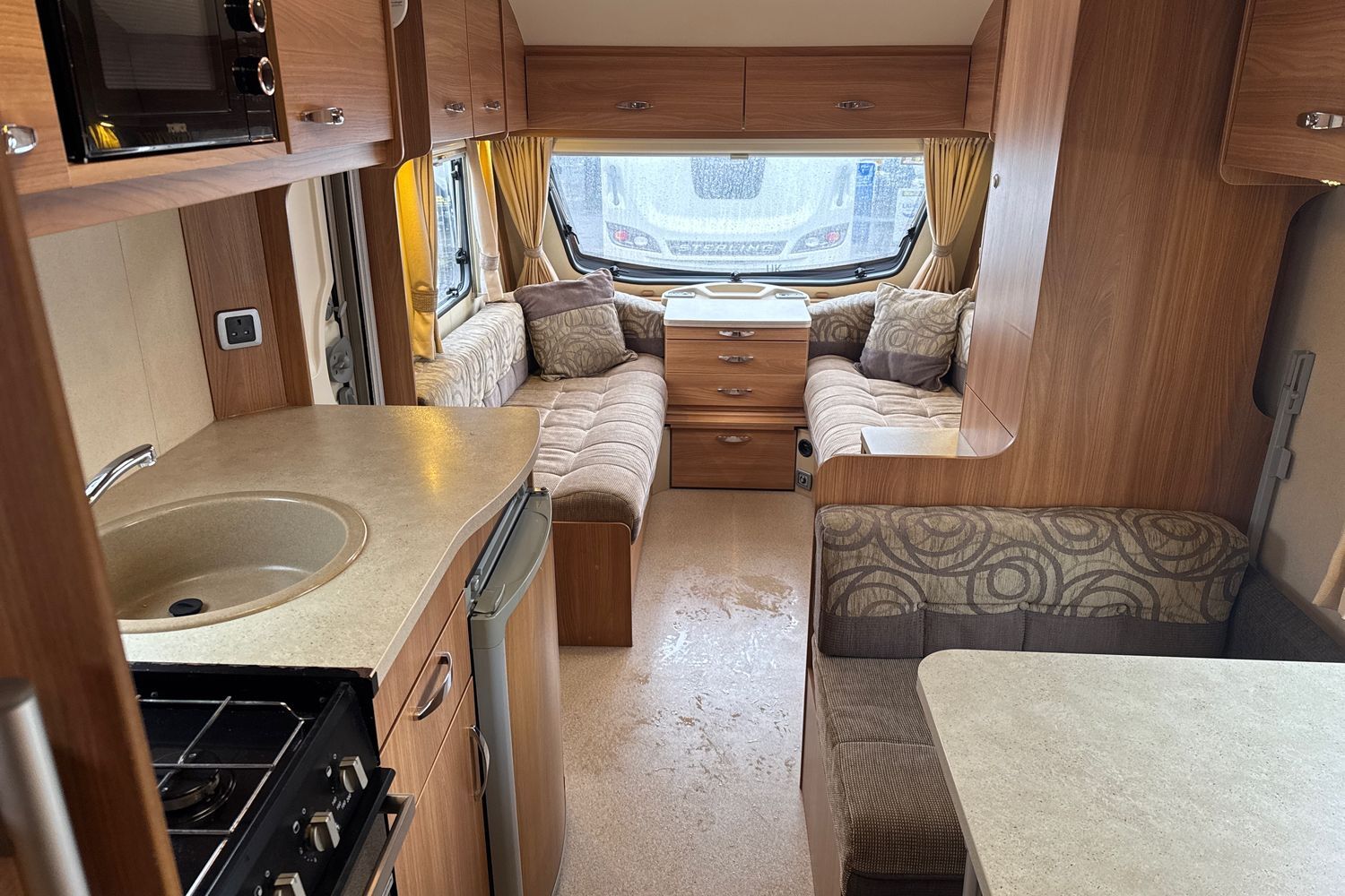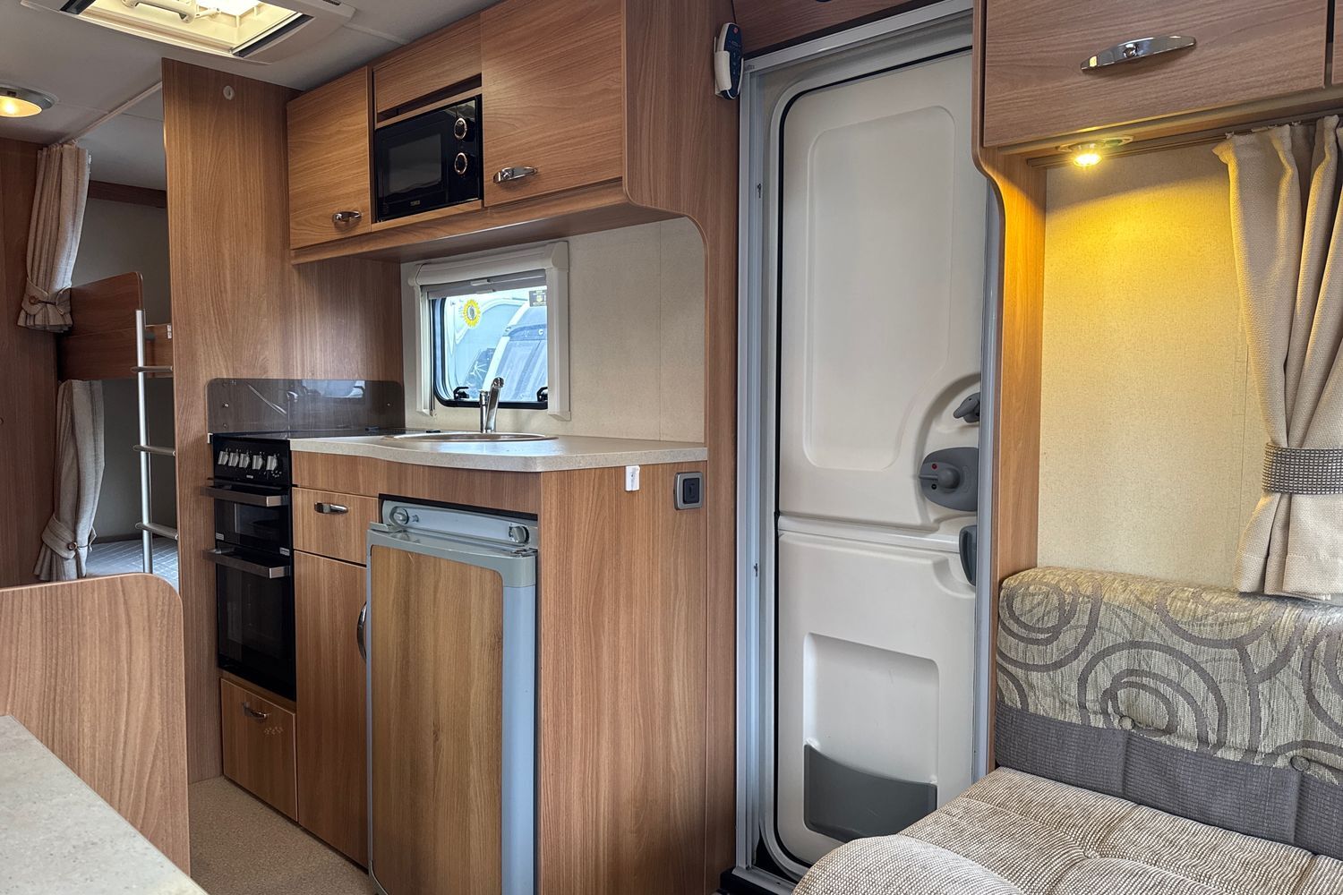 Well appointed kitchen complete with thetford gas oven and grill with accompanying 3-burner gas hob and folding glass lid, recessed aluminium washing up sink with chrome hot and cold mixer tap, 3-way fridge with integralfreezer compartment and factory fitted microwave.