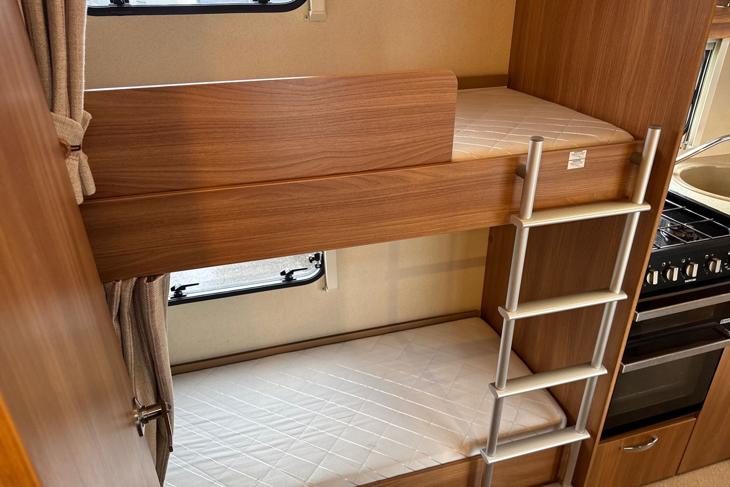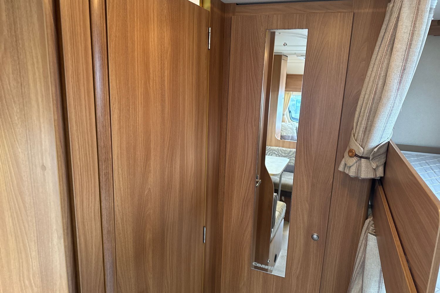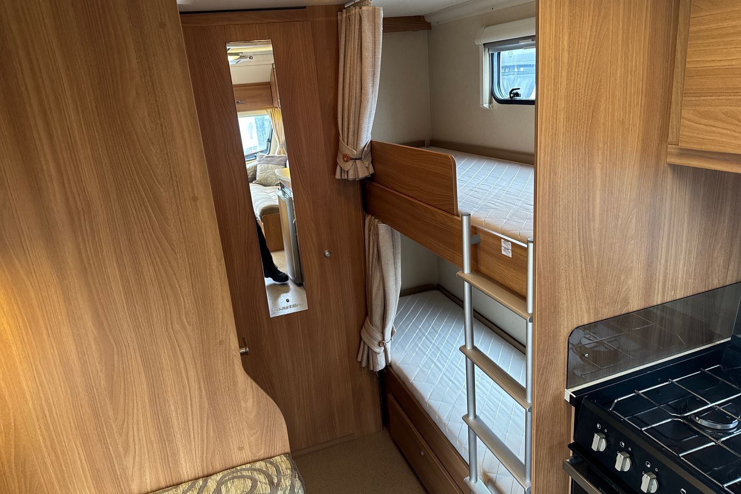 Layout consists of rear right hand corner dedicated bunk beds, large central wardrobe and washroom to the rear right hand side with a large seperate walk in shower unit, thetford swivel cassette chemical toilet and vanity unit with handbasin and chrome hot and cold mixer tap.