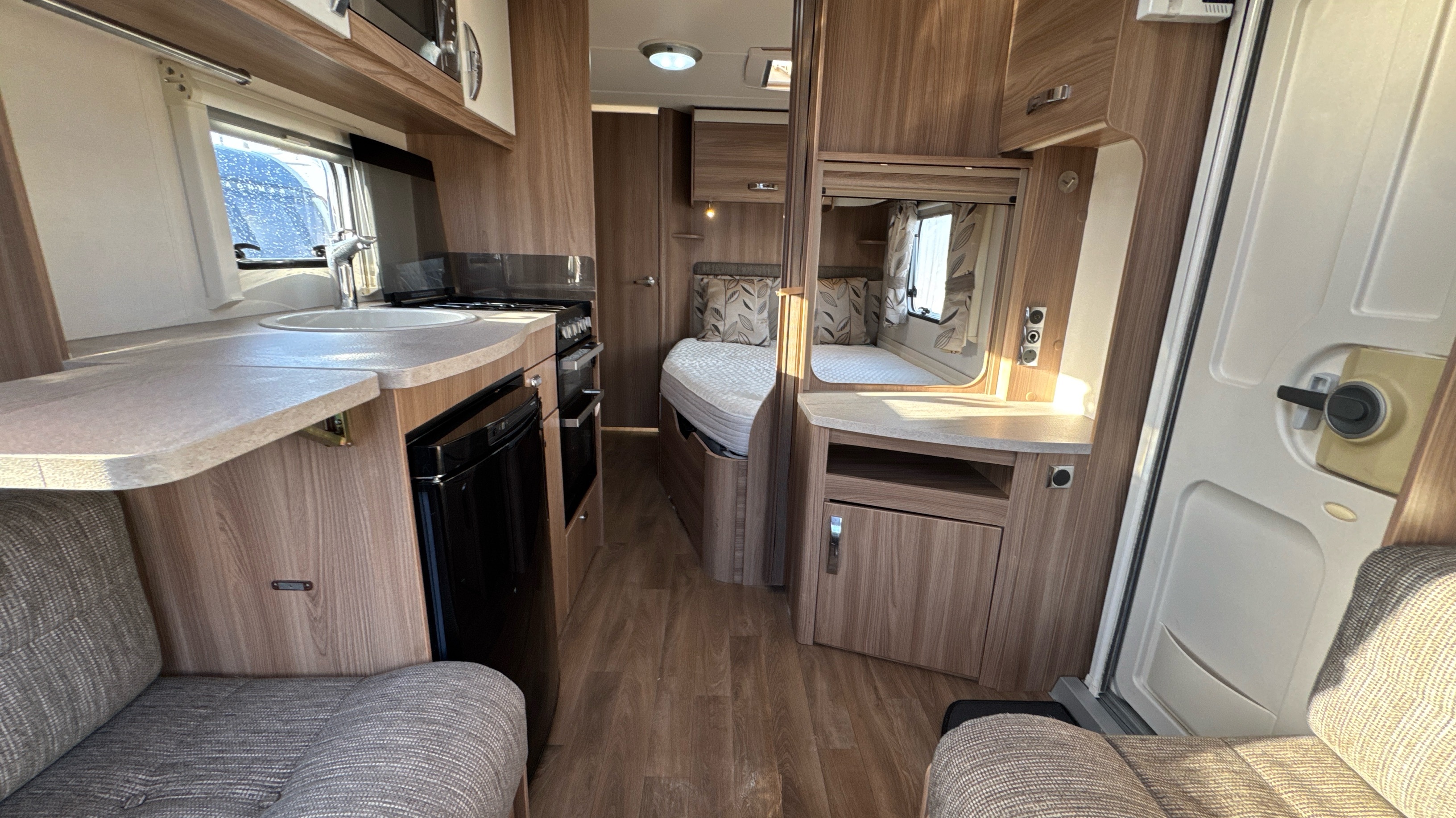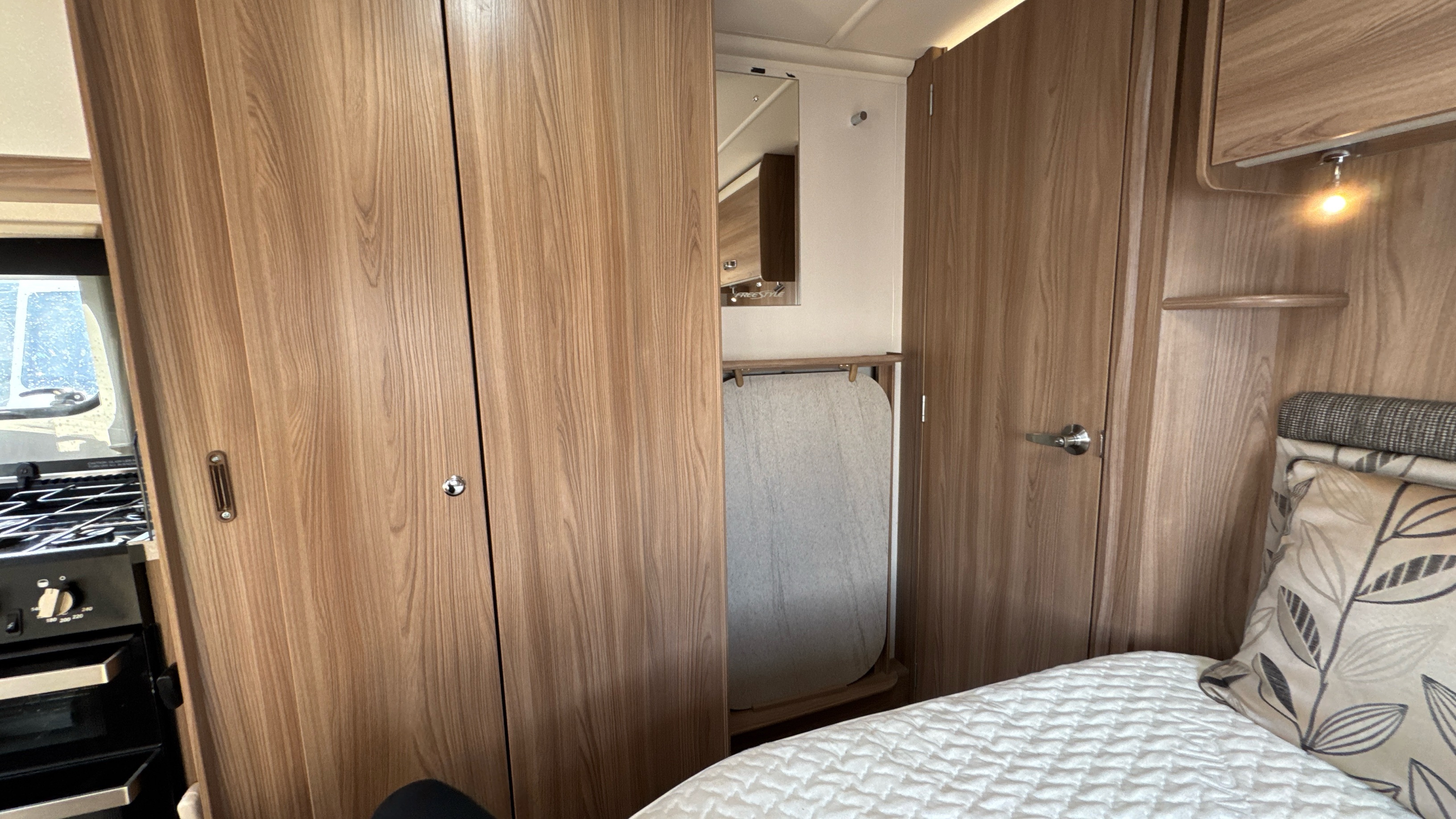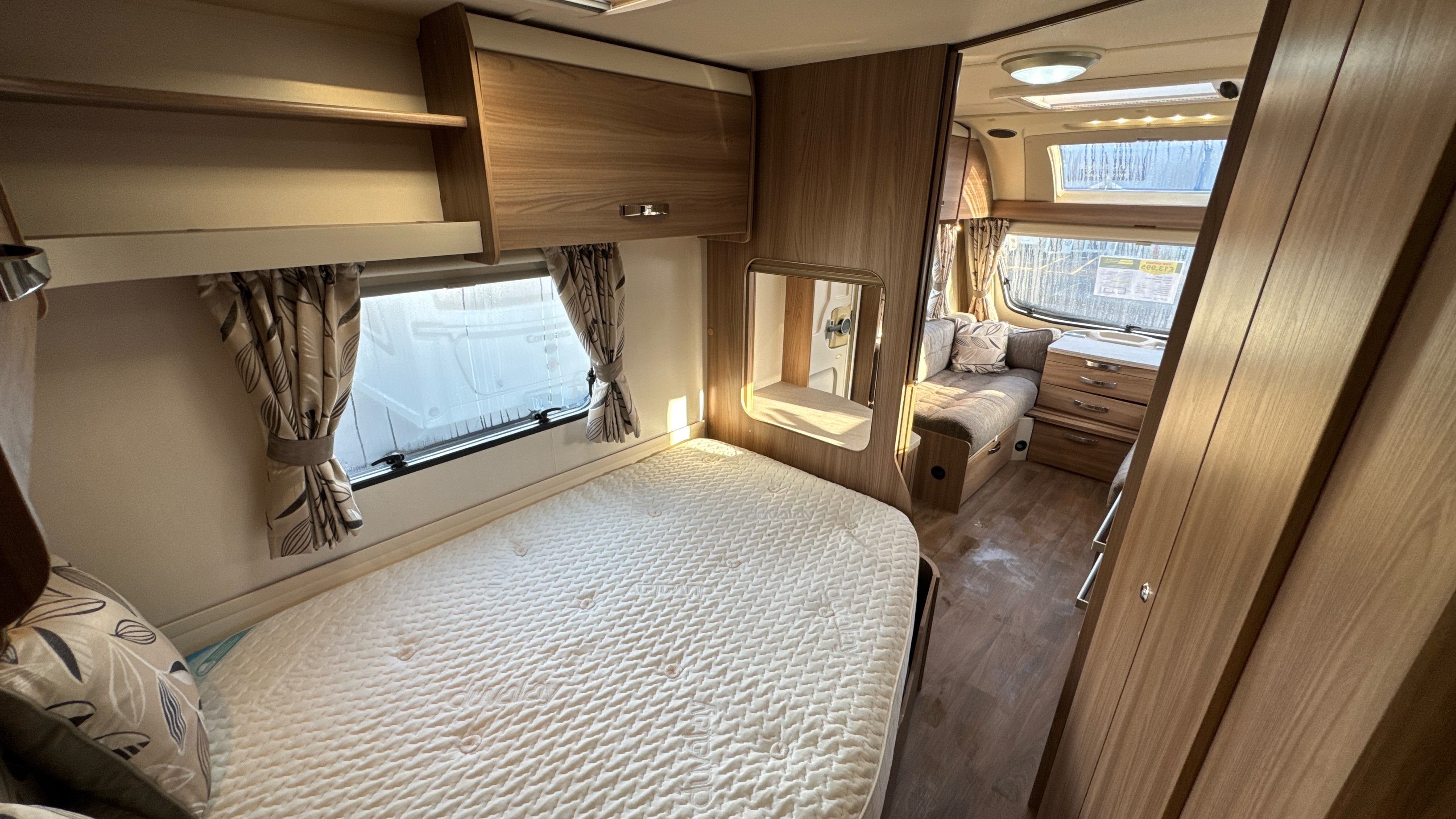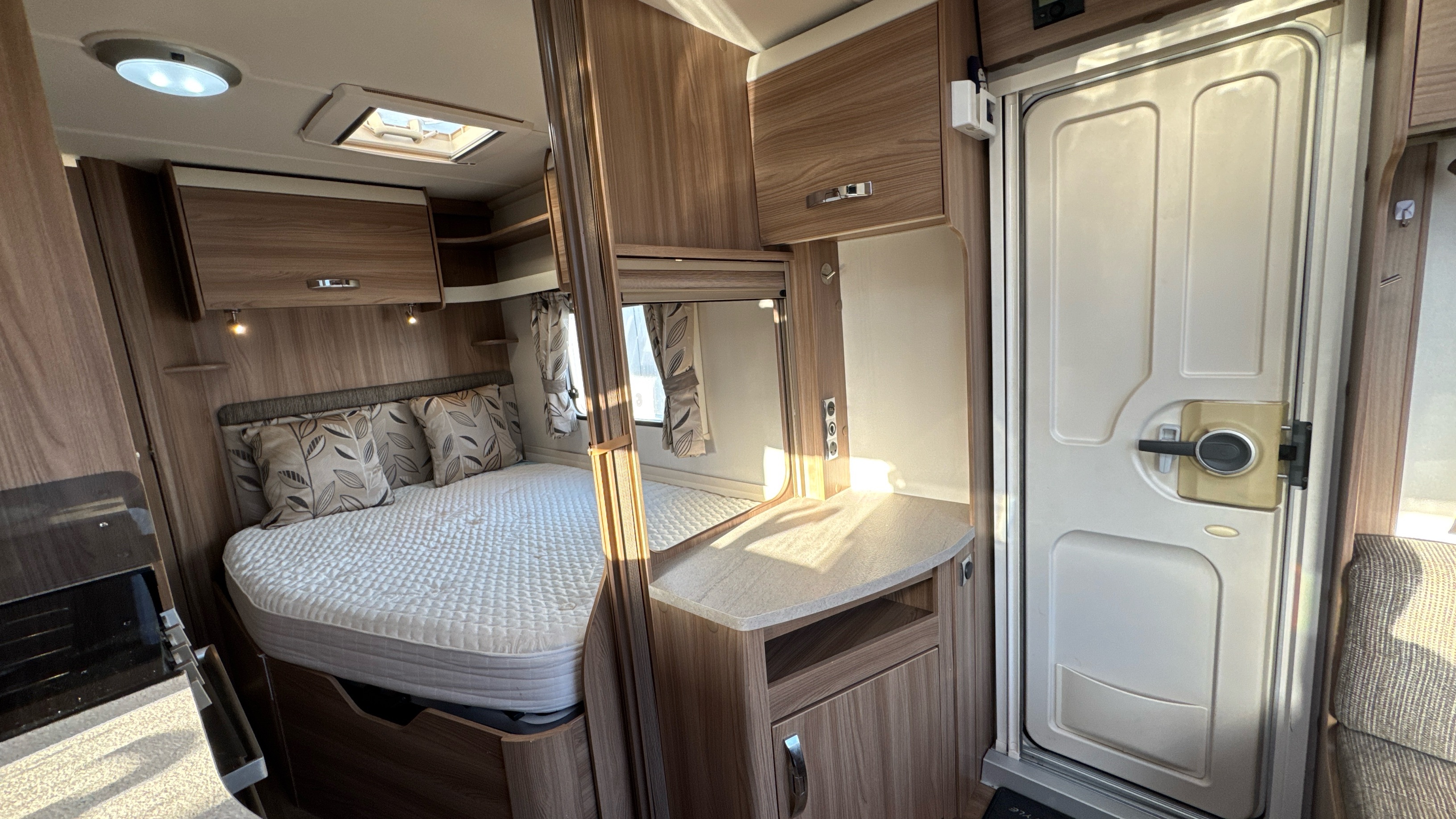 Fantastic layout features a dedicated rear walk in washroom with separate walk in fully lined shower compartment, thetford cassette swivel toilet and recessed sink/vanity unit. Centrally located fixed side "french" bed with an abundance of over head storage locker space, Full height double door wardrobe and a domestic style high quality Duvalay mattress to ensure a peaceful and comfortable nights rest.