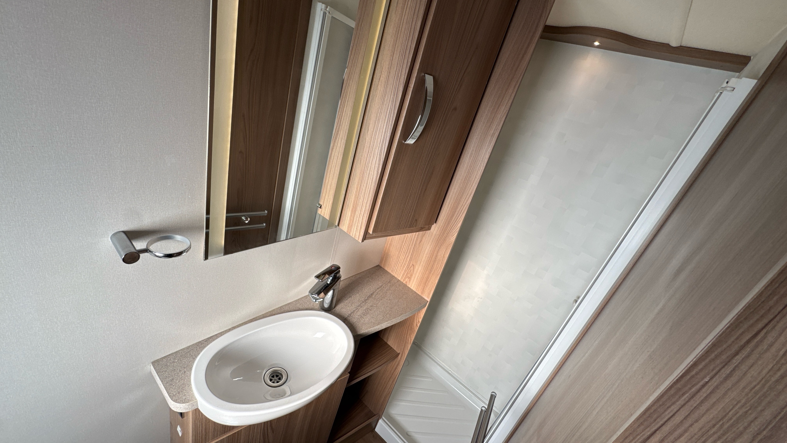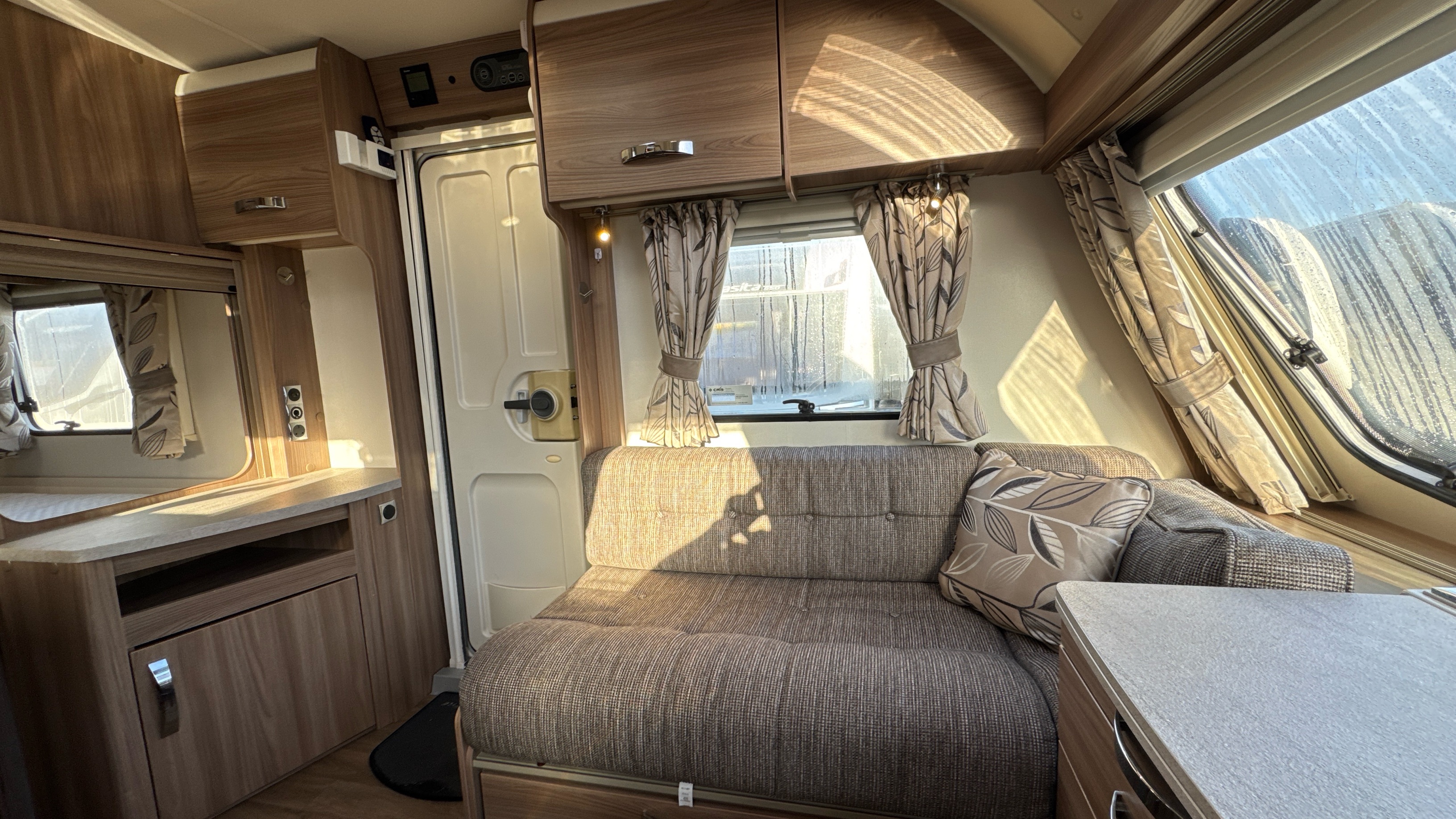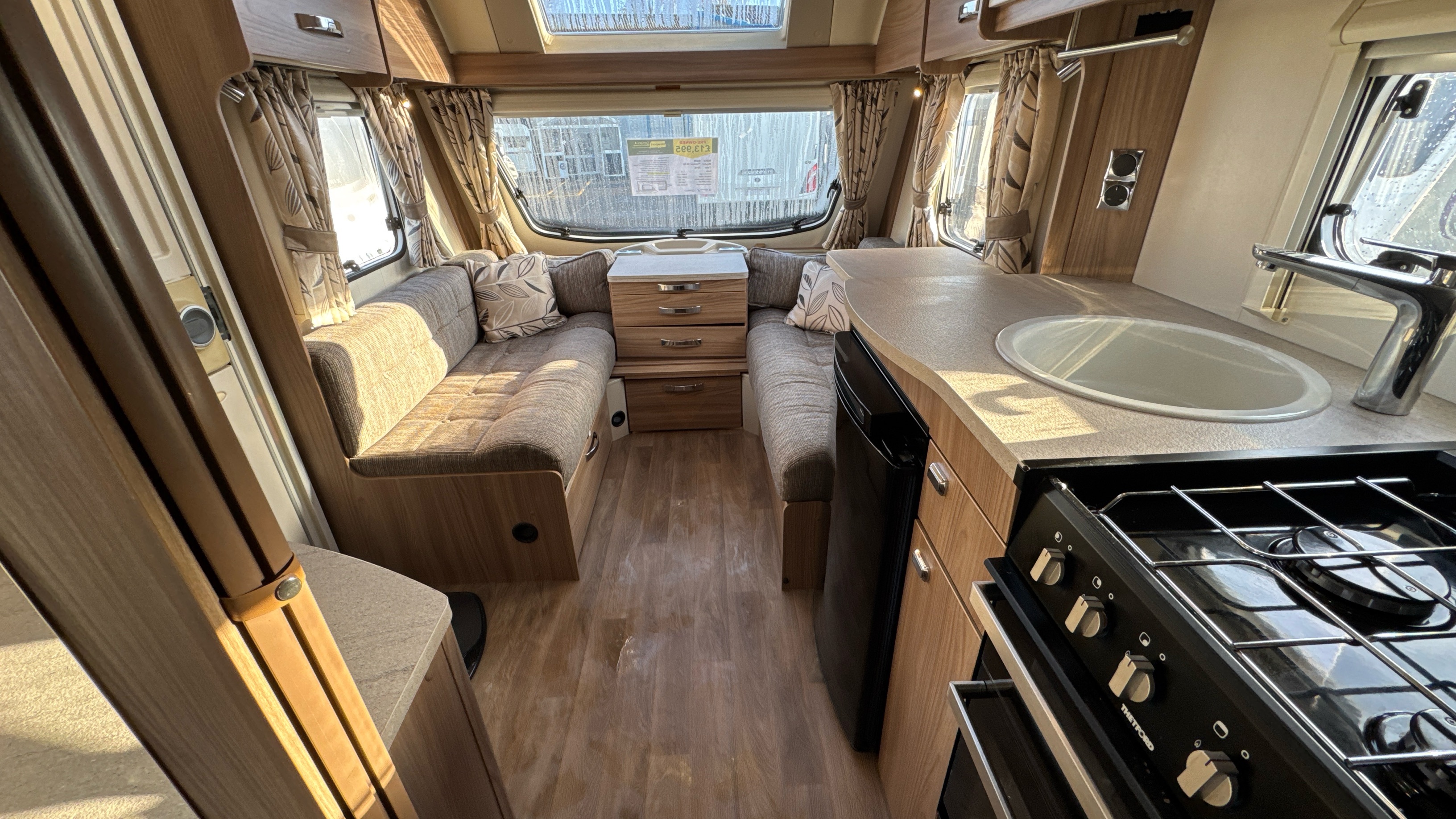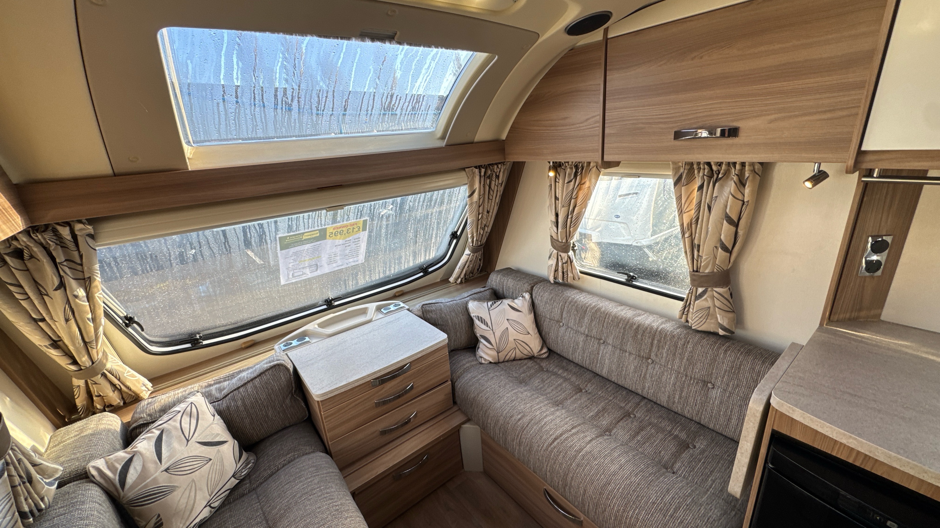 Fantastic layout features a dedicated rear walk in washroom with separate walk in fully lined shower compartment, thetford cassette swivel toilet and recessed sink/vanity unit. Centrally located fixed side "french" bed with an abundance of over head storage locker space, Full height double door wardrobe and a domestic style high quality Duvalay mattress to ensure a peaceful and comfortable nights rest.