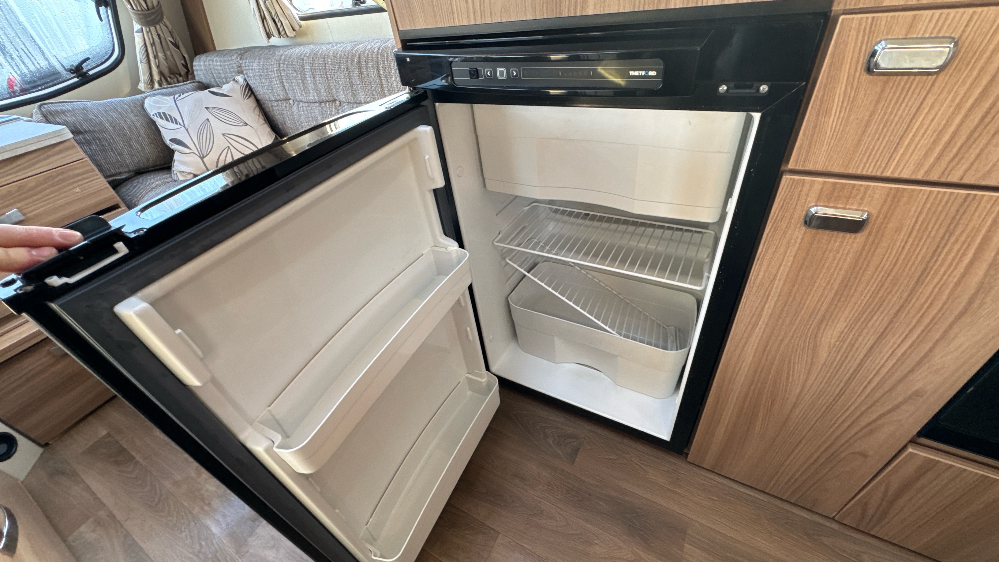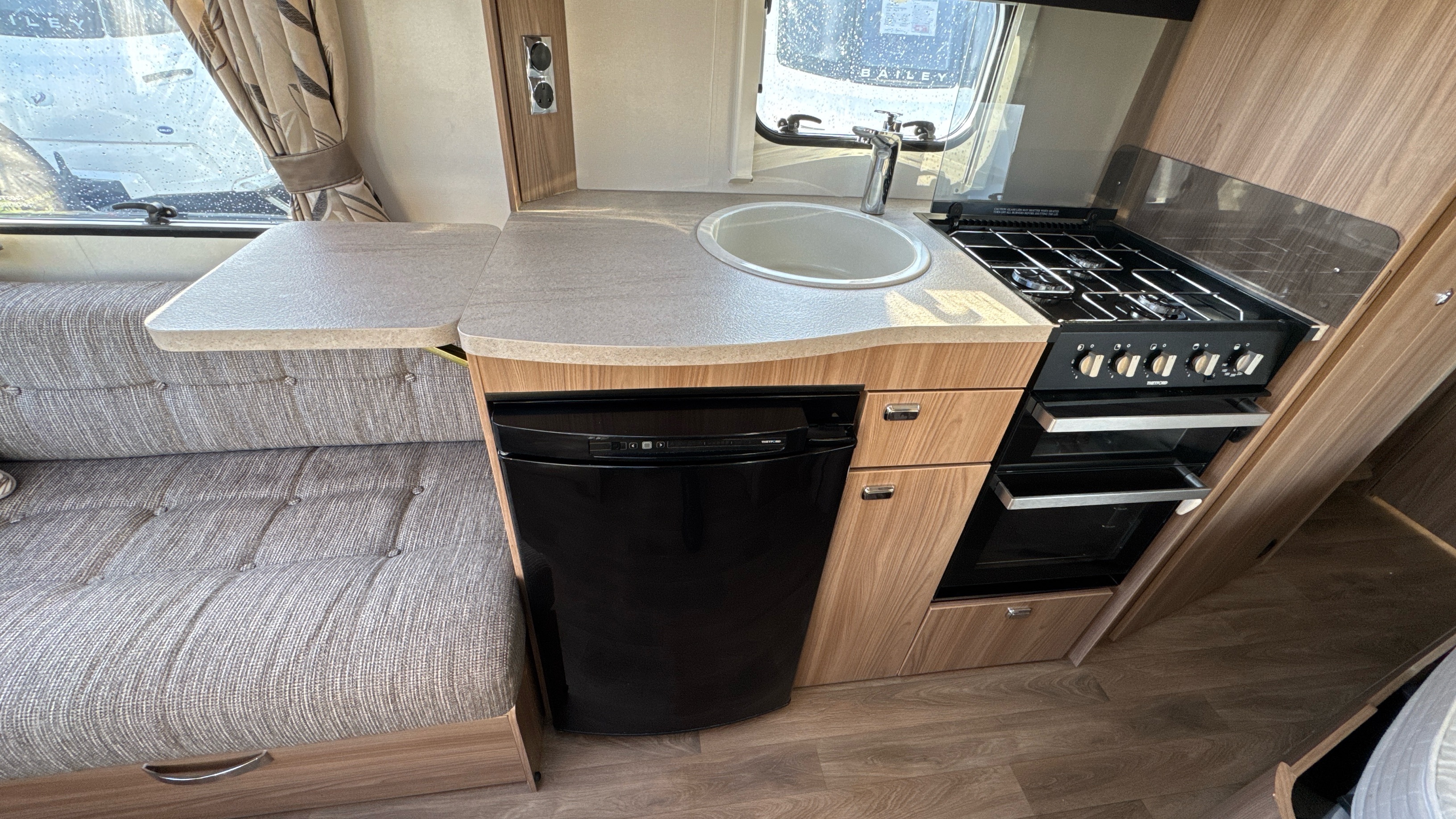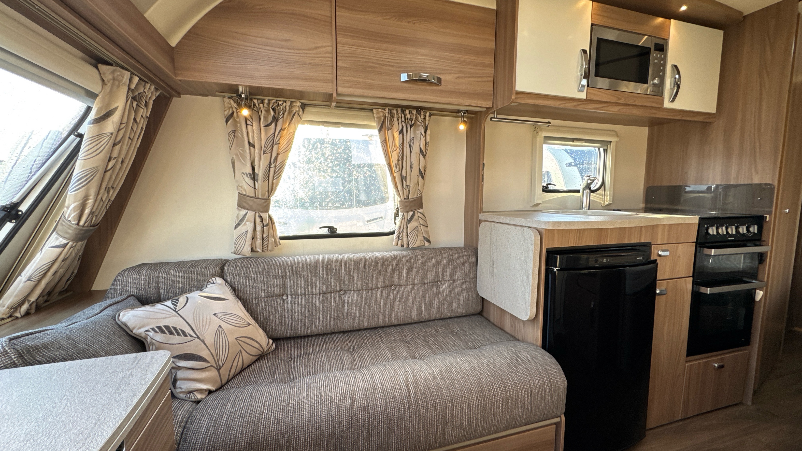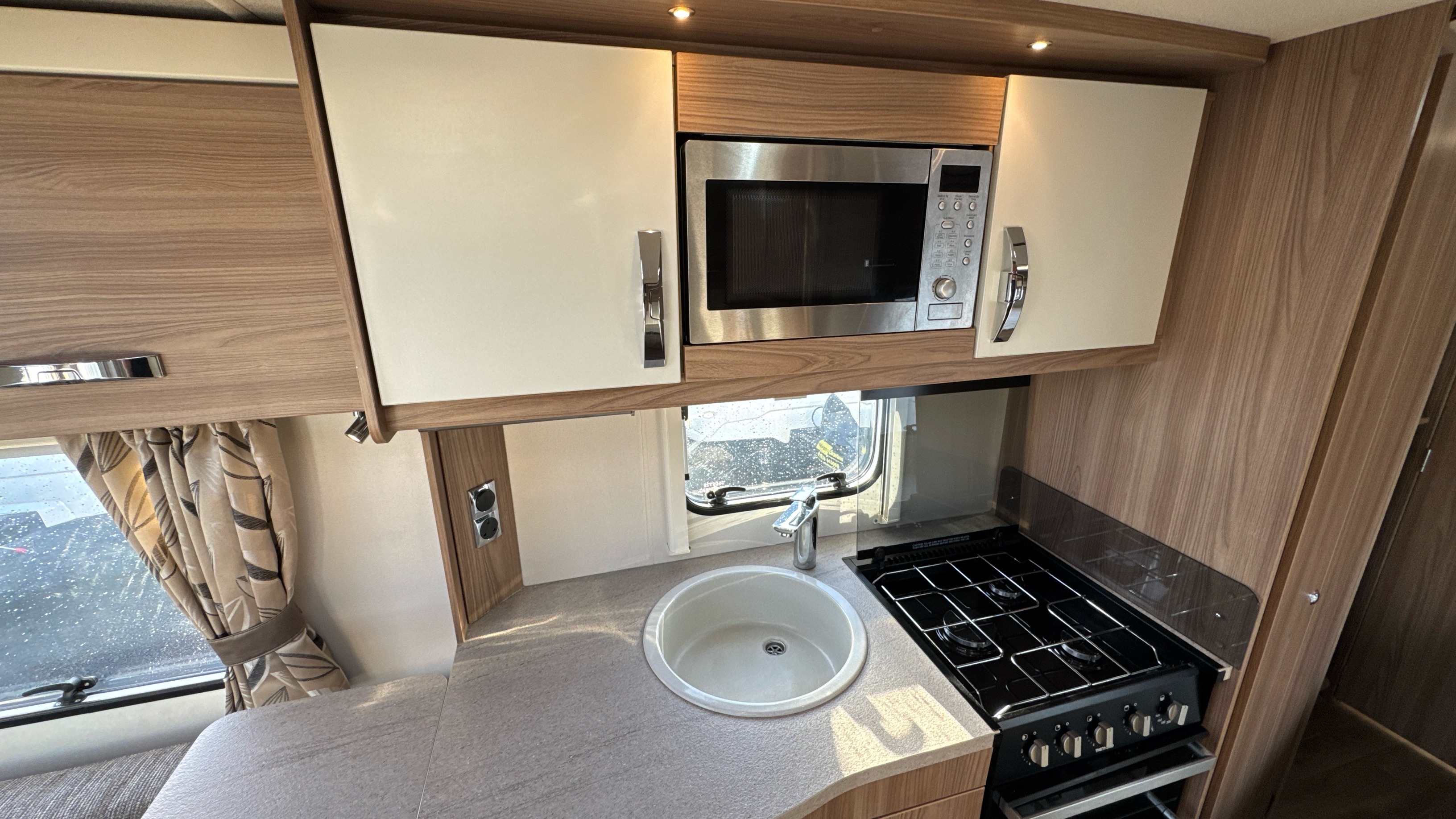 Centre kitchen is ideal for any budding Jamie Oliver's or Mary Berry's and features a domestic style gas oven/grill/3 burner hob with foldable glass worktop lid, recessed sink with clip on draining board and modern chrome hot and cold mixer tap, factory fitted brushed aluminium microwave in its own dedicated housing and a thetford 3-way fridge with small freezer compartment.