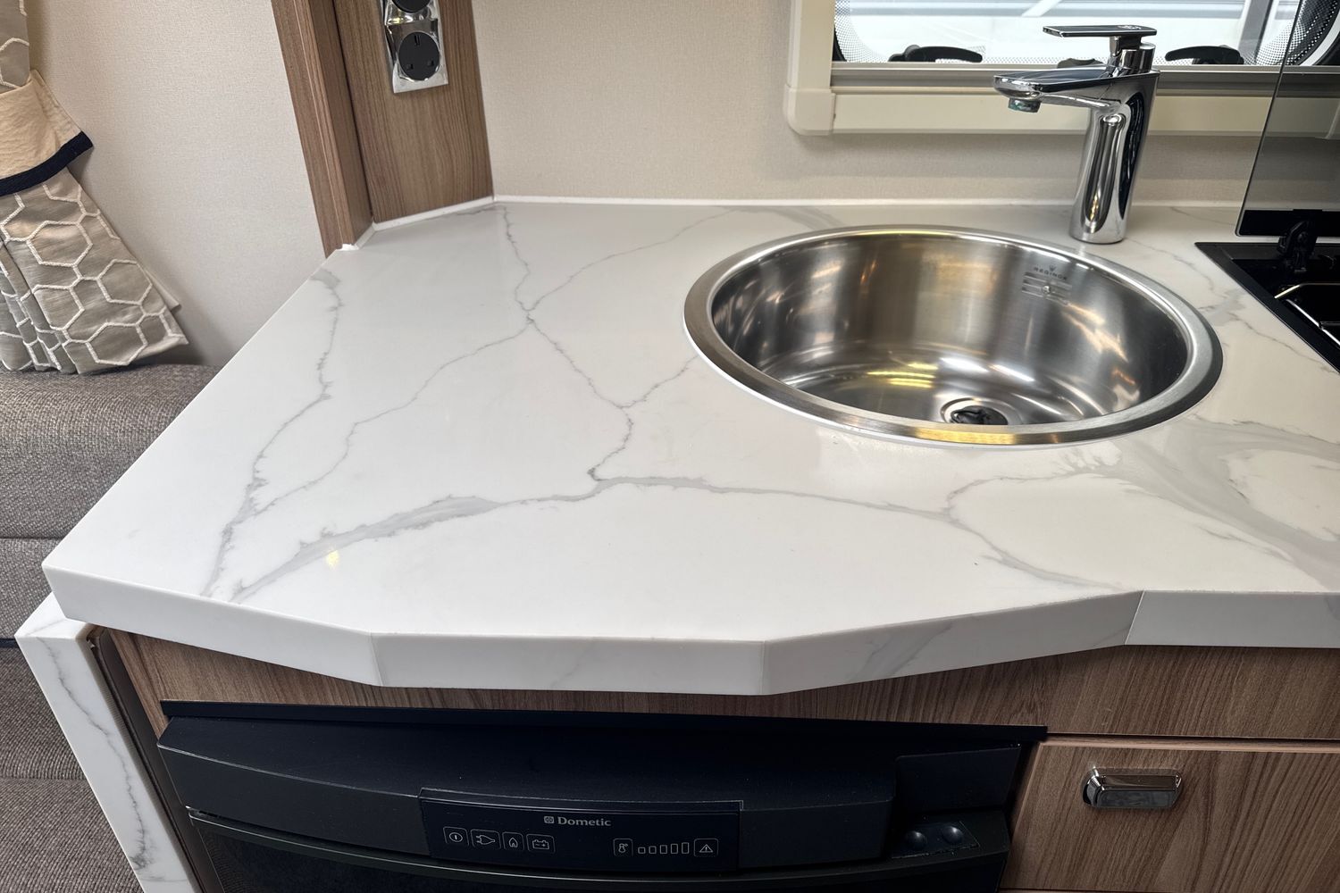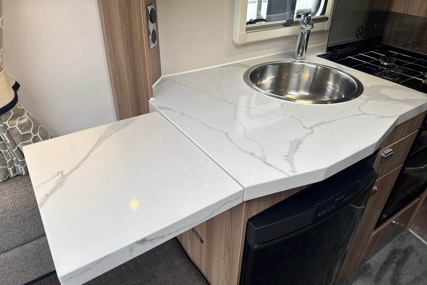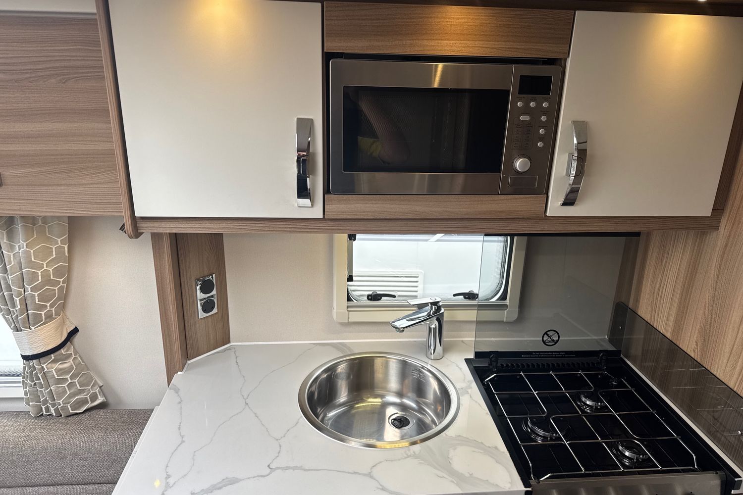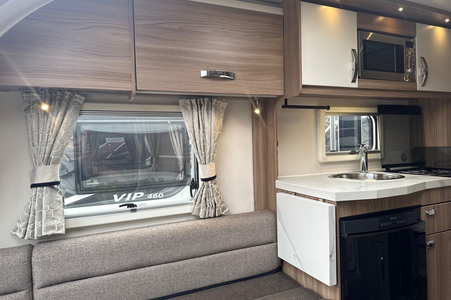 Well appointed centrally located kitchen area has all the modern amenities such as domestic style gas oven/grill/hob, recessed aluminium washing up sink with chrome hot and cold mixer tap, factory fitted microwave, 3-way gloss black fronted fridge with integral freezer compartment plus the previous owner has upgraded the worktops and worksurfaces with a composite marble look topper.