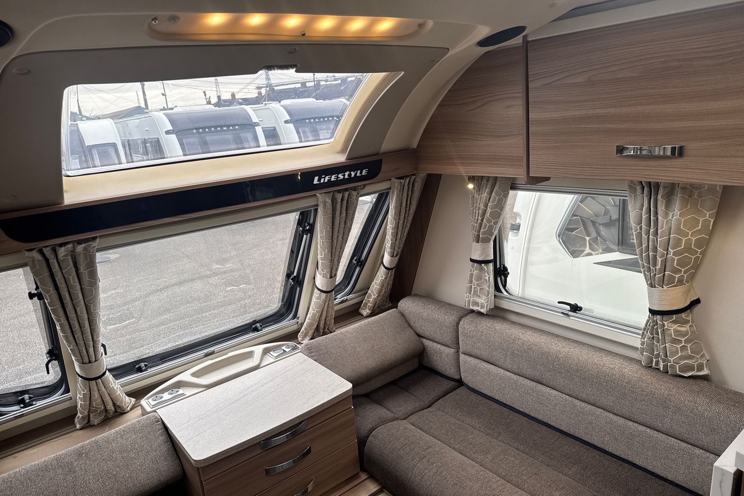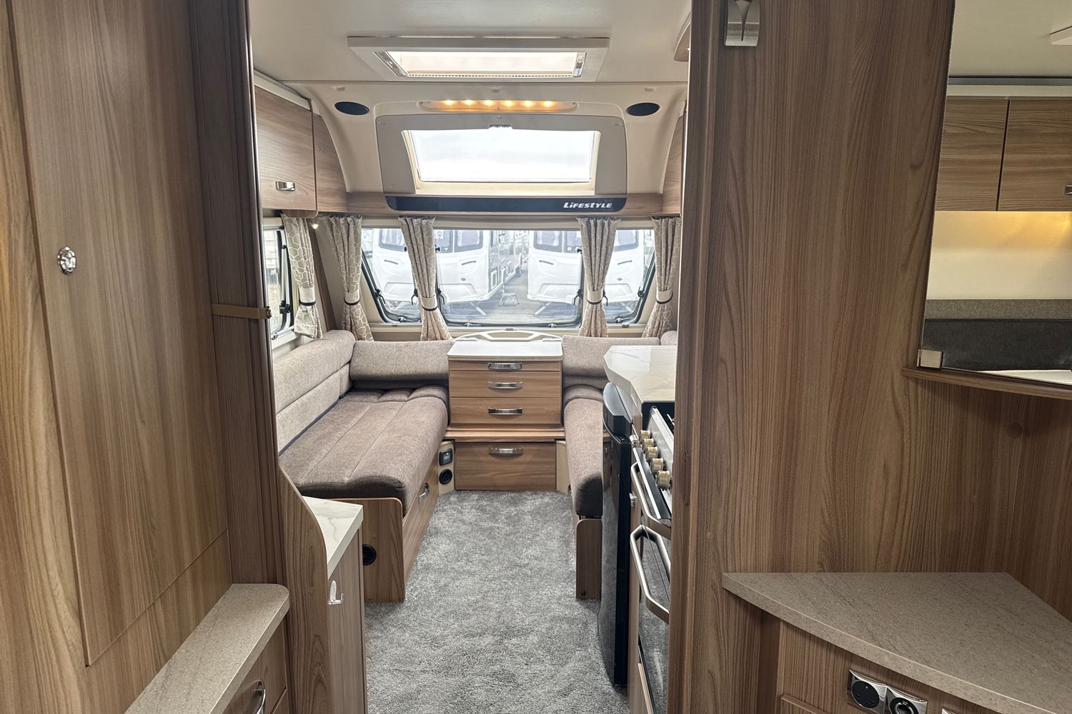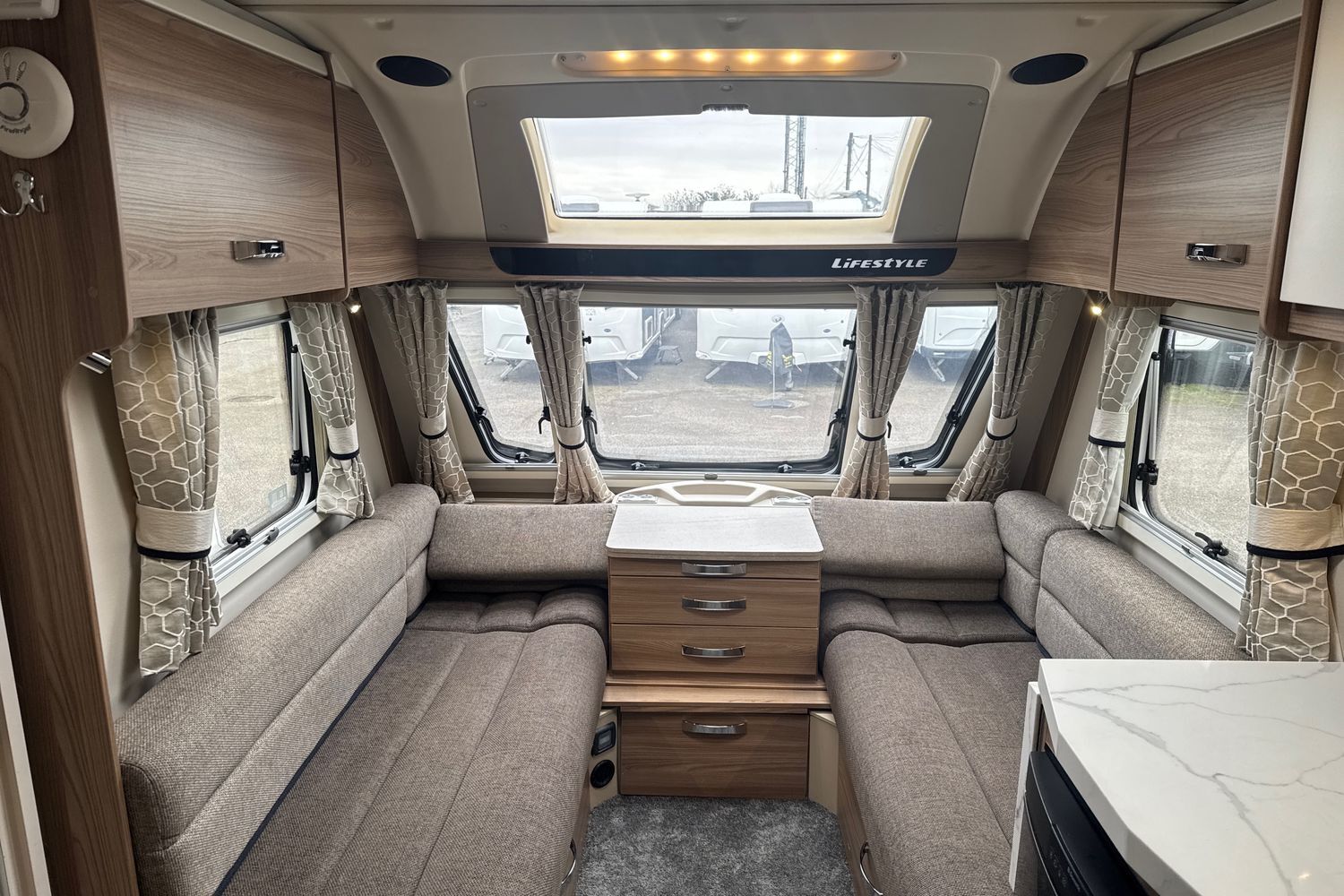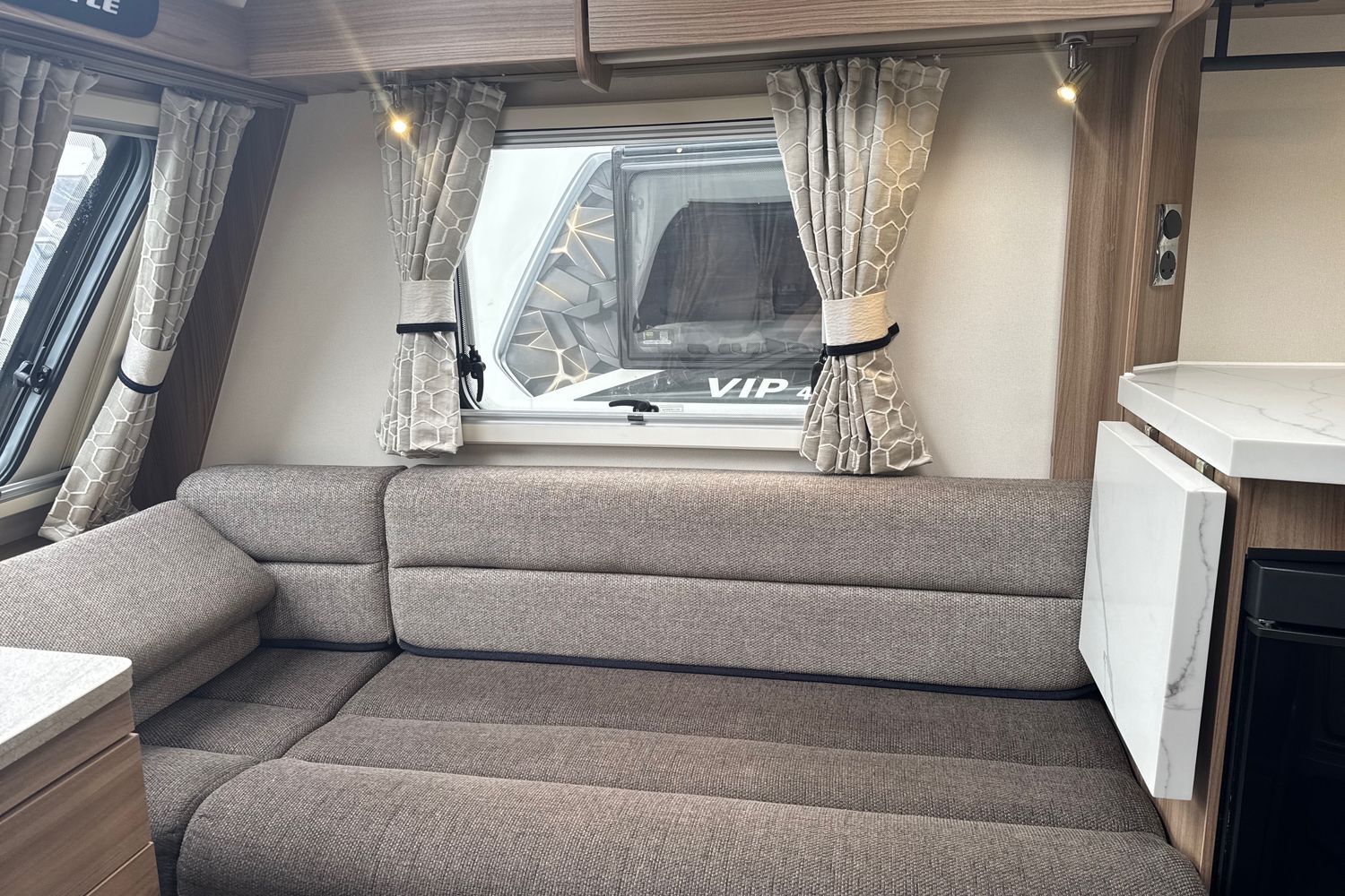 Parallel front lounge arrangement which easily converts into a large double bed, panoramic front sunroof which lets in generous amounts of daylight, pleated horex night blinds to name a few.