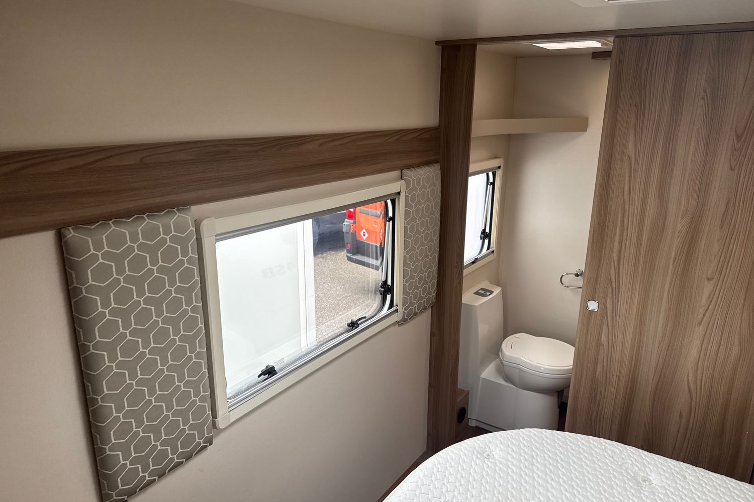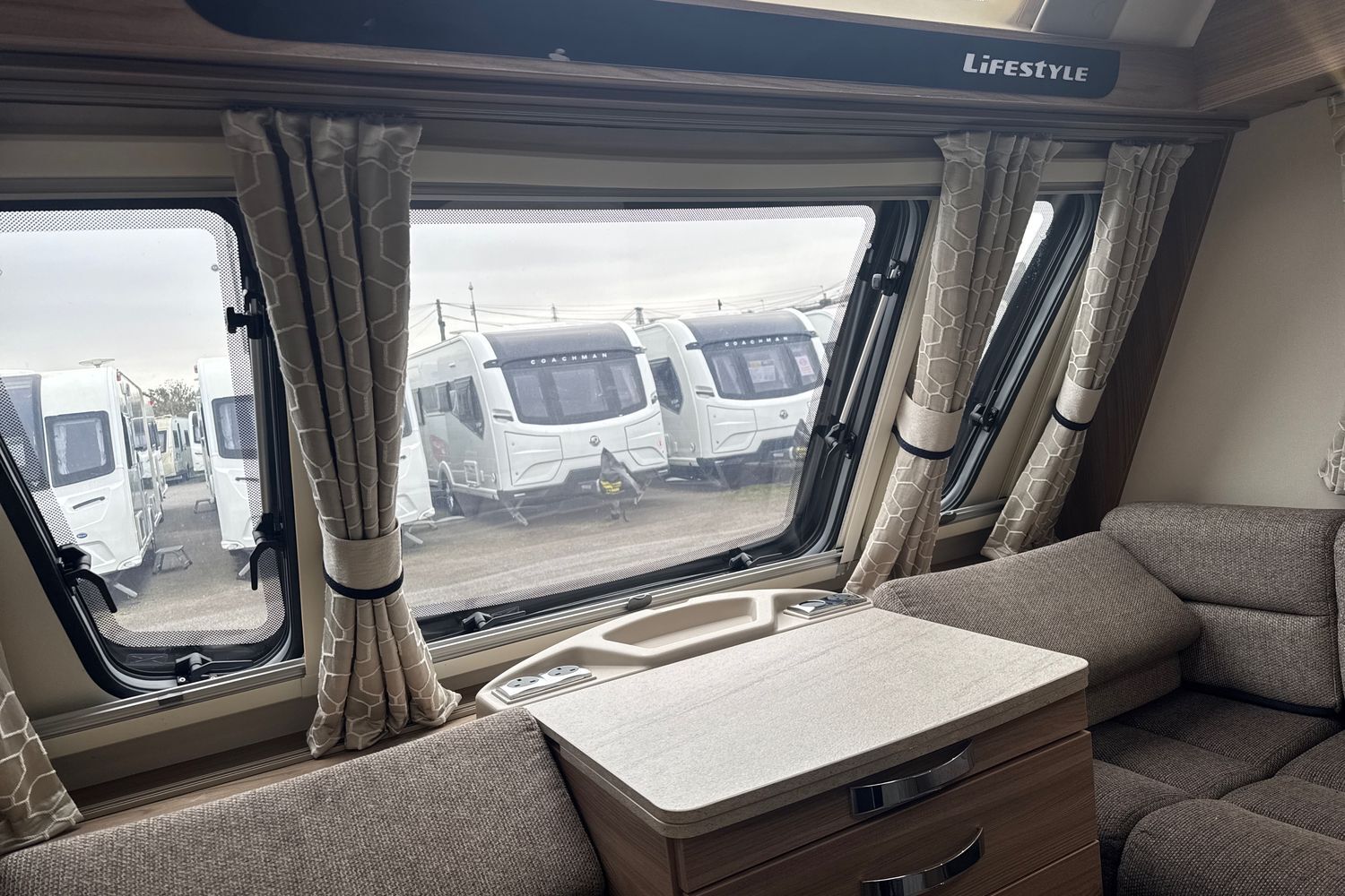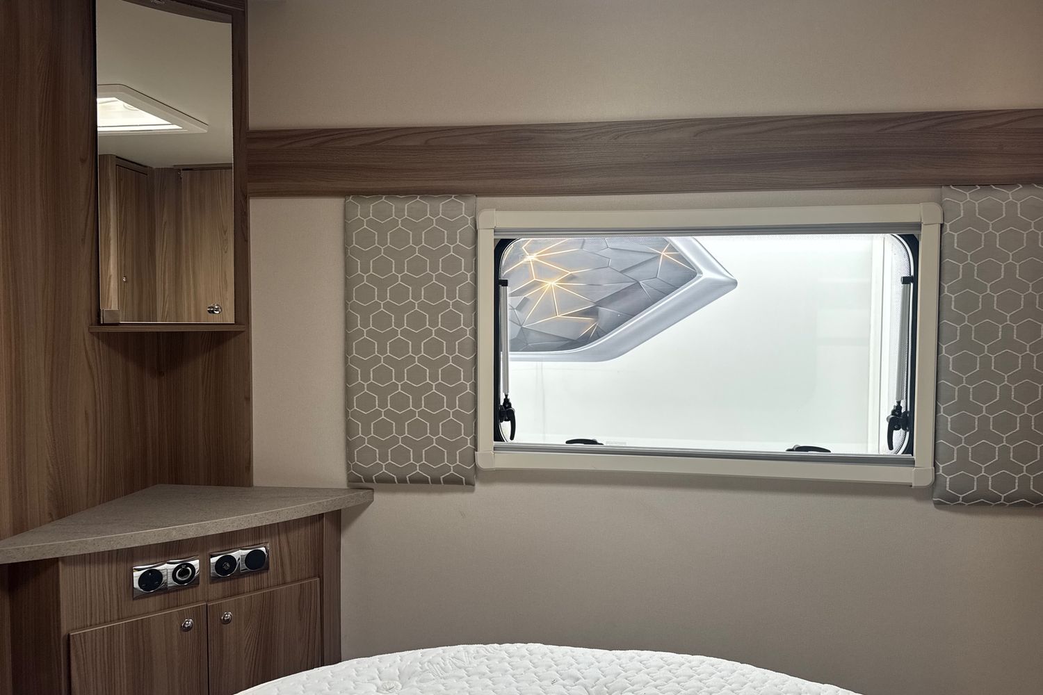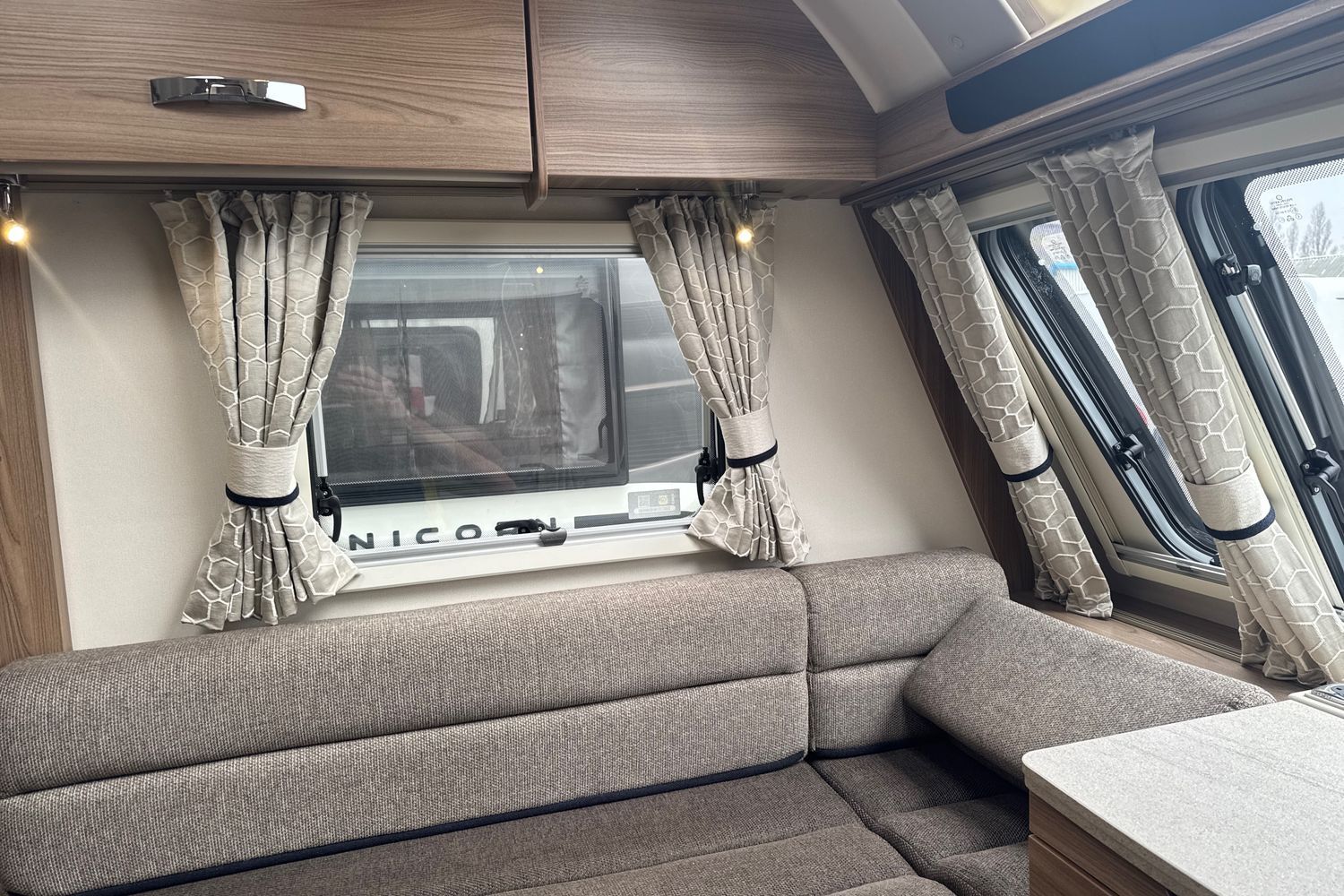 Parallel front lounge arrangement which easily converts into a large double bed, panoramic front sunroof which lets in generous amounts of daylight, pleated horex night blinds to name a few.