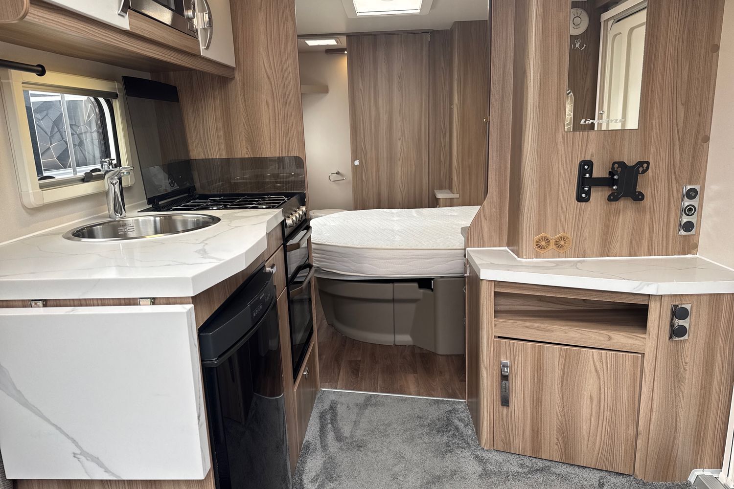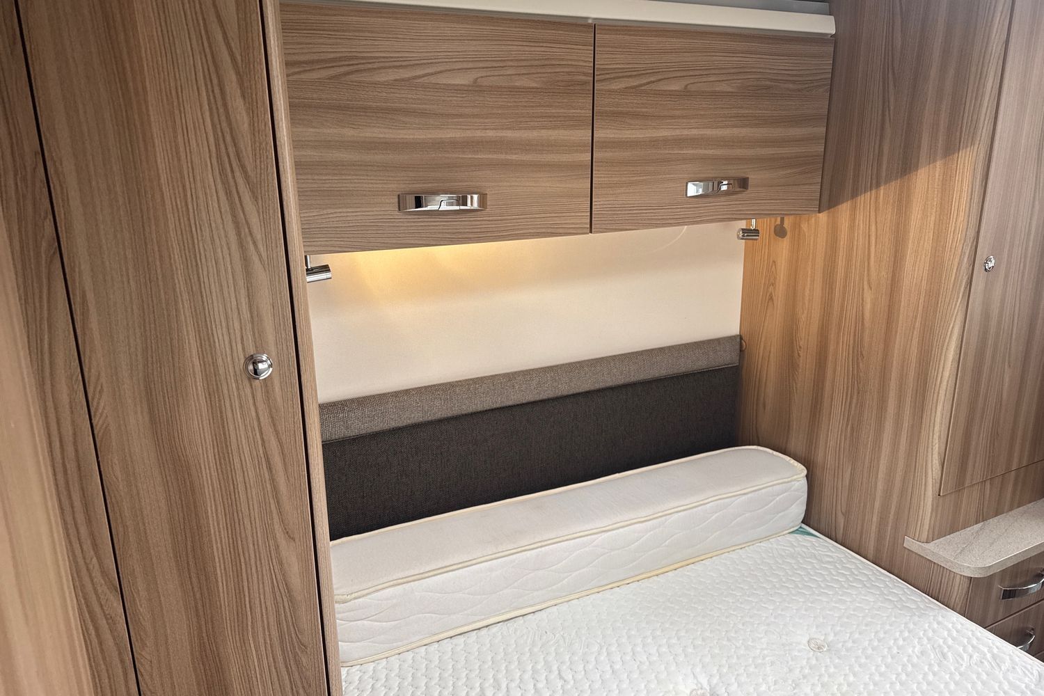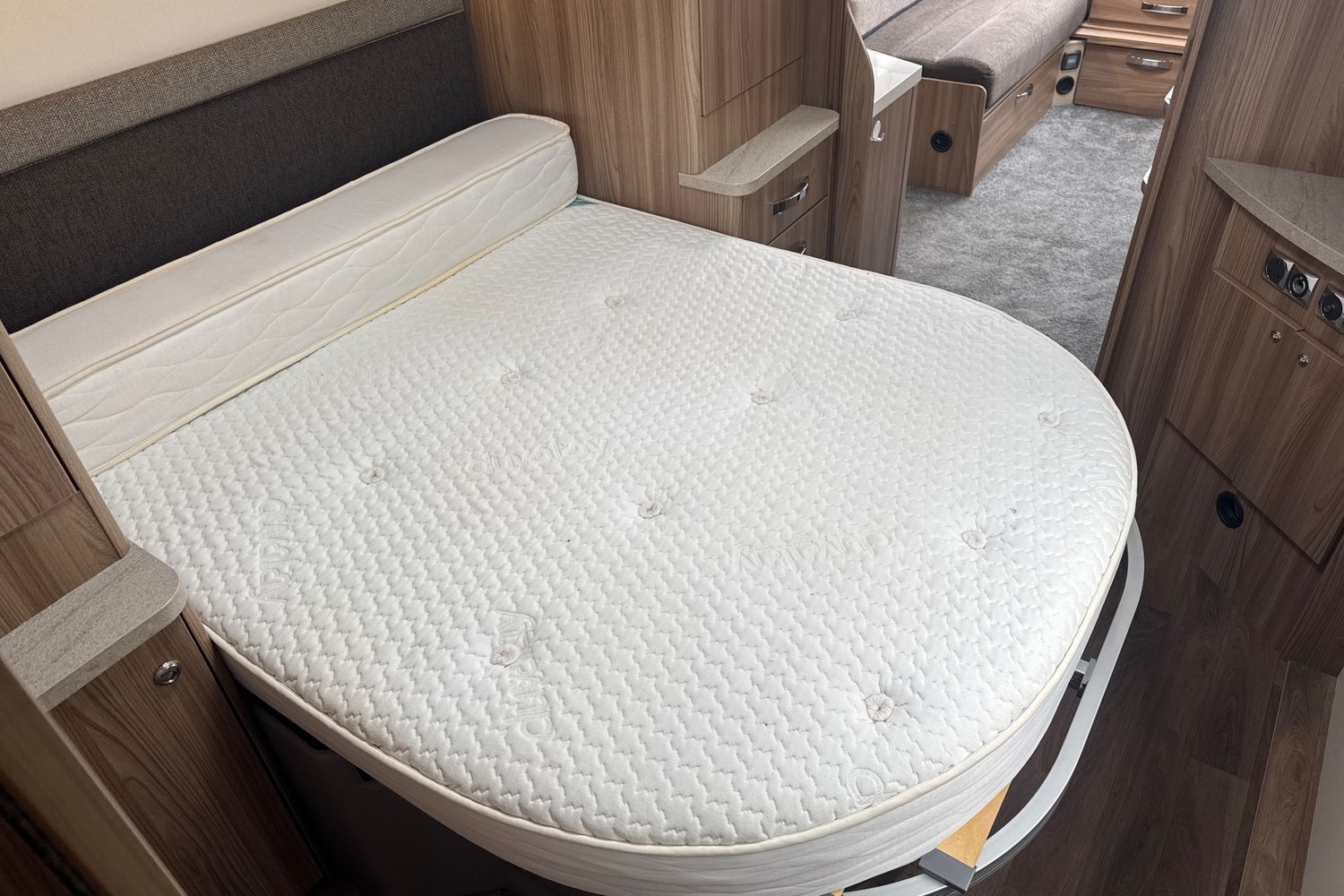 Transverse double fixed island bed complete with original Duvalite Duvalay domestic style mattress. Acres of under bed storage and bed retracts 500mm during the daytime giving a greater floor area and easier access to the rear washroom. Complimented with his 'n' hers wardrobes as well as an abundance of overhead storage lockers.