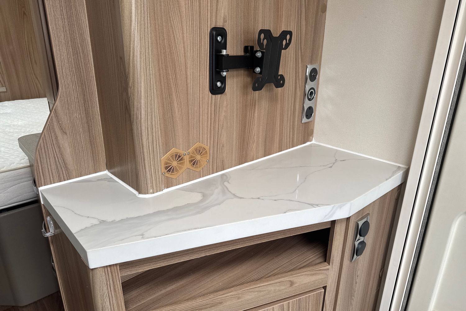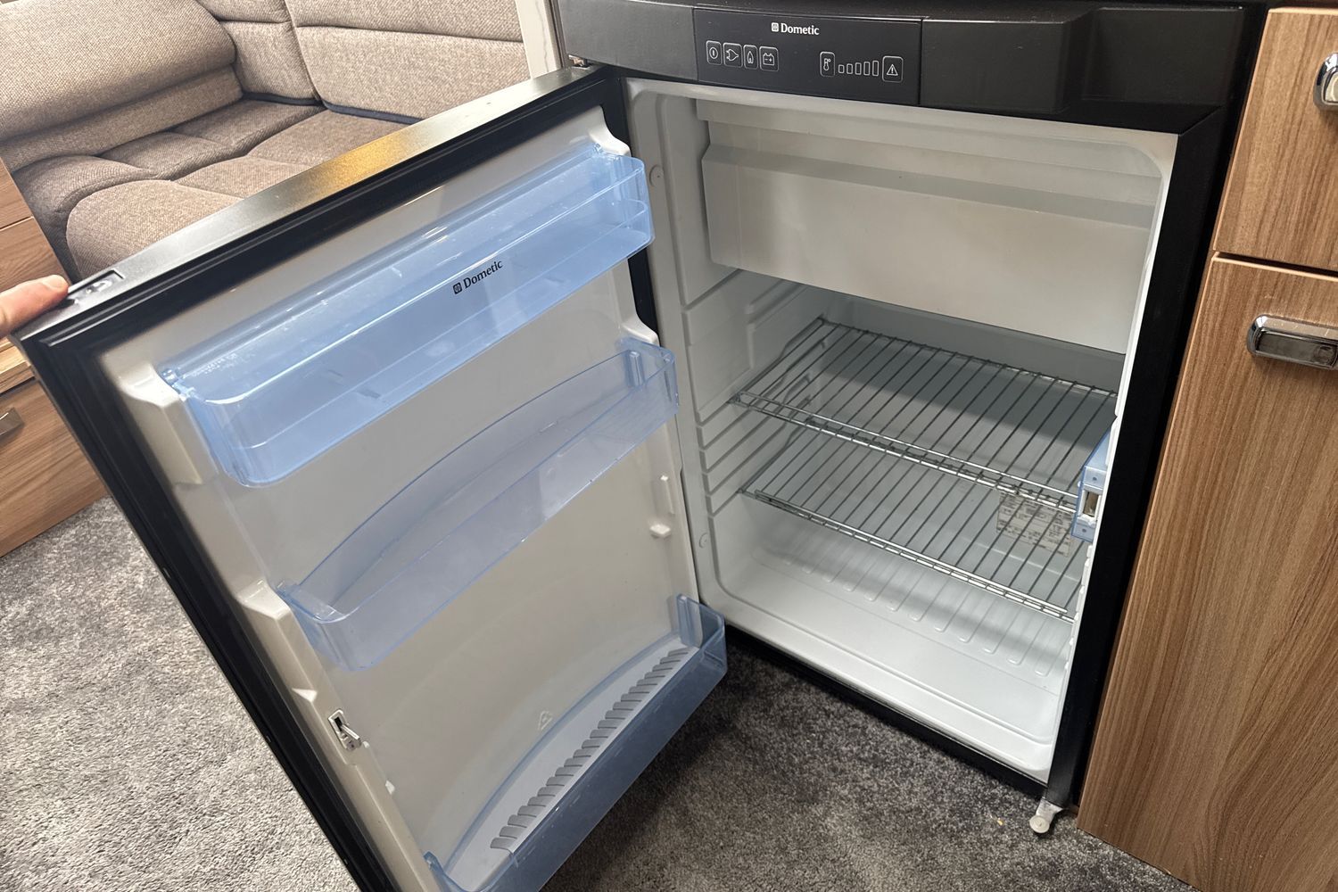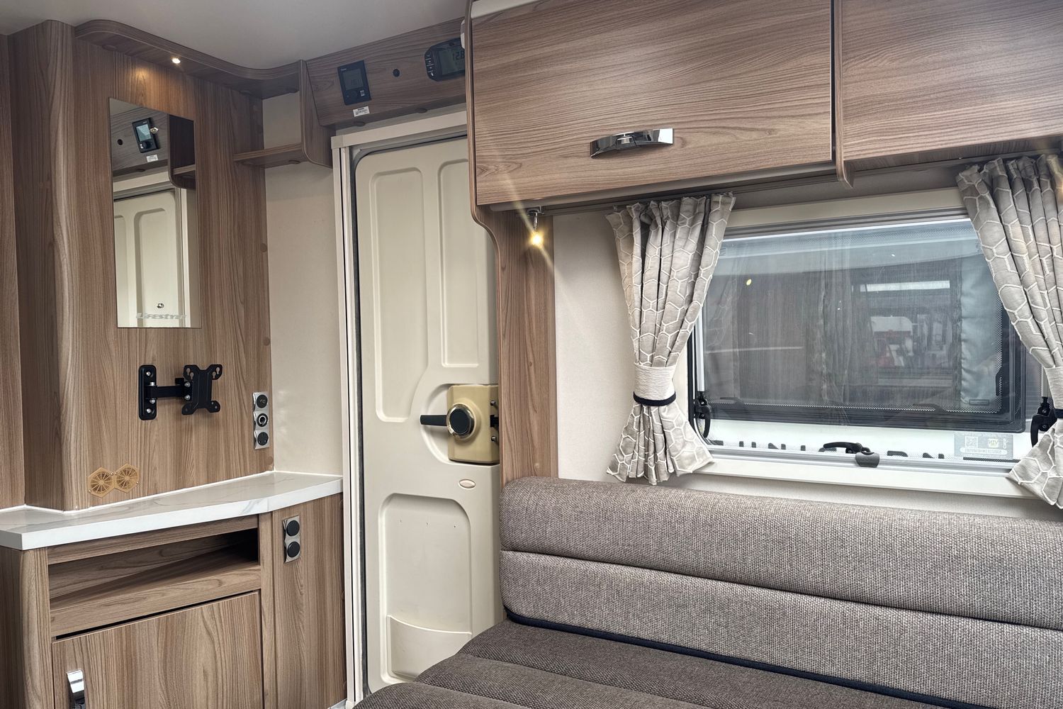 Transverse double fixed island bed complete with original Duvalite Duvalay domestic style mattress. Acres of under bed storage and bed retracts 500mm during the daytime giving a greater floor area and easier access to the rear washroom. Complimented with his 'n' hers wardrobes as well as an abundance of overhead storage lockers.