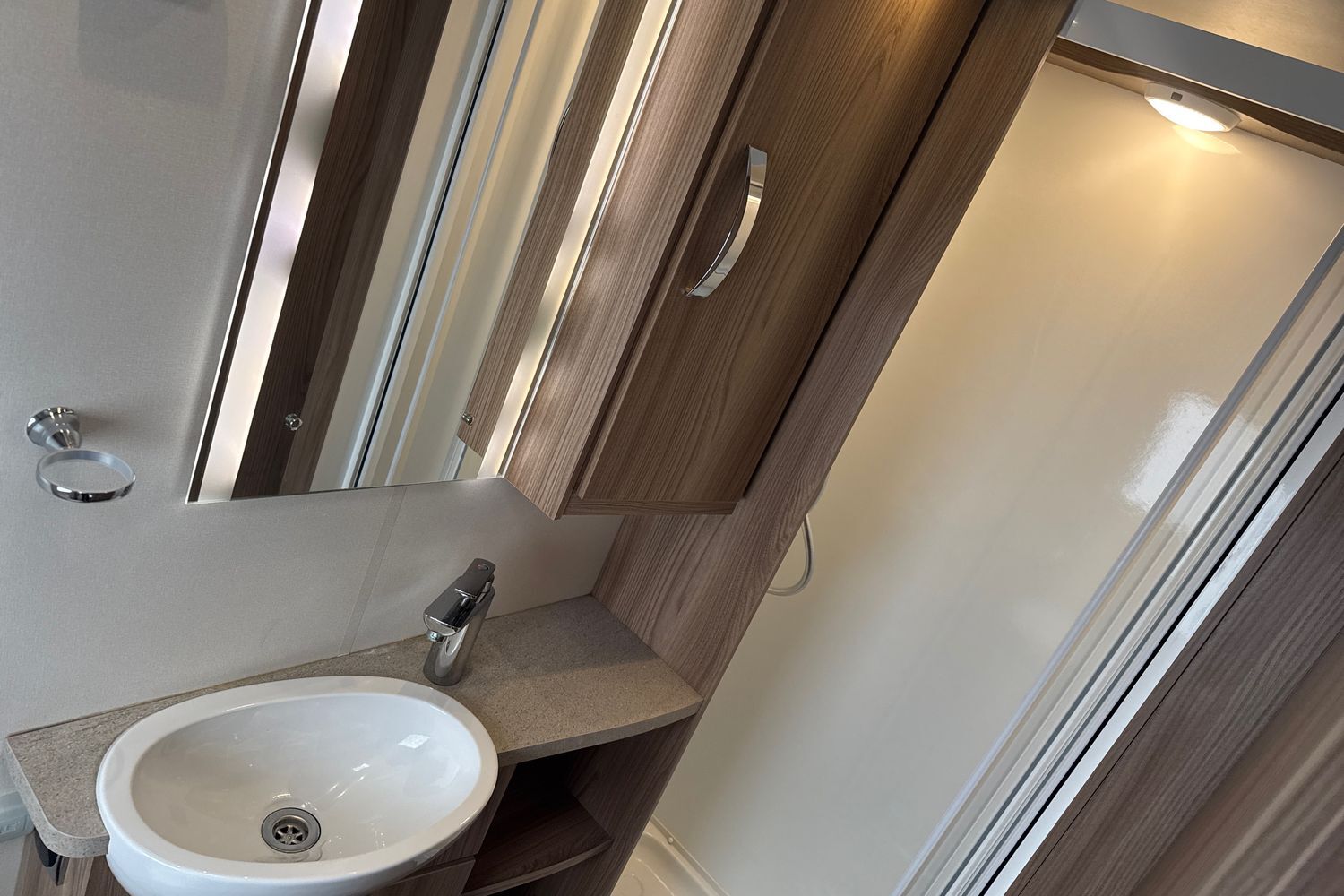 Layout consists of a dedicated rear full width washroom with large fully-lined walk in shower cubicle, sink and vanity unit with vanity mirror and thetford swivel cassette chemical toilet with electric flush operation.