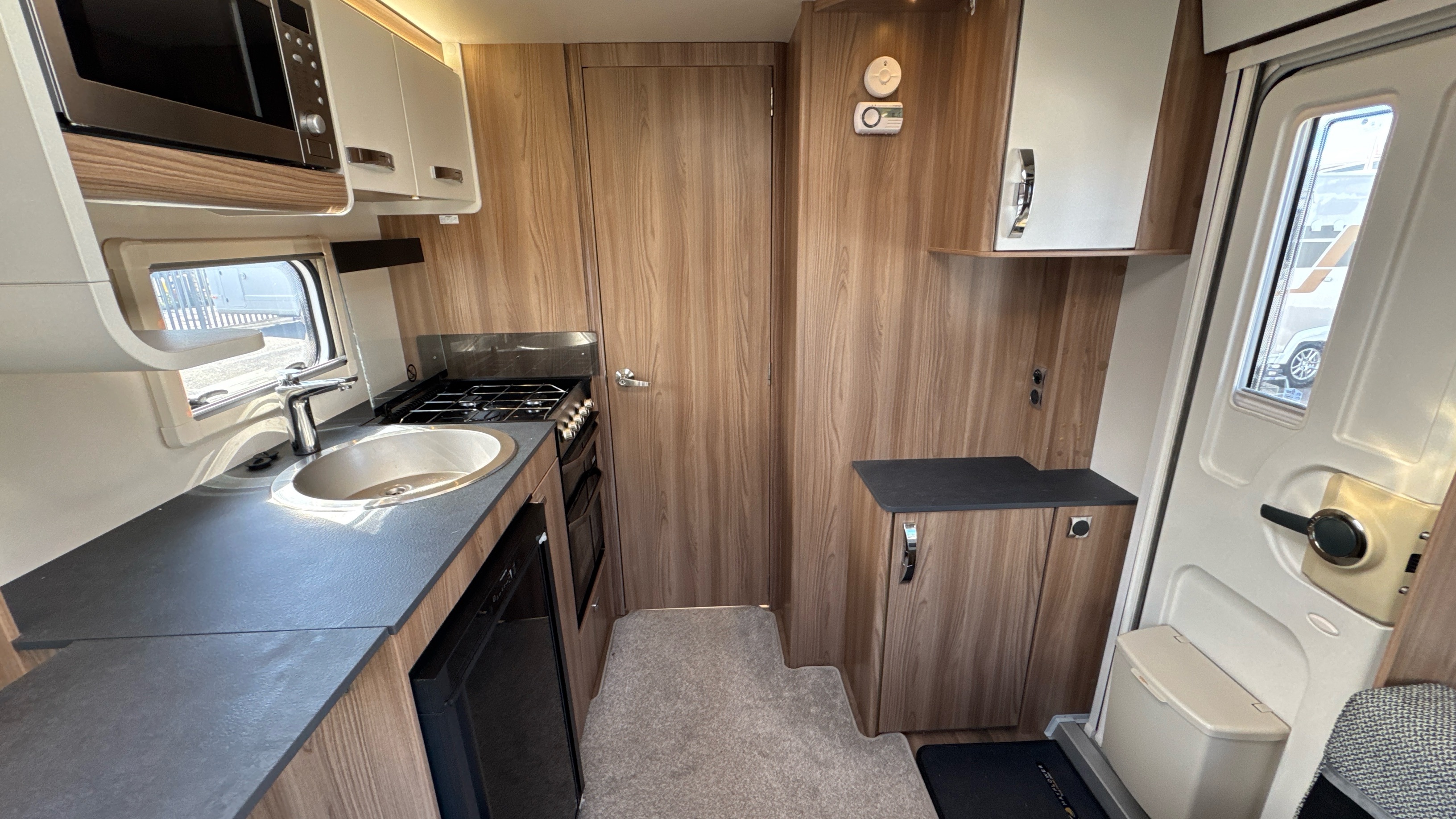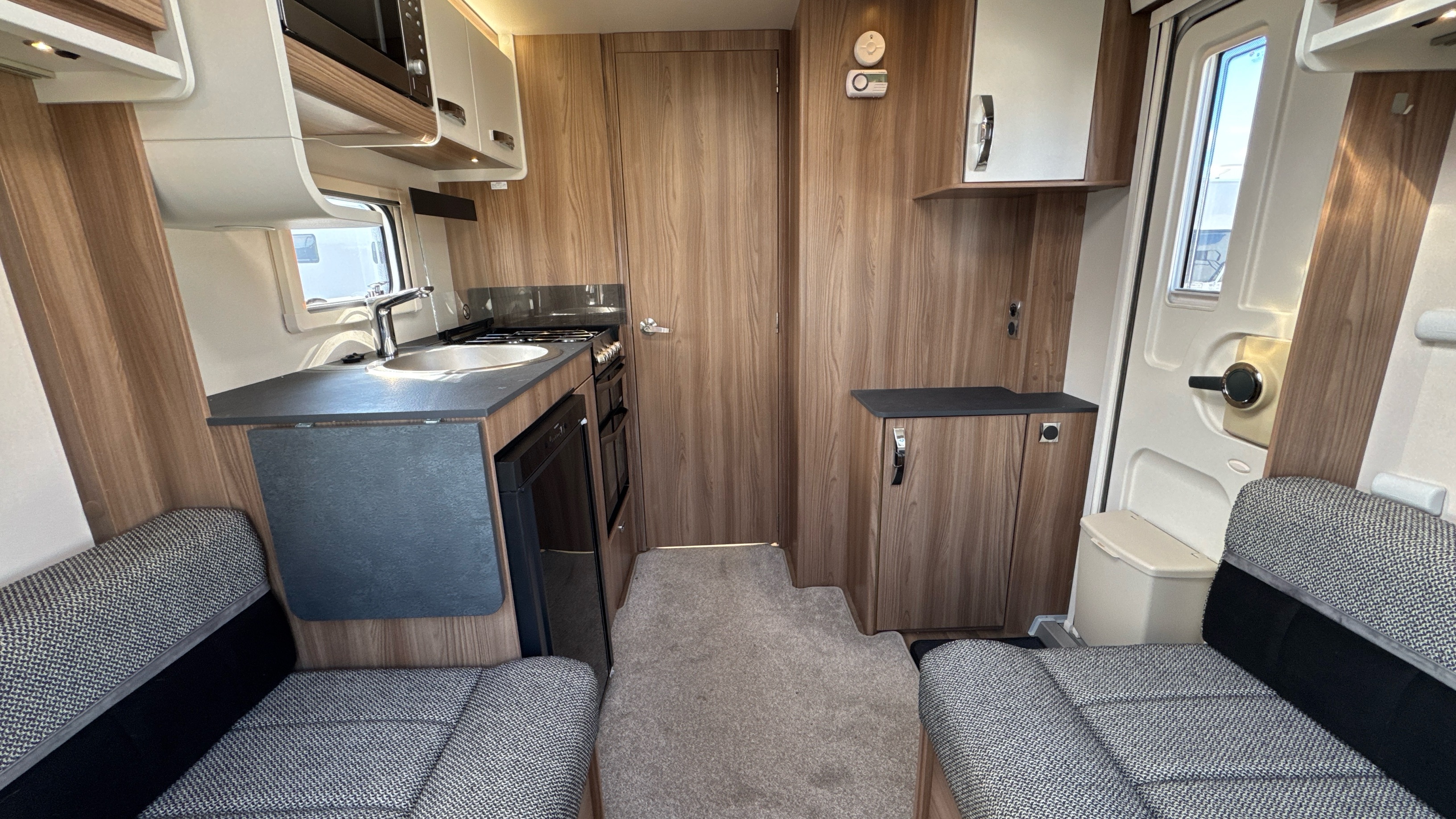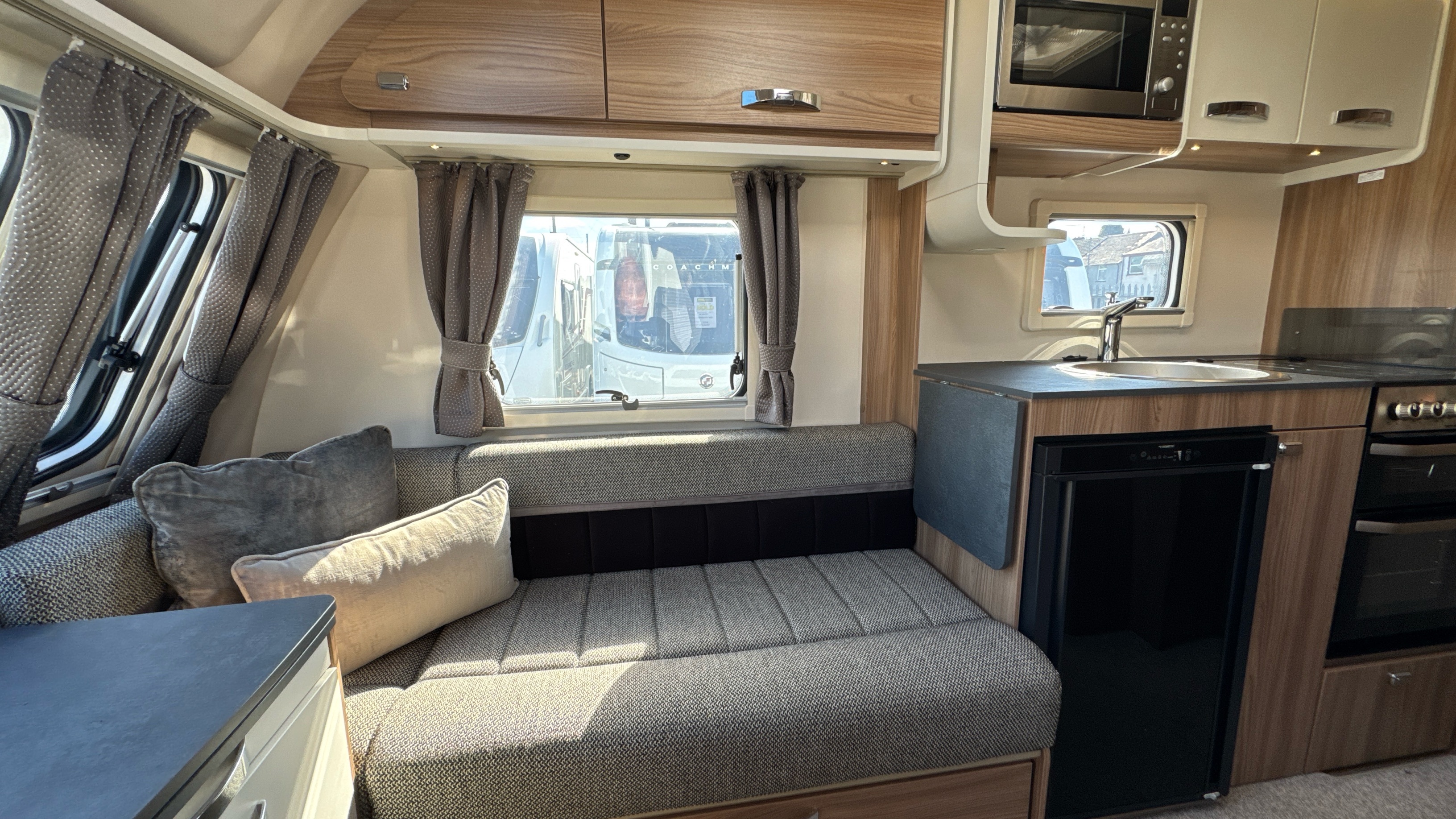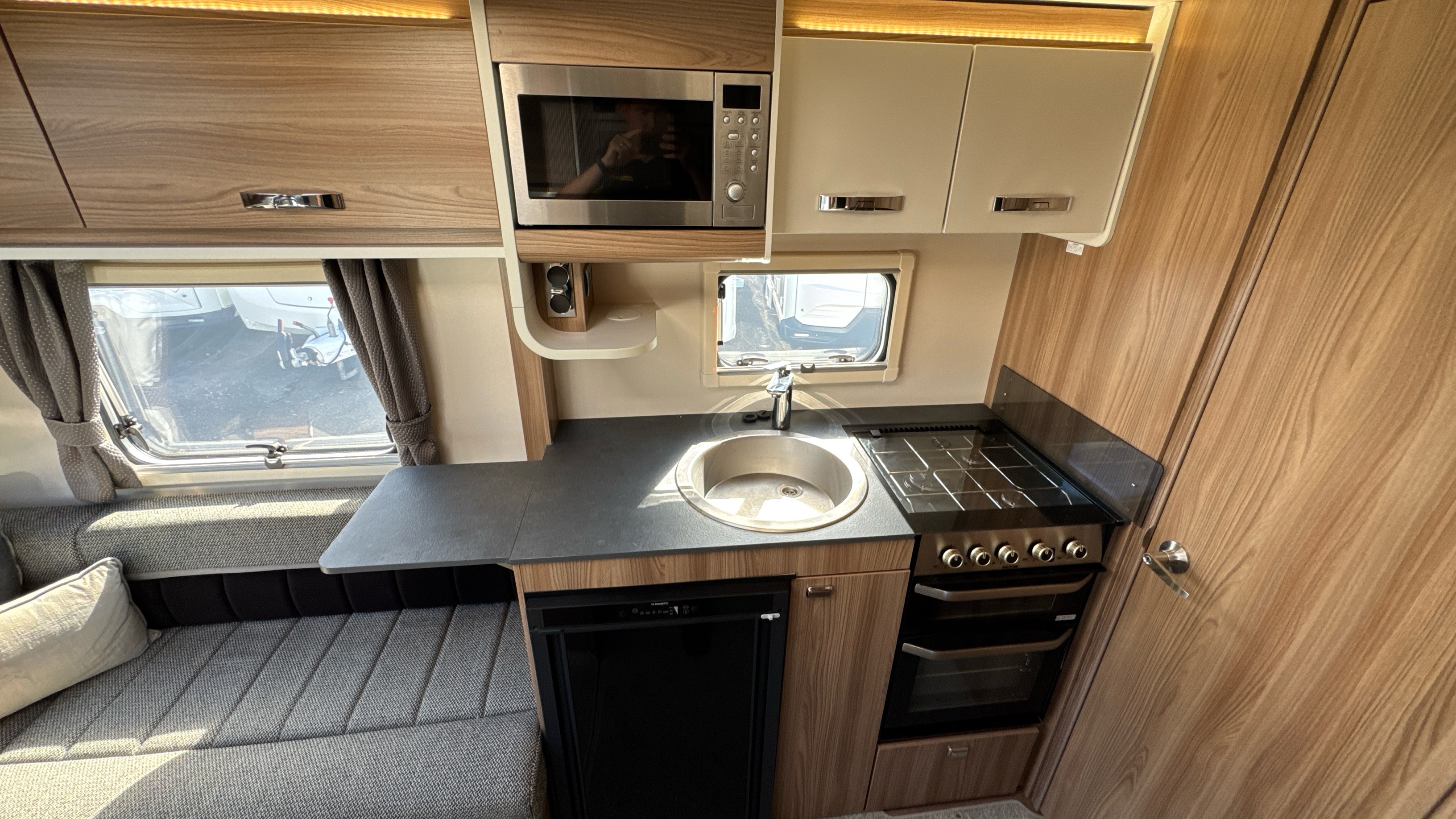 Well appointed and well equipped kitchen complate with thetford gas oven/grill and 3-burner hob with folding glass lid with gas safety shut-off, factory fitted microwave, 3-way gloss black fronted fridge with integral freezer compartment and recessed aluminium sink with clip on draining board and modern hot and cold mixer tap.