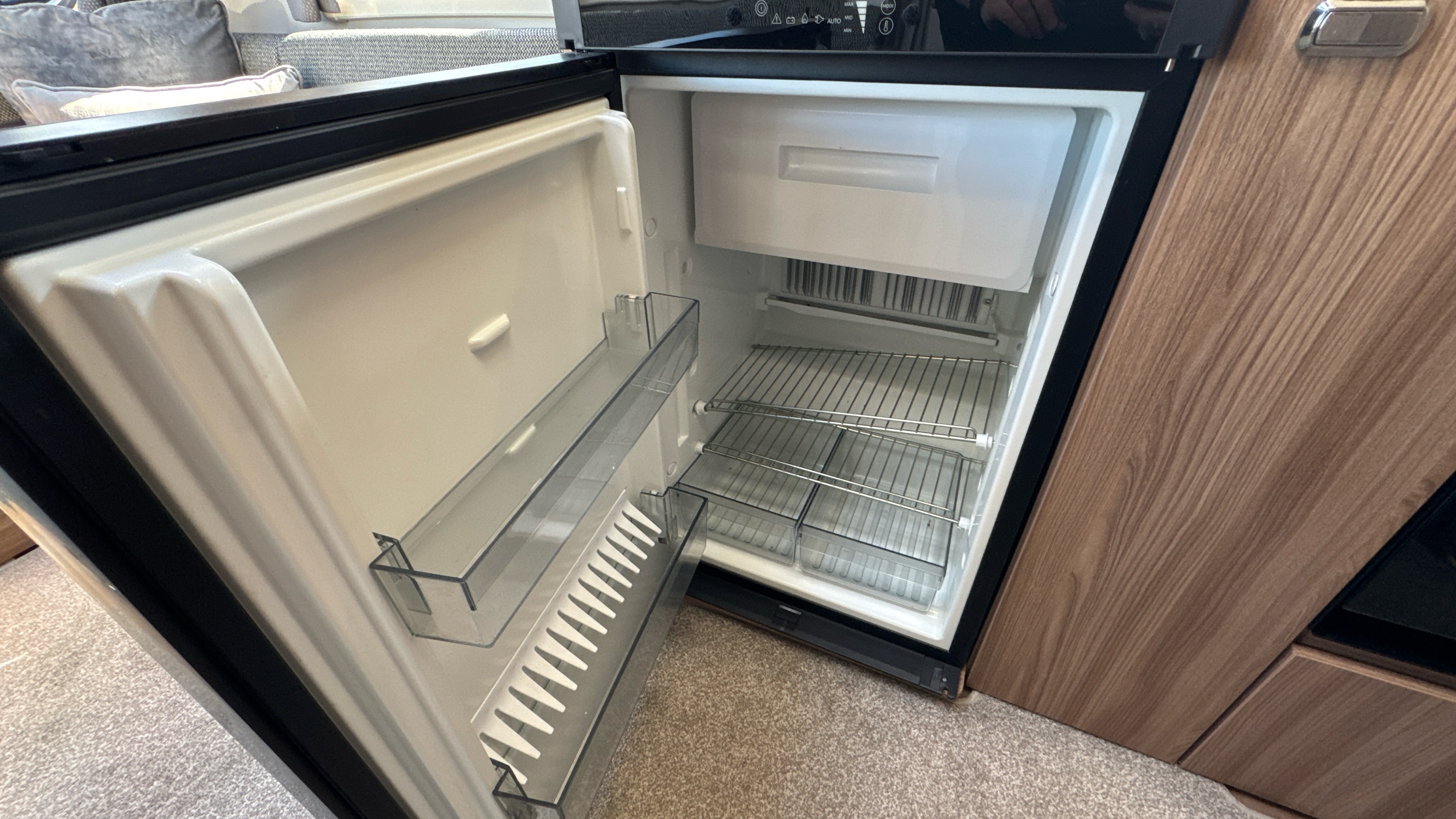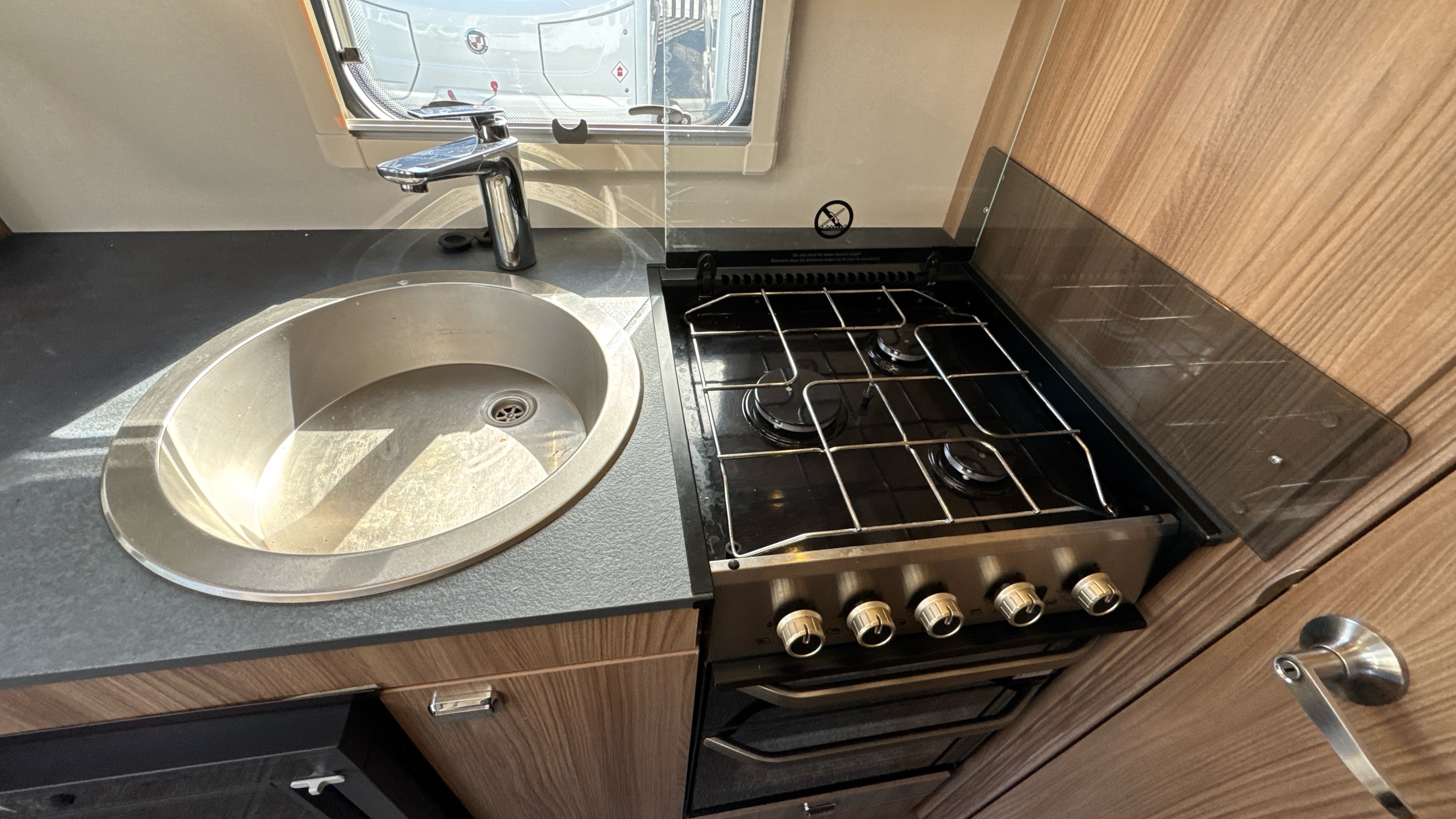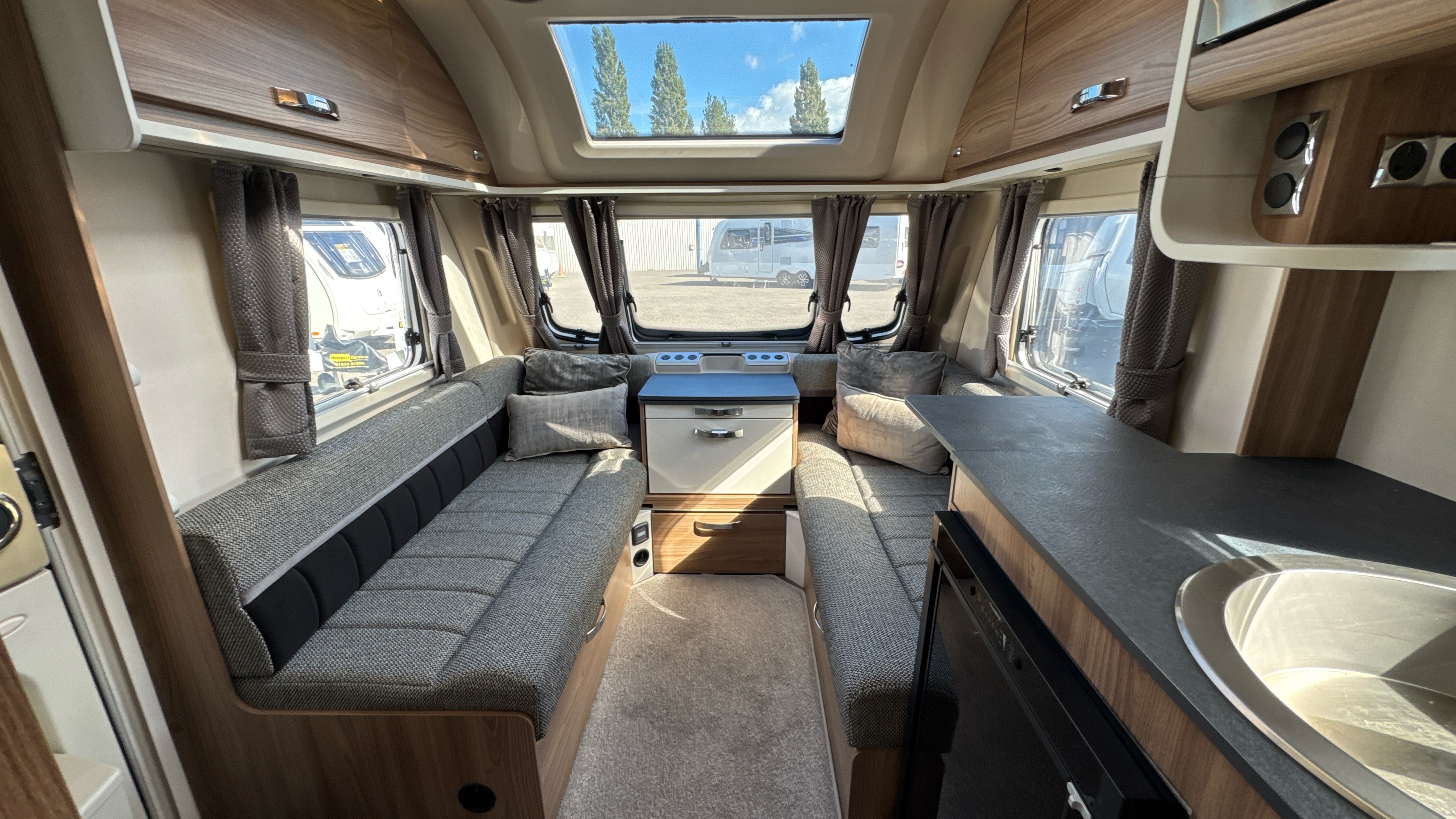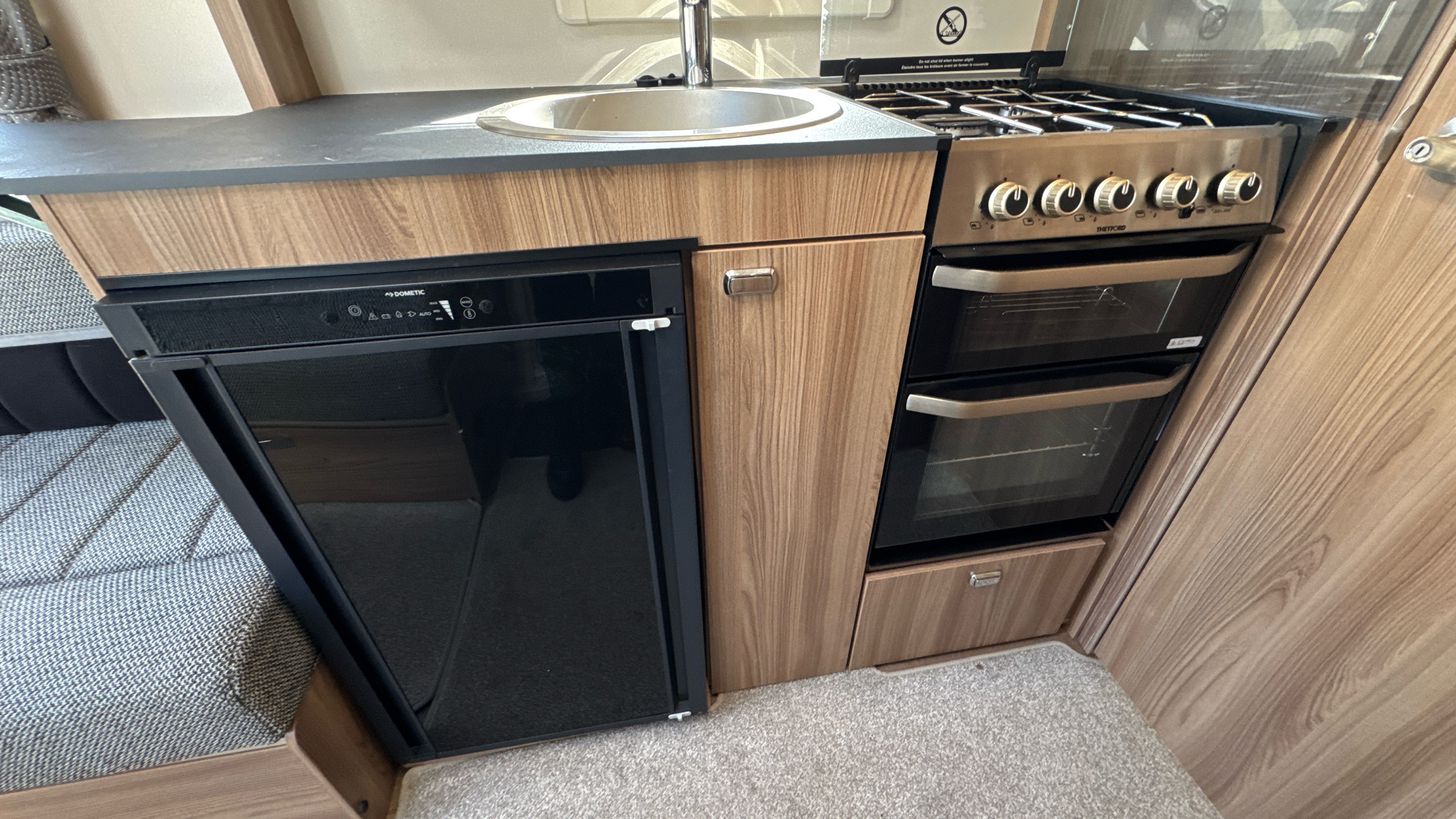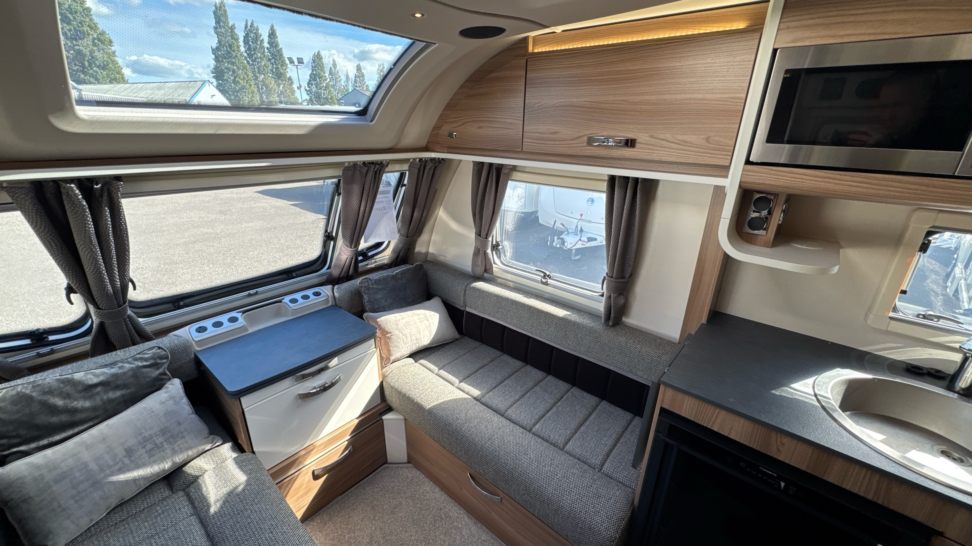 Well appointed and well equipped kitchen complate with thetford gas oven/grill and 3-burner hob with folding glass lid with gas safety shut-off, factory fitted microwave, 3-way gloss black fronted fridge with integral freezer compartment and recessed aluminium sink with clip on draining board and modern hot and cold mixer tap.