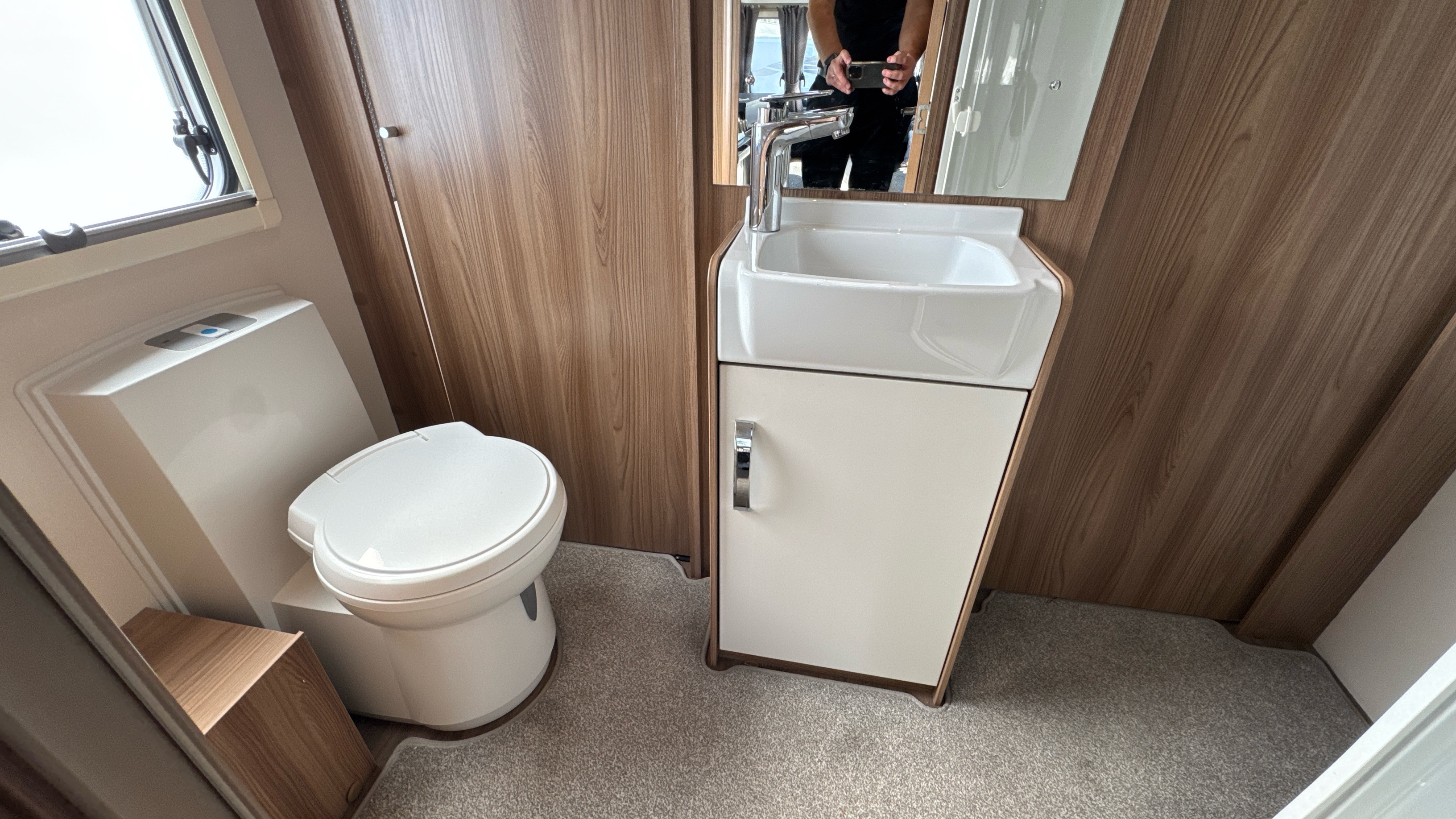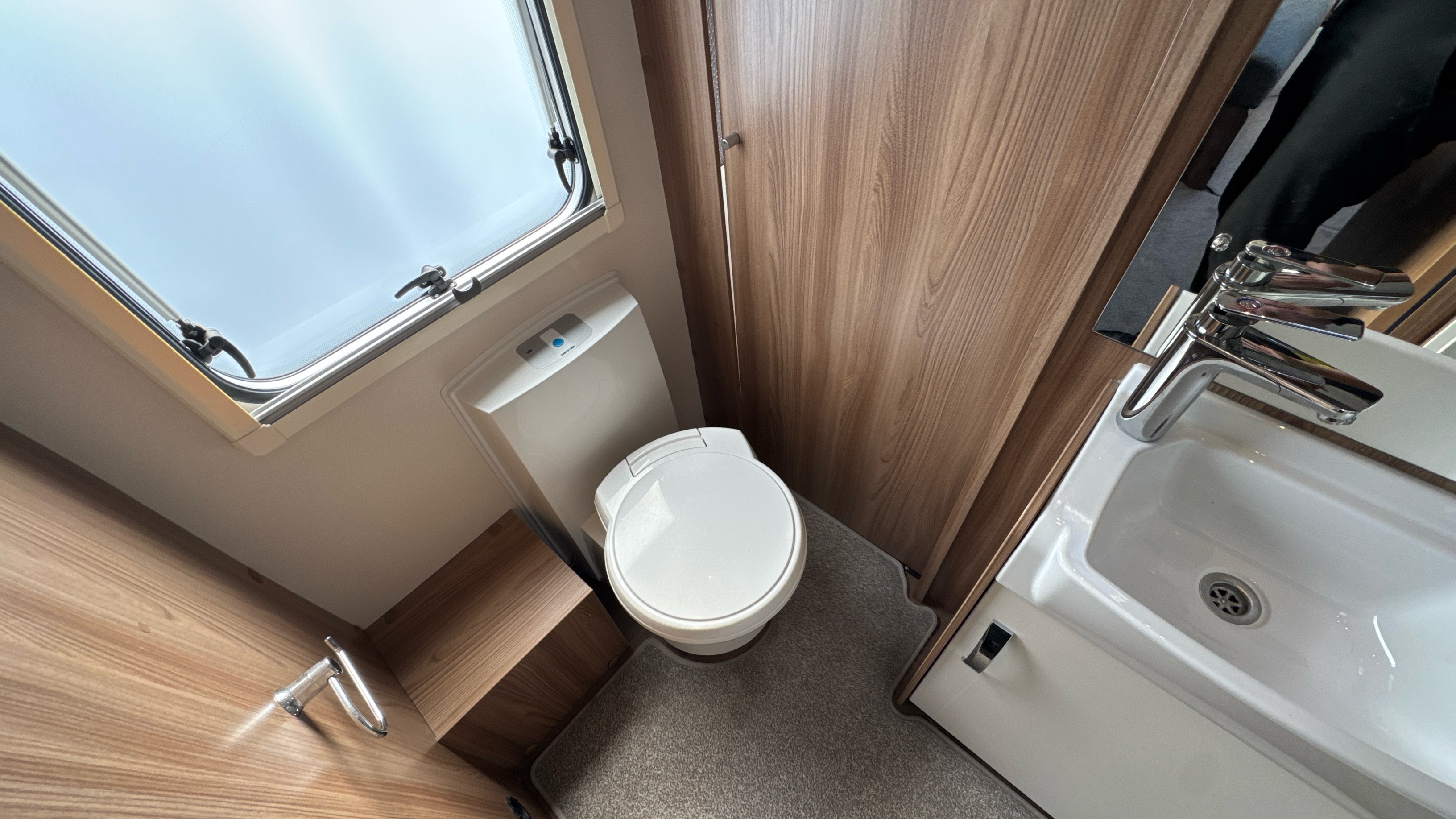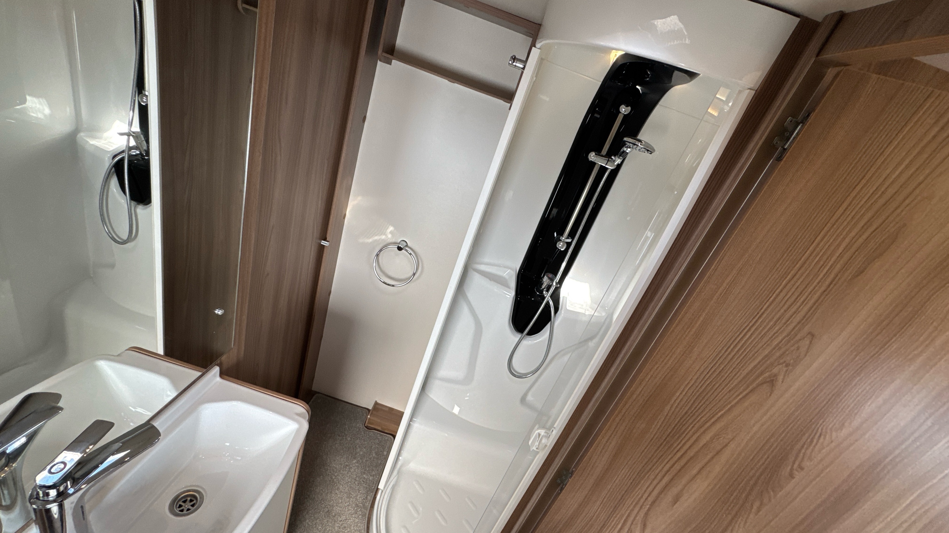 Full width centrally located washroom adorns the centre of the caravan which features a full sized walk in shower cubicle, sink and vanity unit with back lit vanity mirror and thetford swivel cassette chemical toilet with electric flush operation.