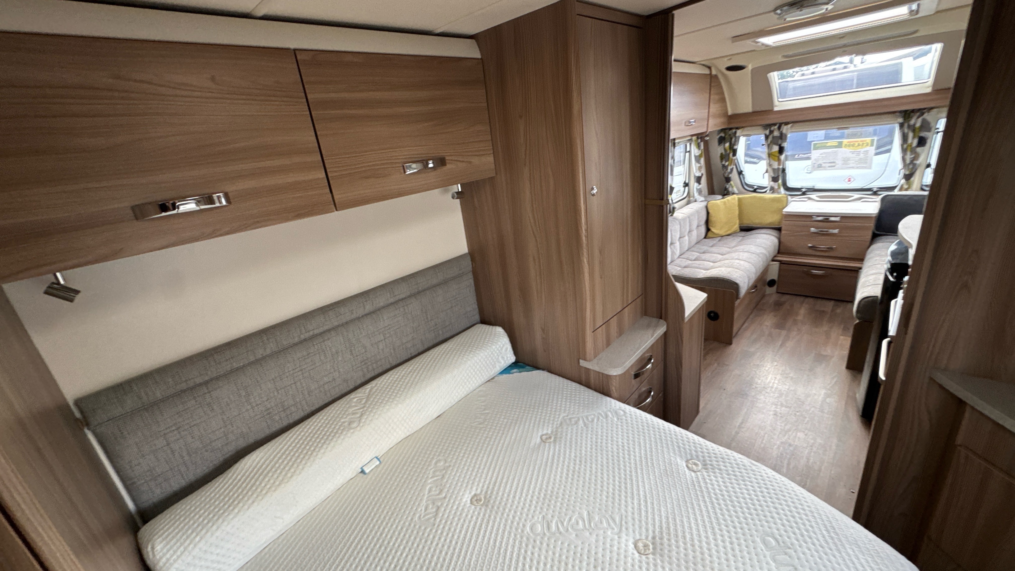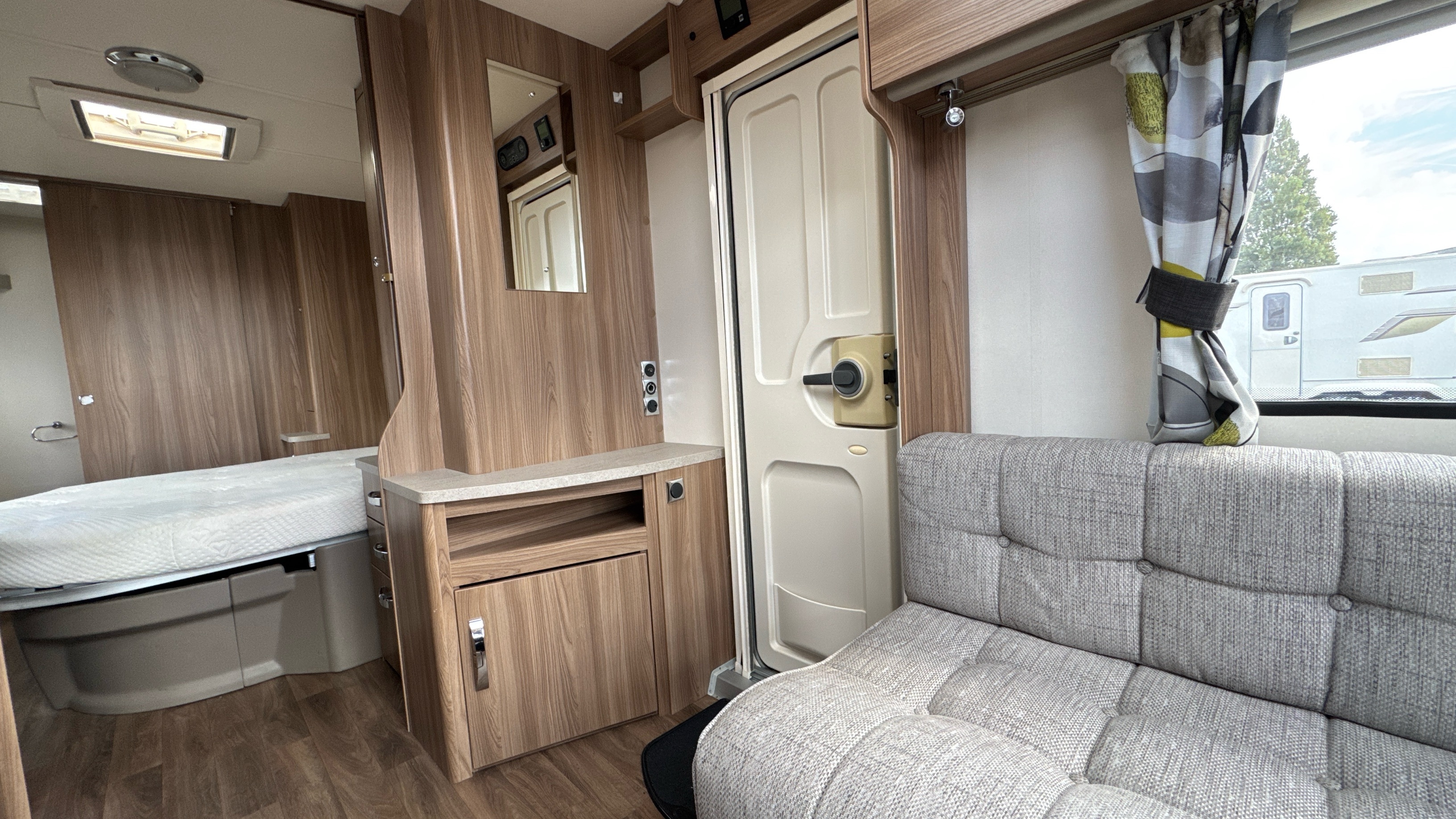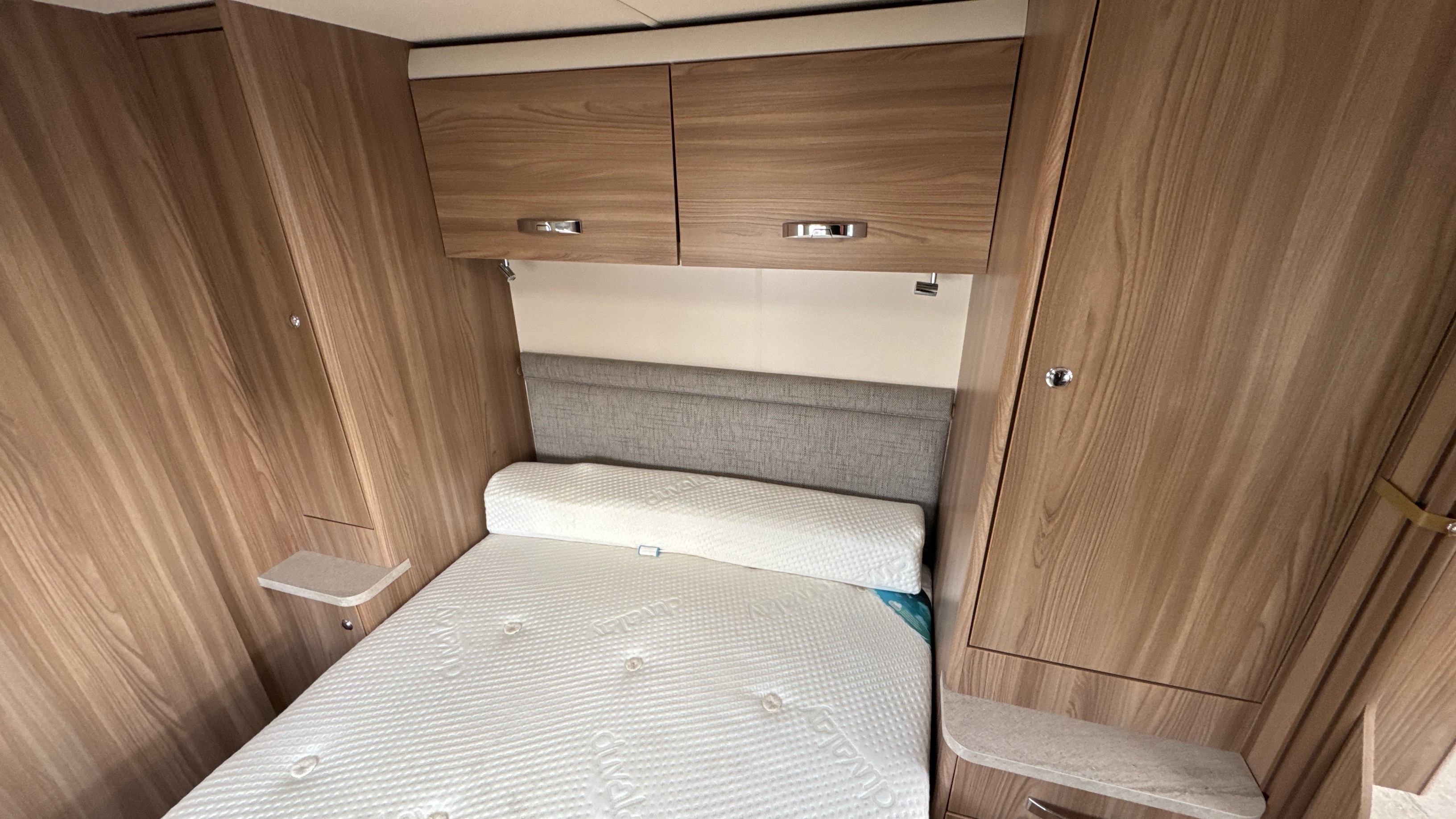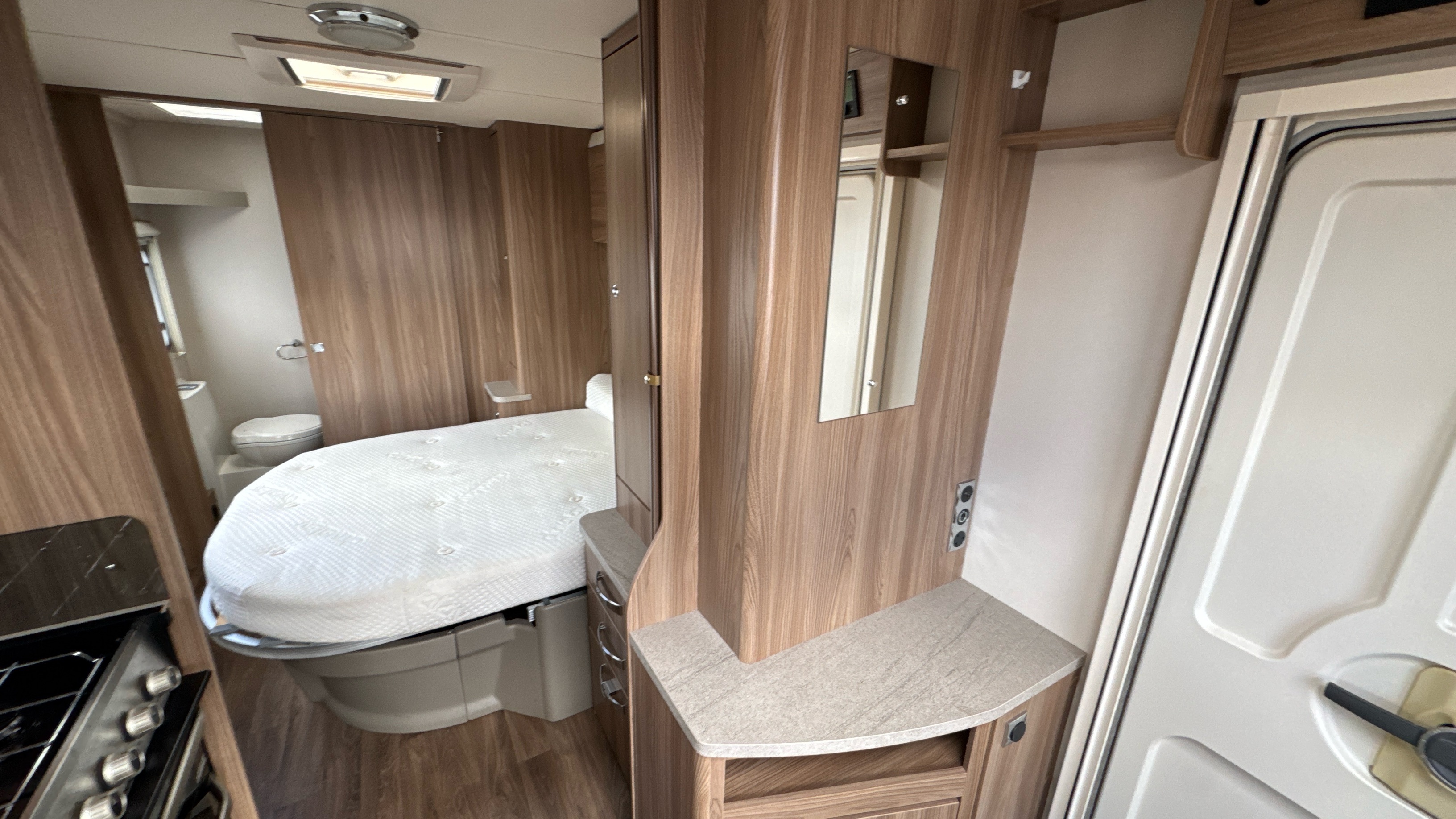 Fantastic layout features a dedicated rear walk in washroom with separate walk in fully lined shower compartment, thetford cassette swivel toilet and recessed sink/vanity unit. Centrally located island walk around bed with an abundance of over head storage locker space, his 'n' hers wardrobes and a domestic style high quality Duvalay mattress to ensure a peaceful and comfortable nights rest.