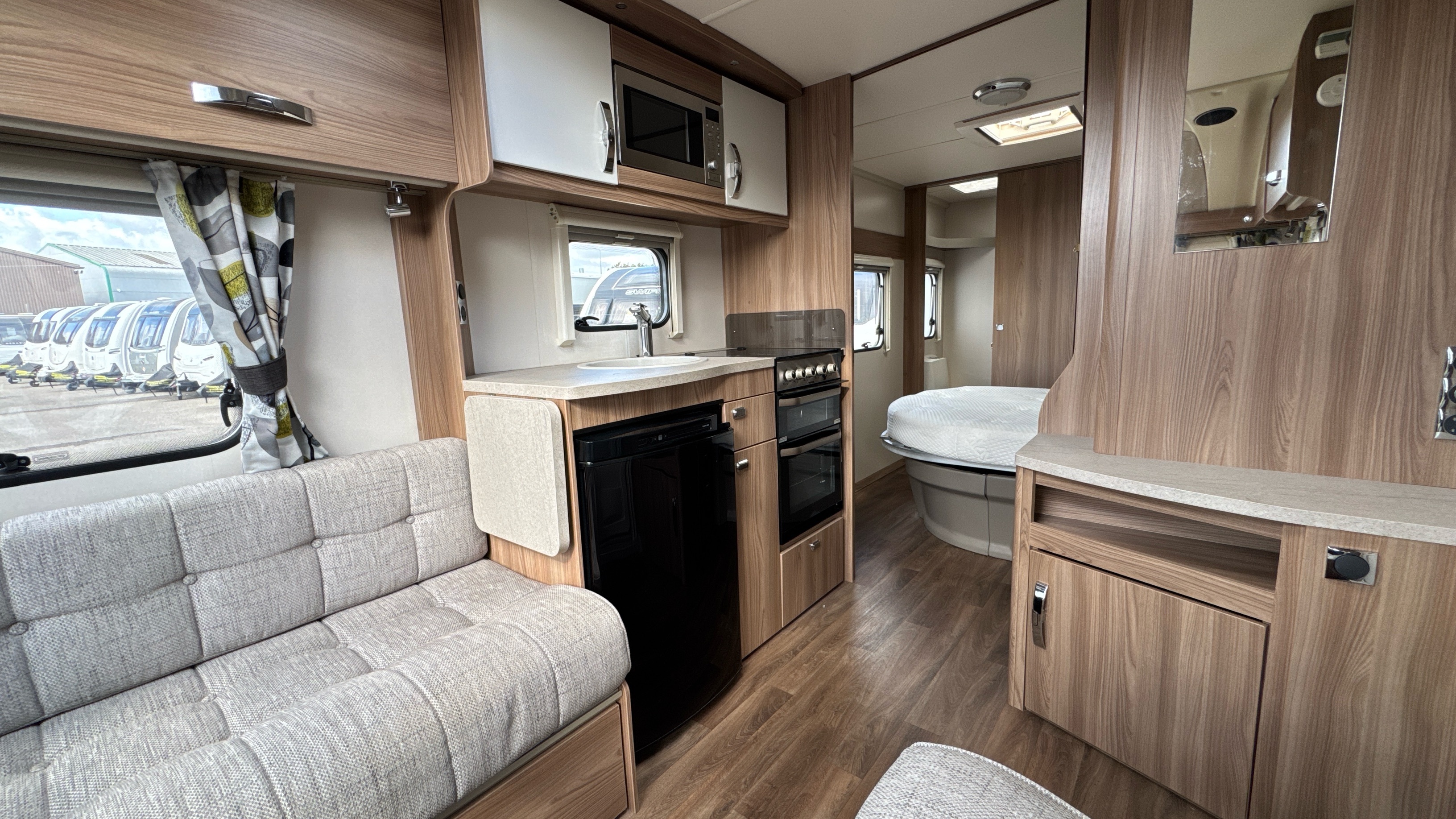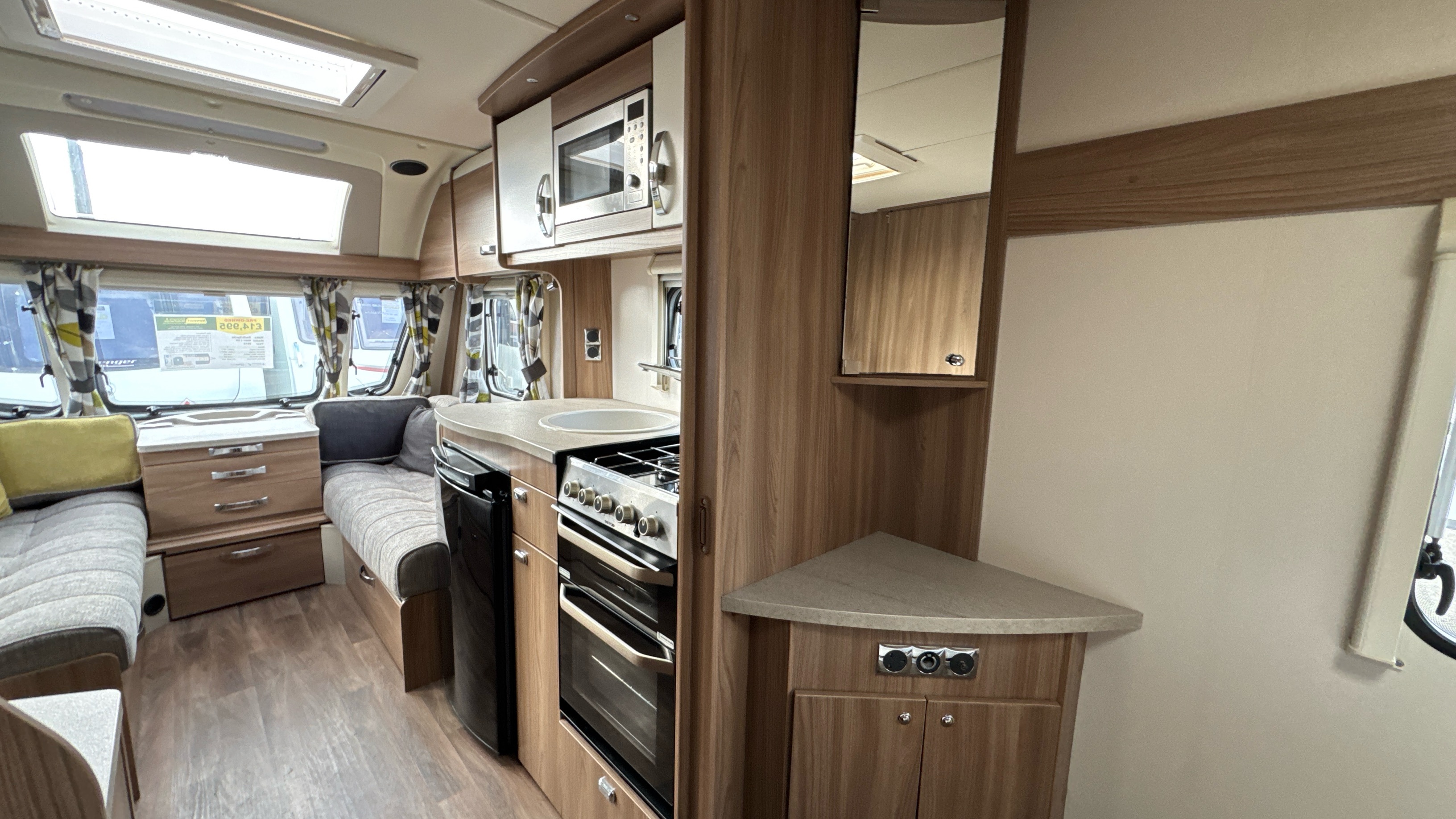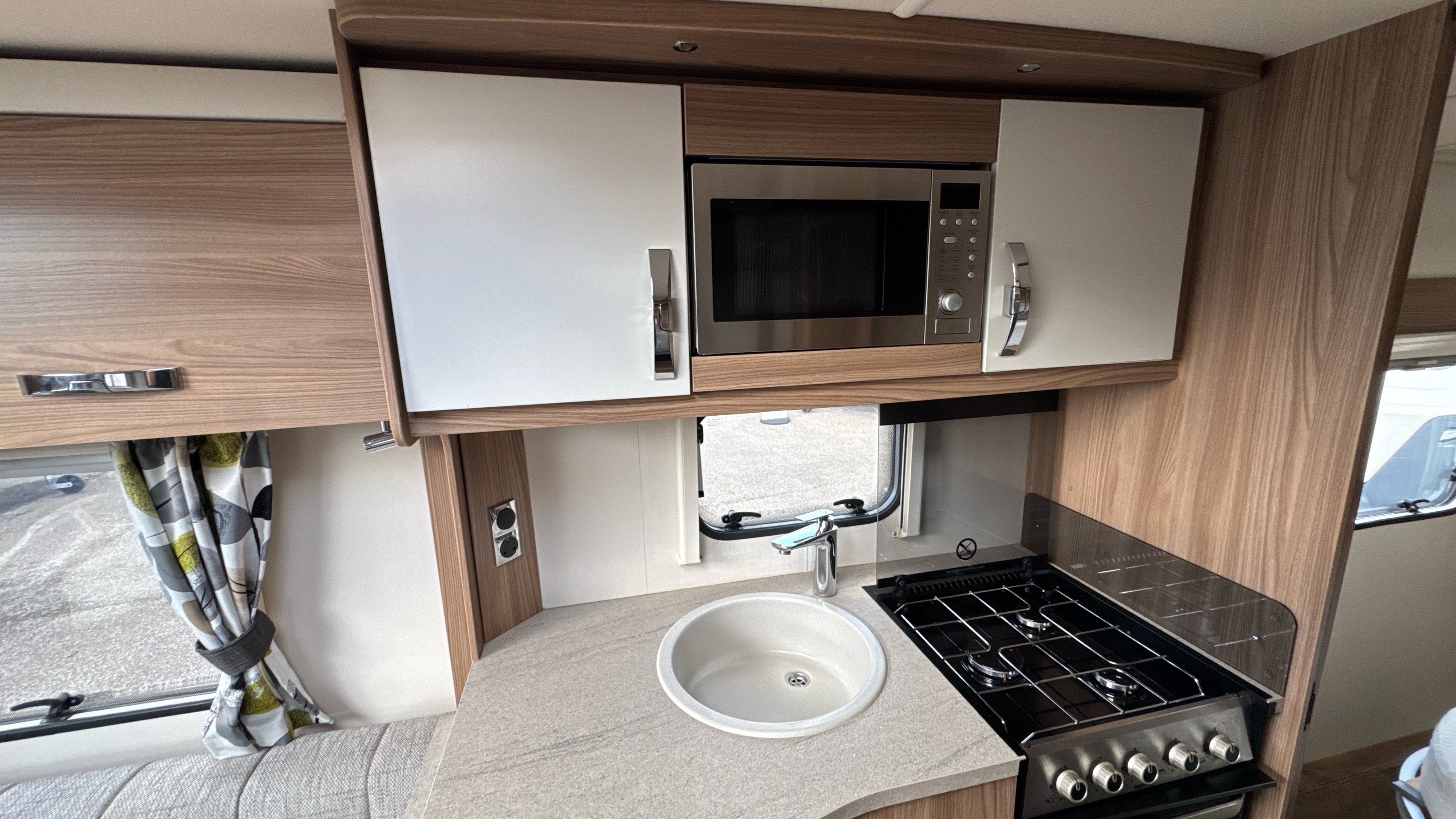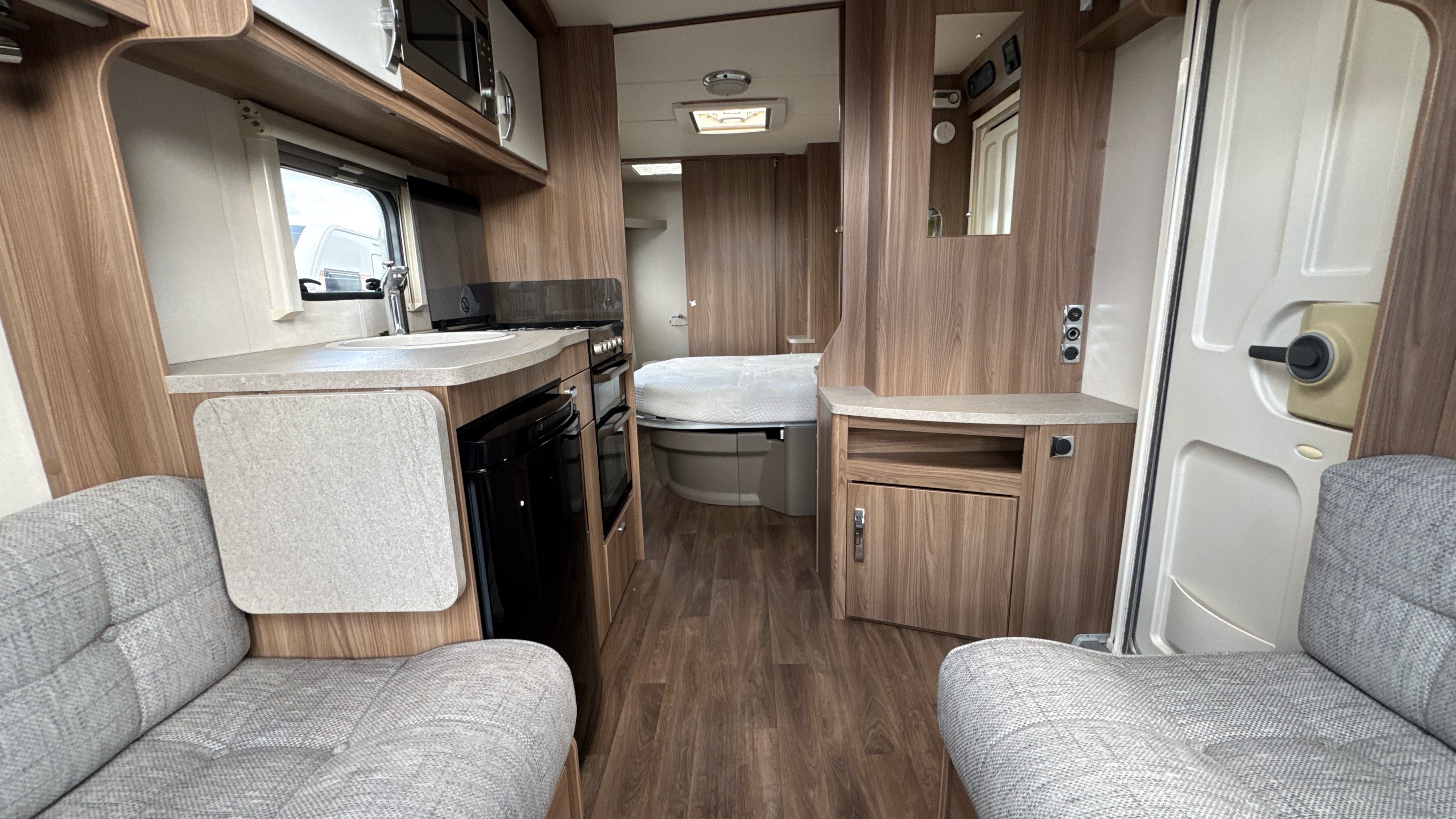 Centre kitchen is ideal for any budding Jamie Oliver's or Mary Berry's and features a domestic style gas oven/grill/3 burner hob with foldable glass worktop lid, recessed sink with clip on draining board and modern chrome hot and cold mixer tap, factory fitted brushed aluminium microwave in its own dedicated housing and a thetford 3-way fridge with small freezer compartment.