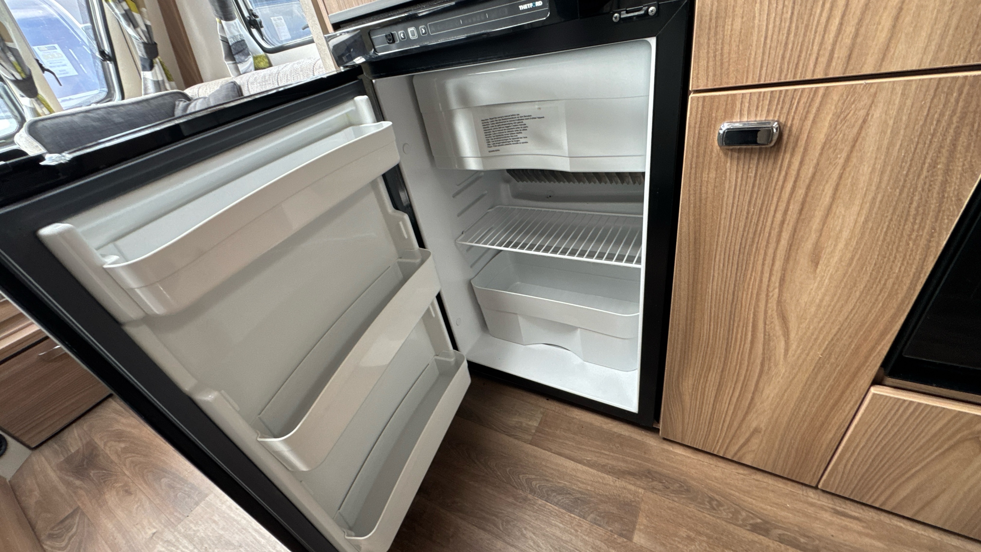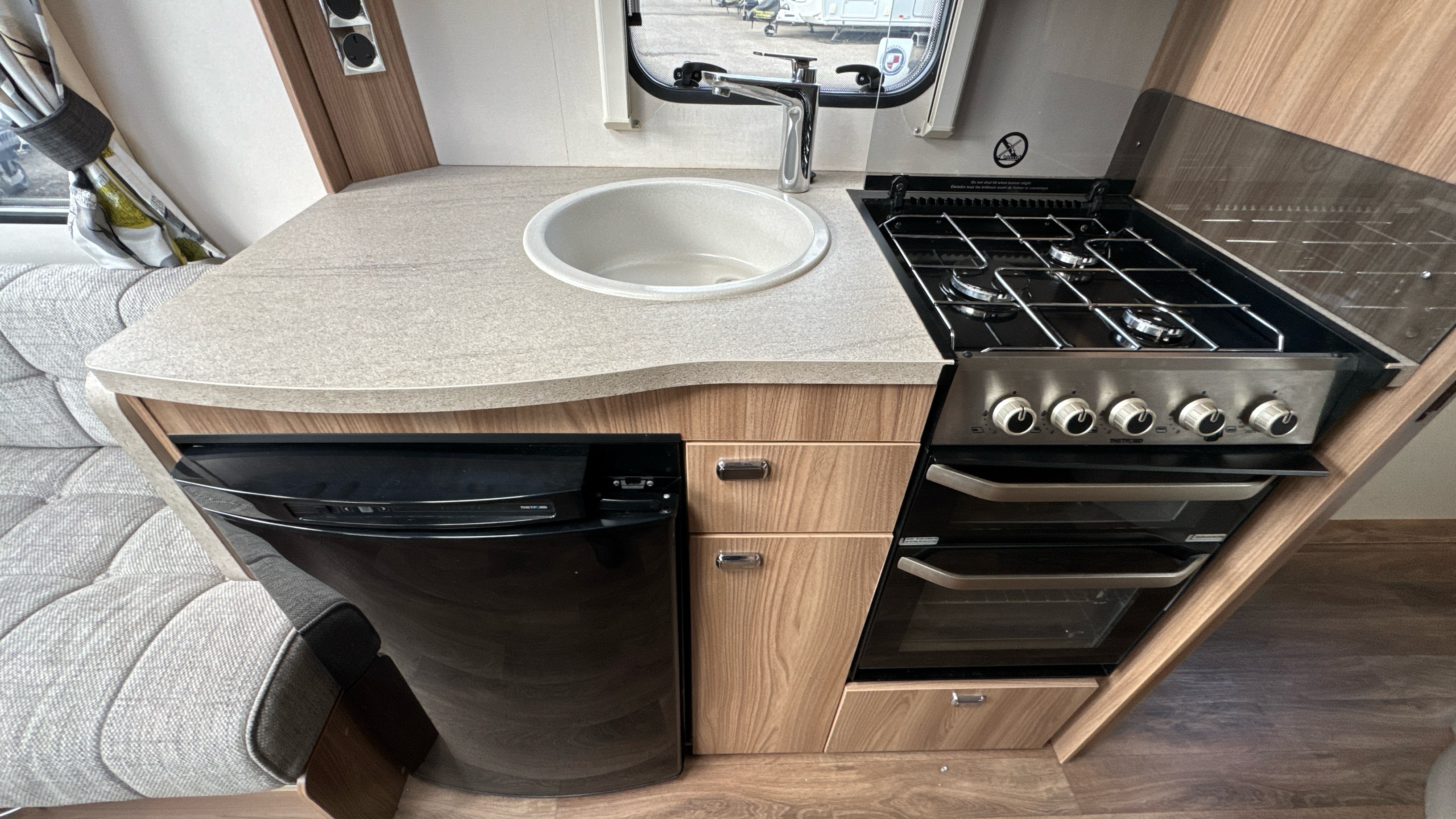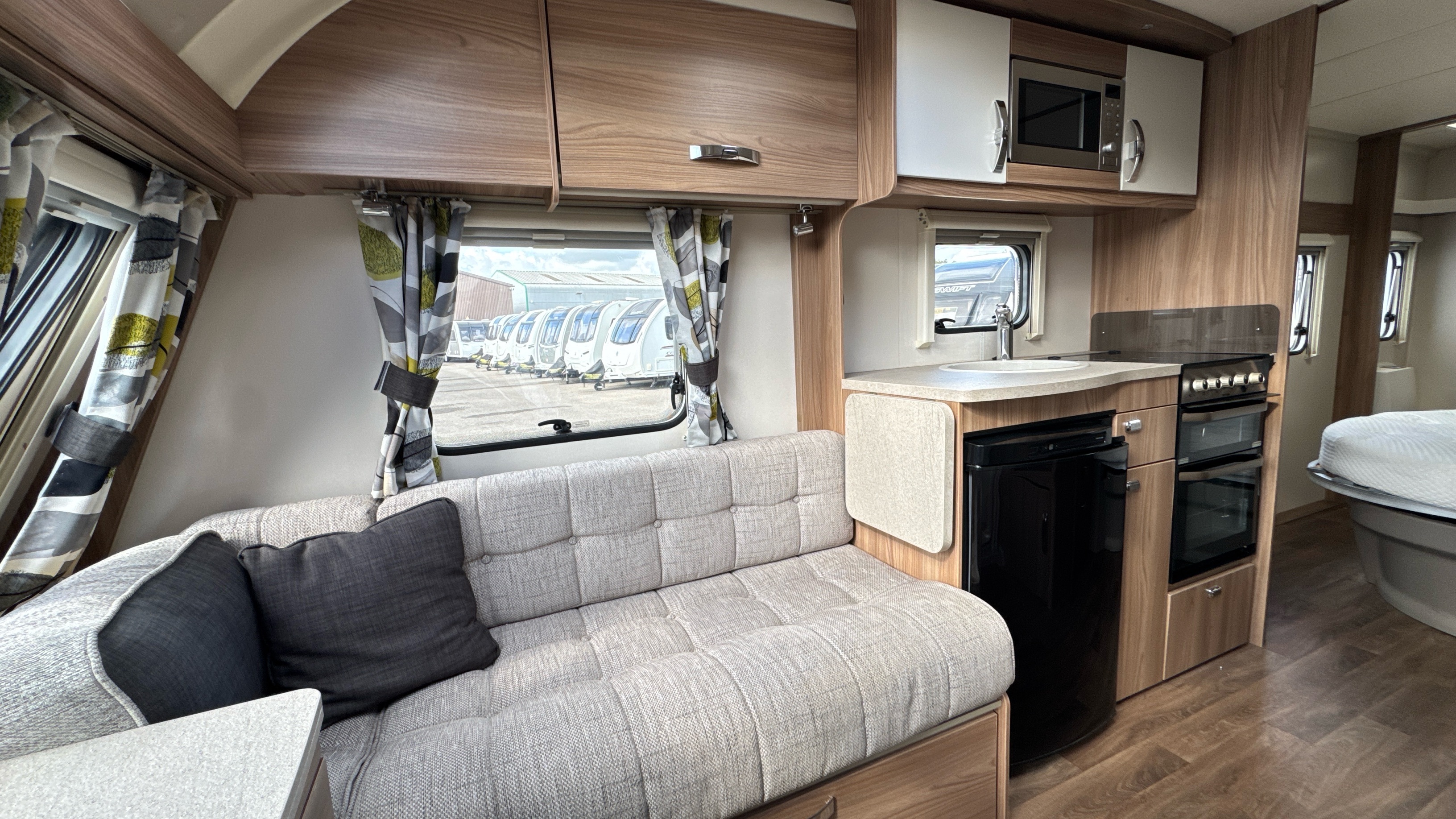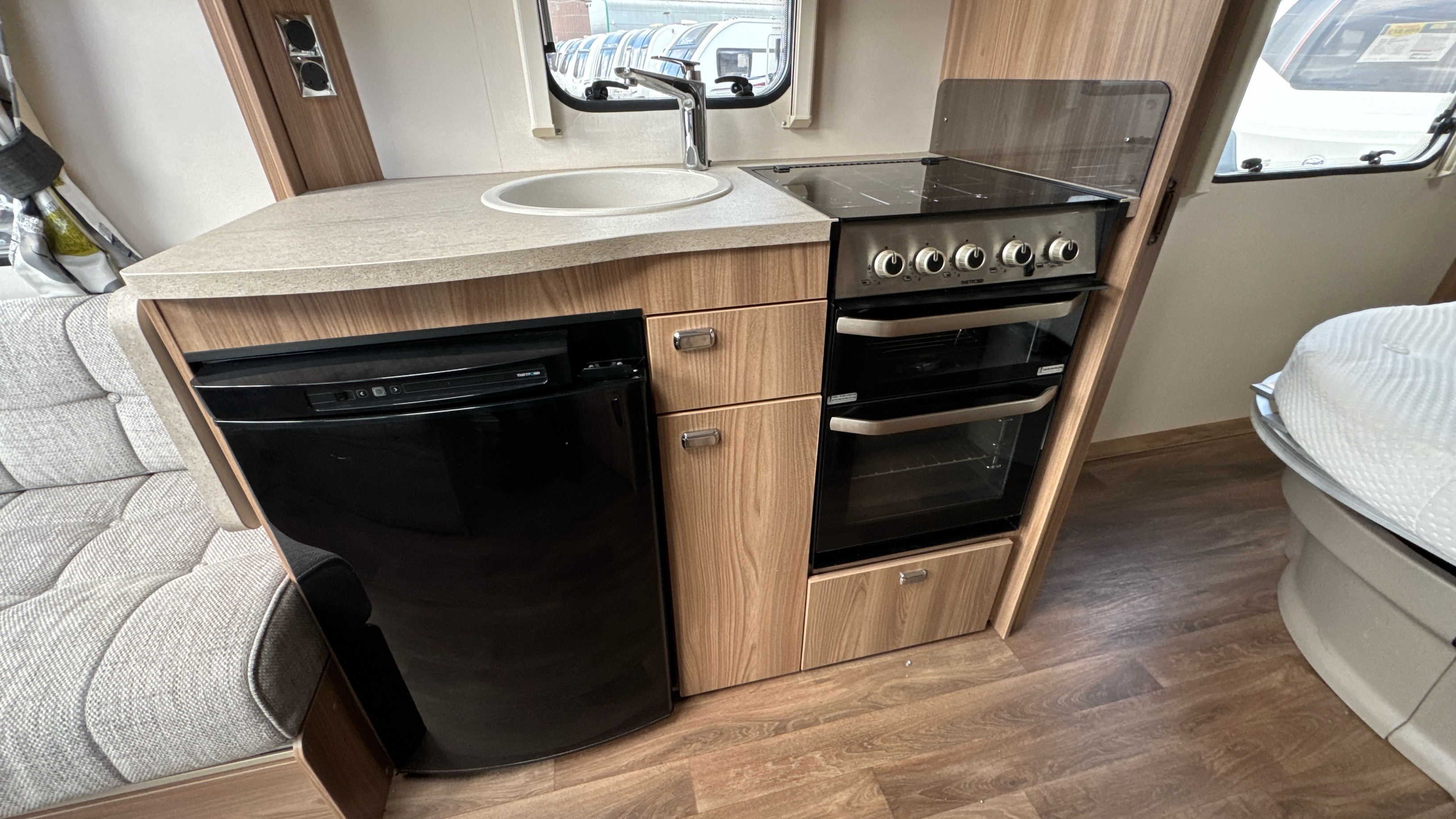 Centre kitchen is ideal for any budding Jamie Oliver's or Mary Berry's and features a domestic style gas oven/grill/3 burner hob with foldable glass worktop lid, recessed sink with clip on draining board and modern chrome hot and cold mixer tap, factory fitted brushed aluminium microwave in its own dedicated housing and a thetford 3-way fridge with small freezer compartment.