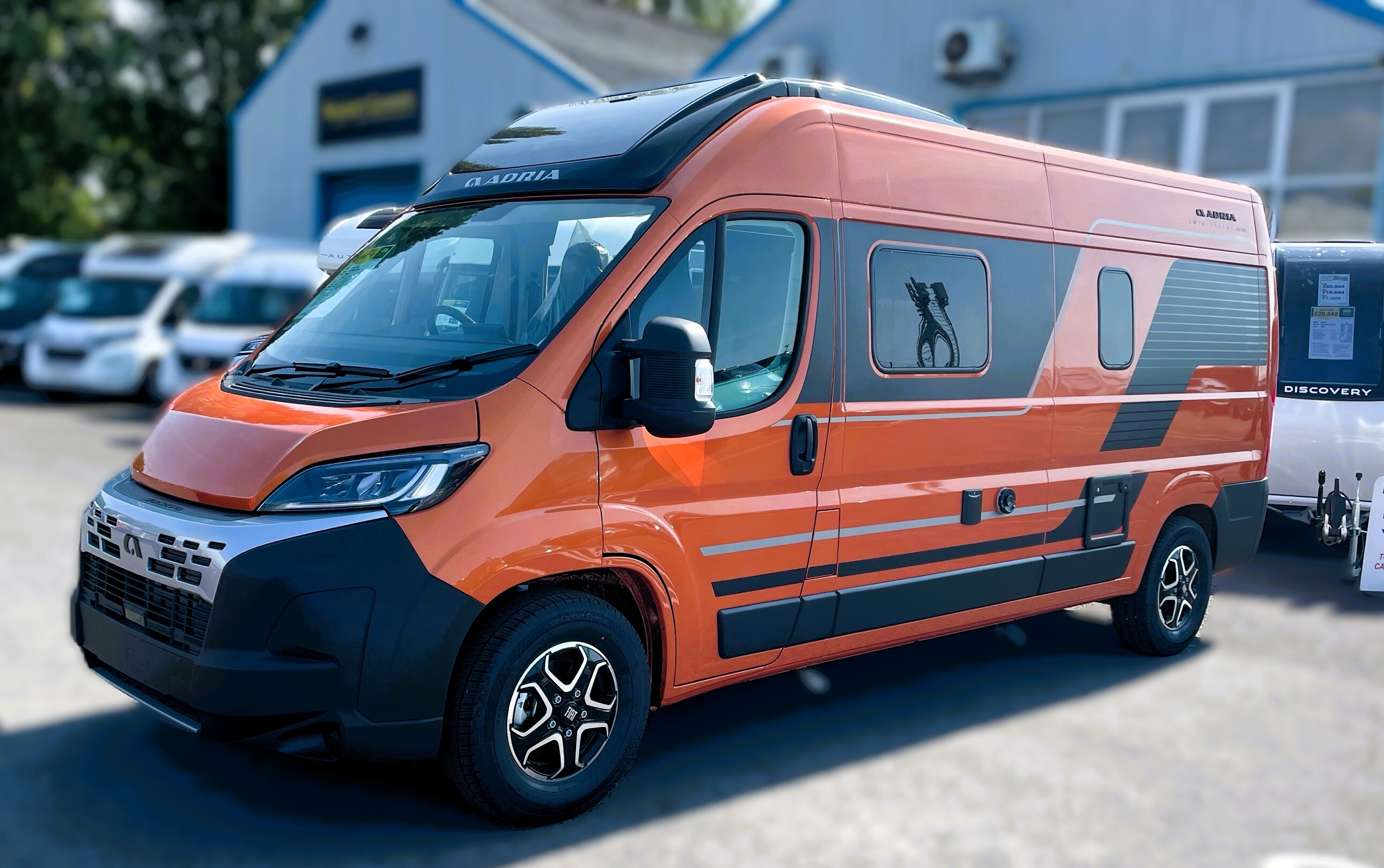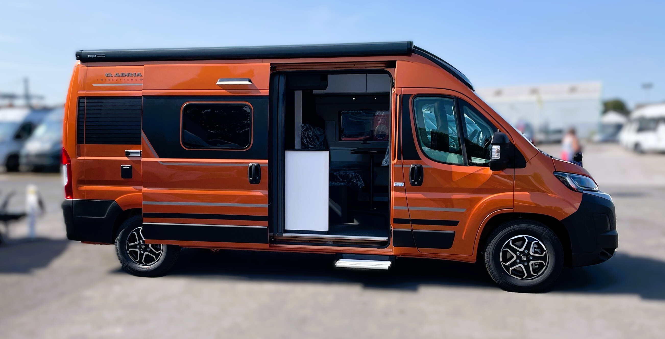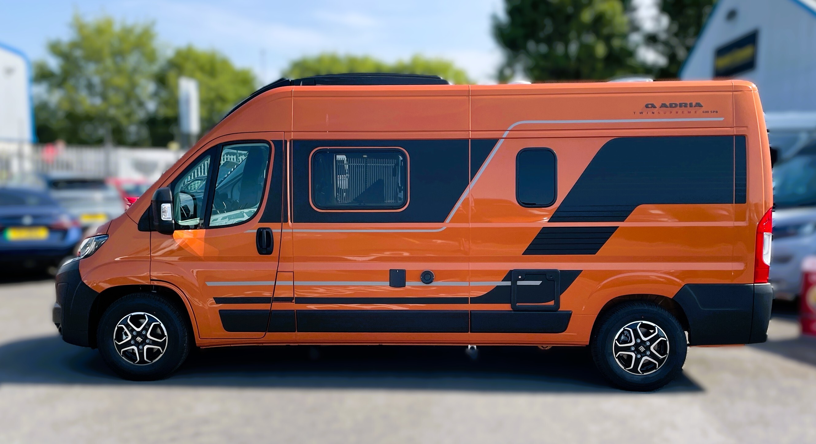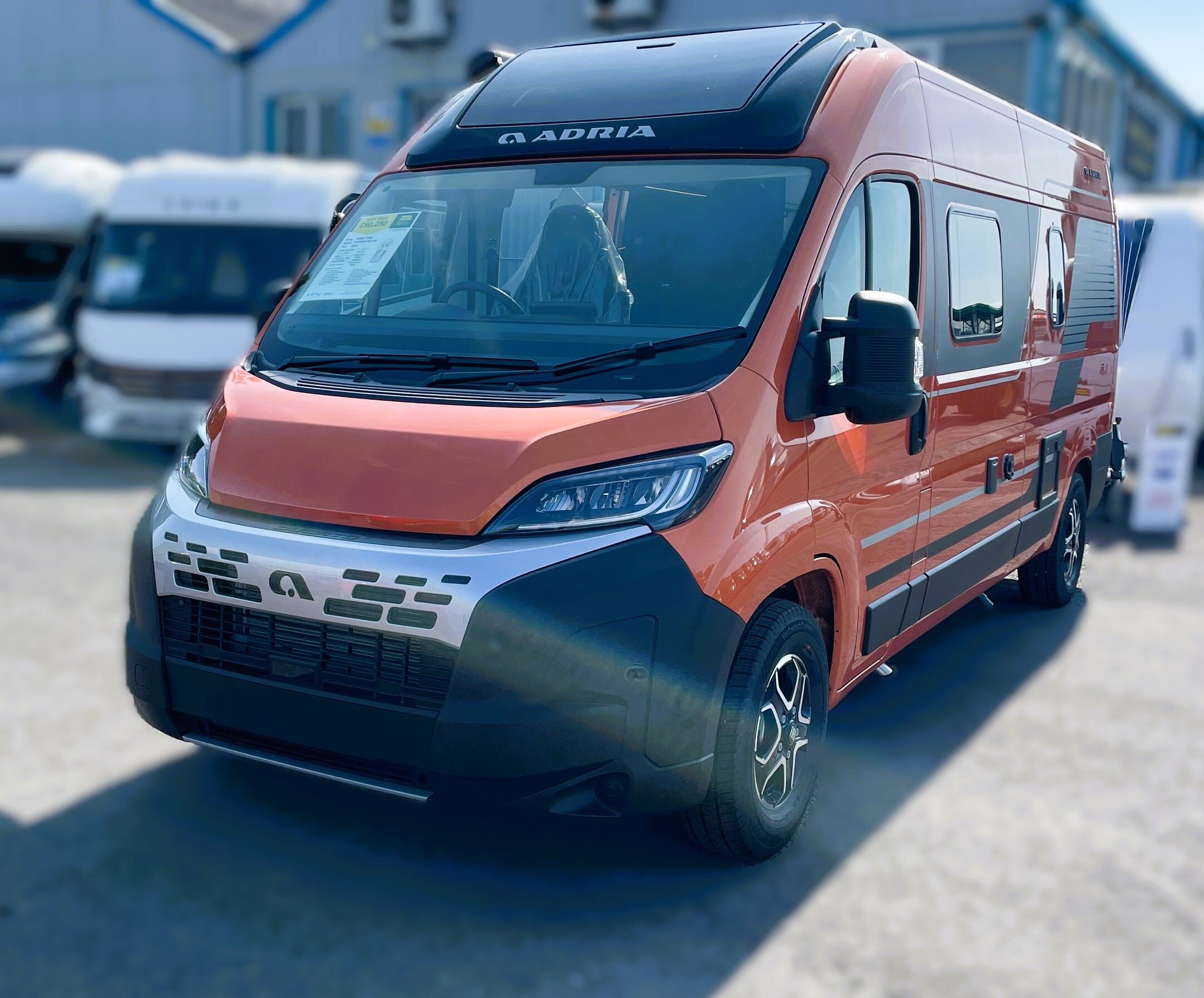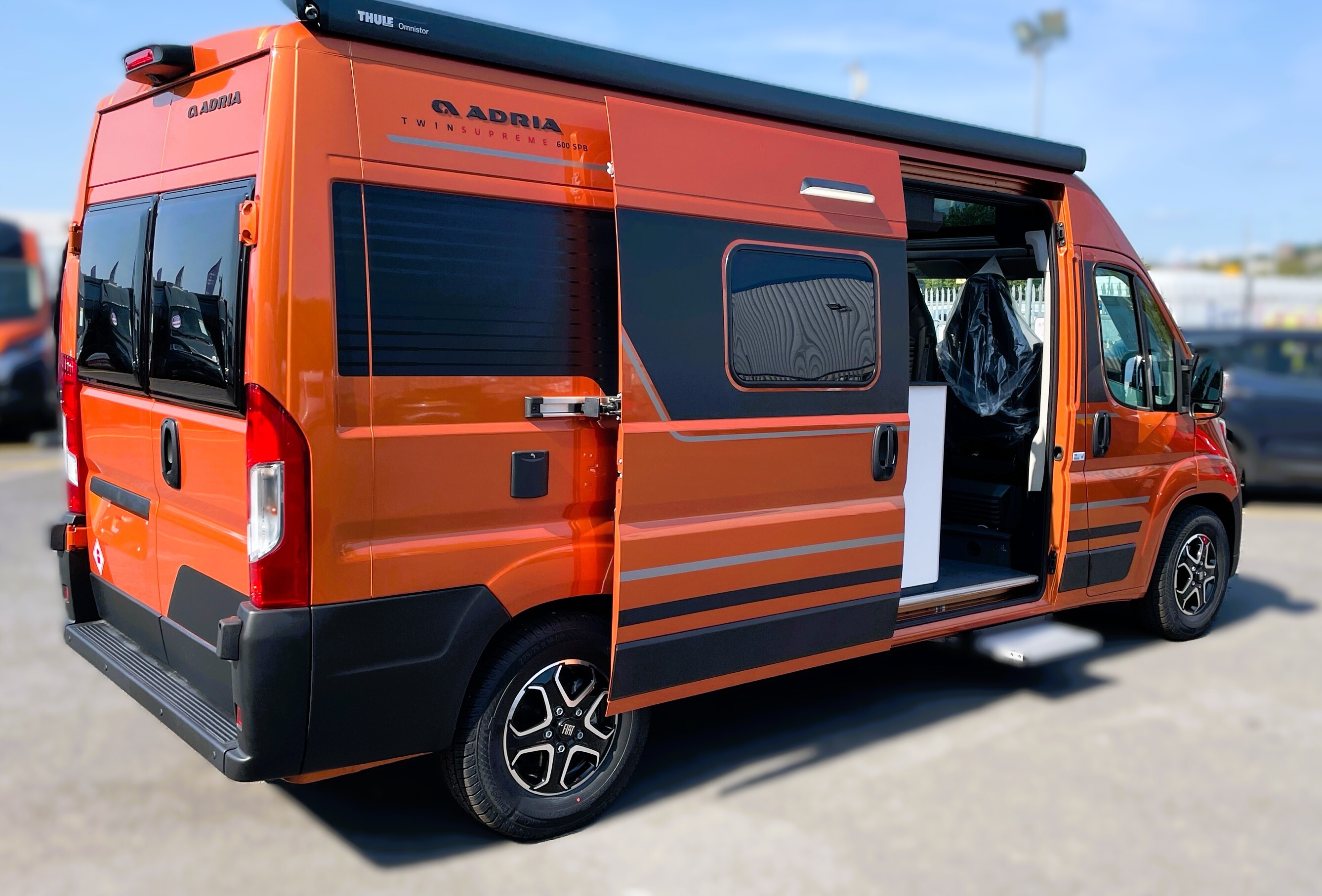 2025 Adria Twin Supreme 600SPB Fiat 140BHP, Automatic 8-speed AT8, All Inclusive, Fiat Lux Pack, BATIC ORANGE 505 (black Front Bumper),10” Radio Navi DAB Rev. Camera, Full LED headlamps, Electric Park brake, Fuel tank 60L Diesel-electric heater with boiler Truma Combi D 6 E, Auxiliary battery X2 100ah AGM Solar Panel, PANORAMIC ROOF WINDOW WITH OPENING OPTION, Refrigerator with compressor, Flyscreen sliding door, Thule Awning, AddOn Airbed with TearGuard & Air pump for "AddOn bed", Outdoor table holder, LEATHER EDWARD Interior Cushions CARBON KNIT, 600 SPB With cross rear bed 196 x 145 cm