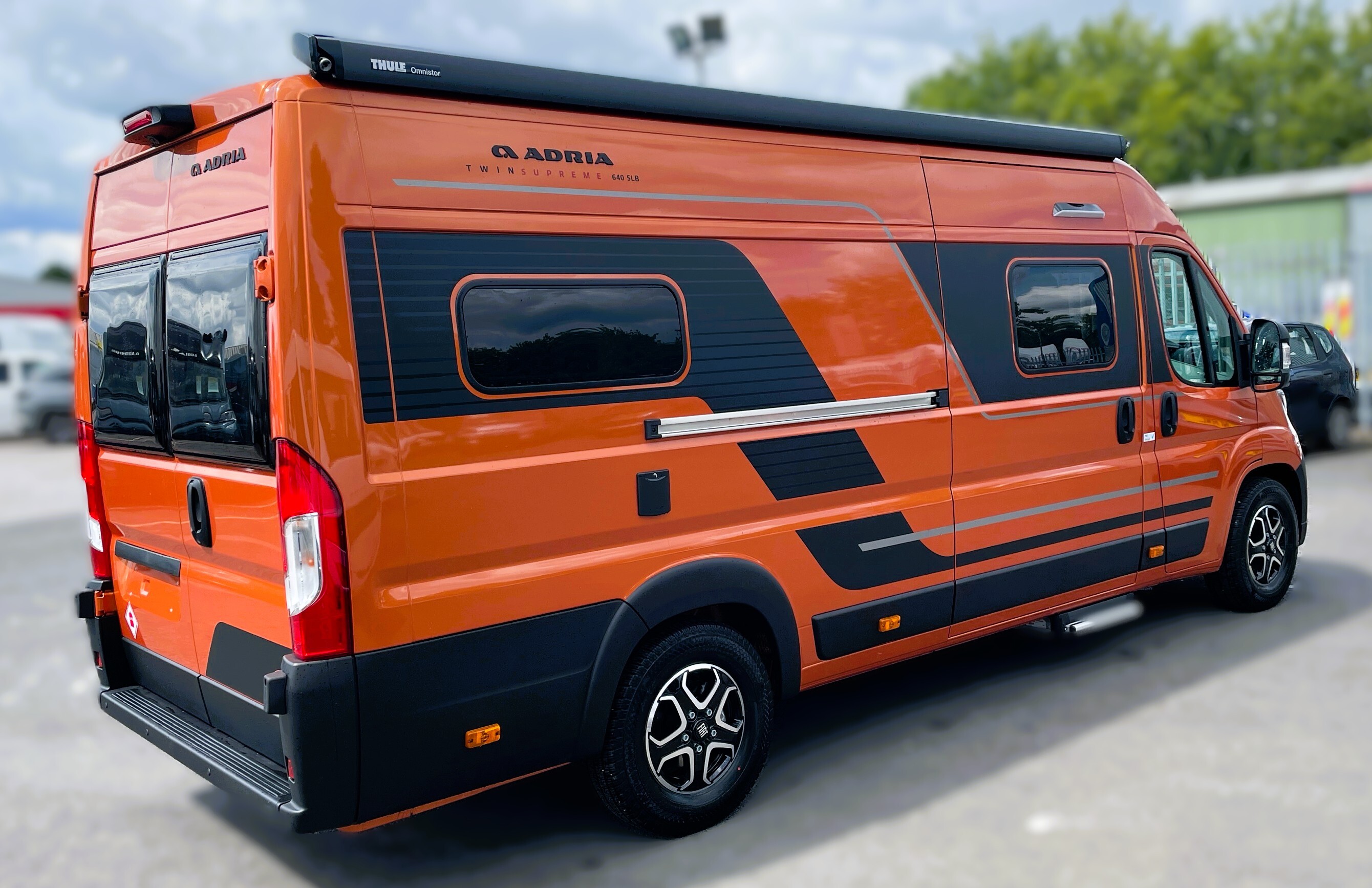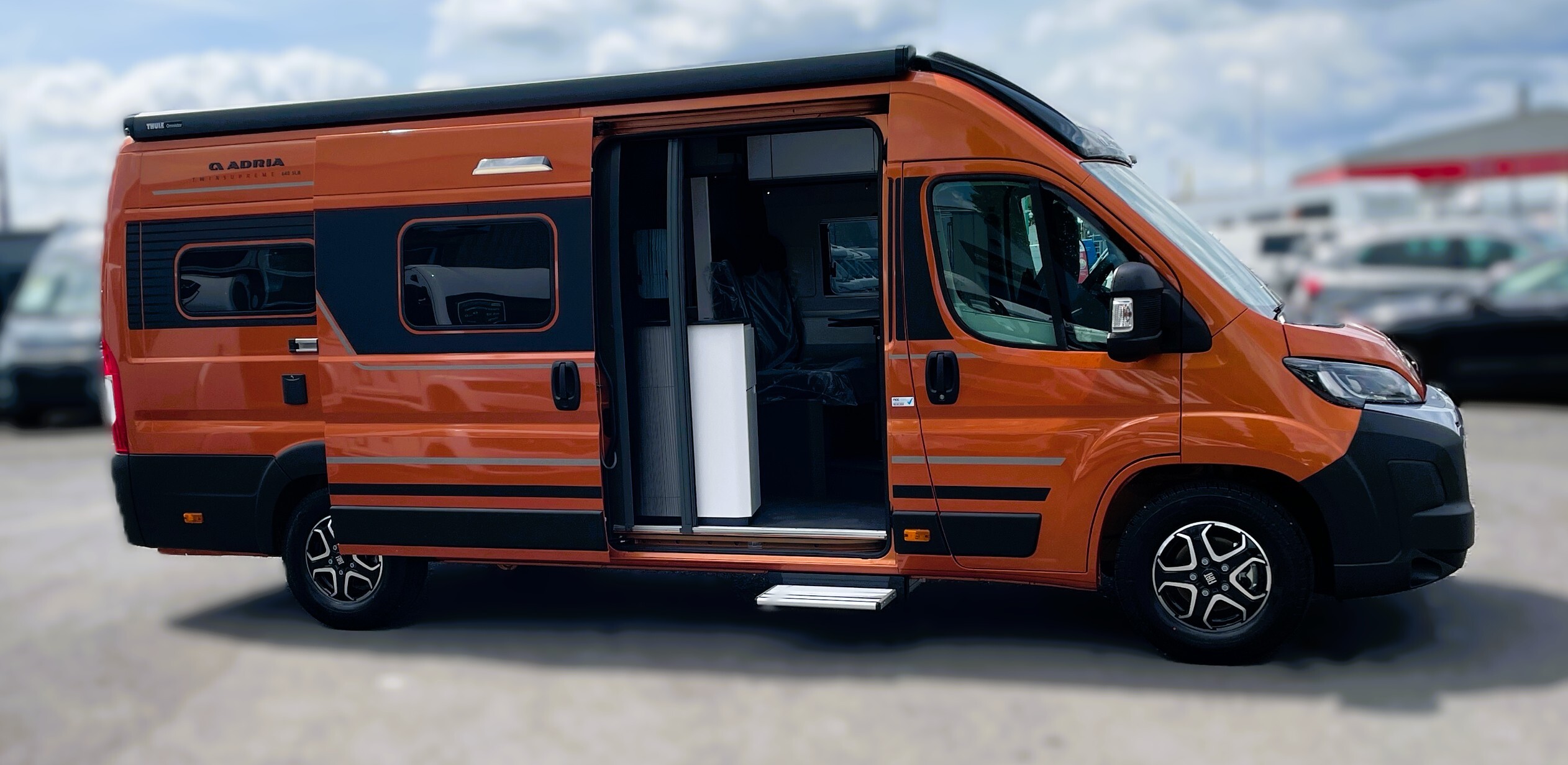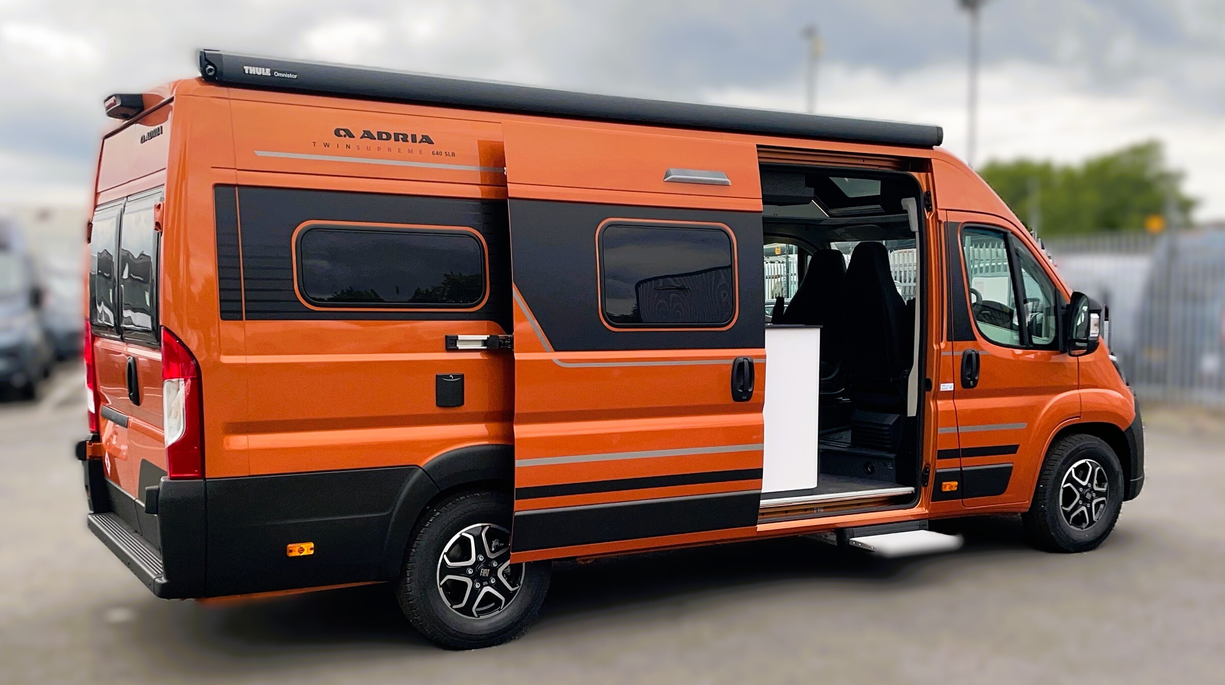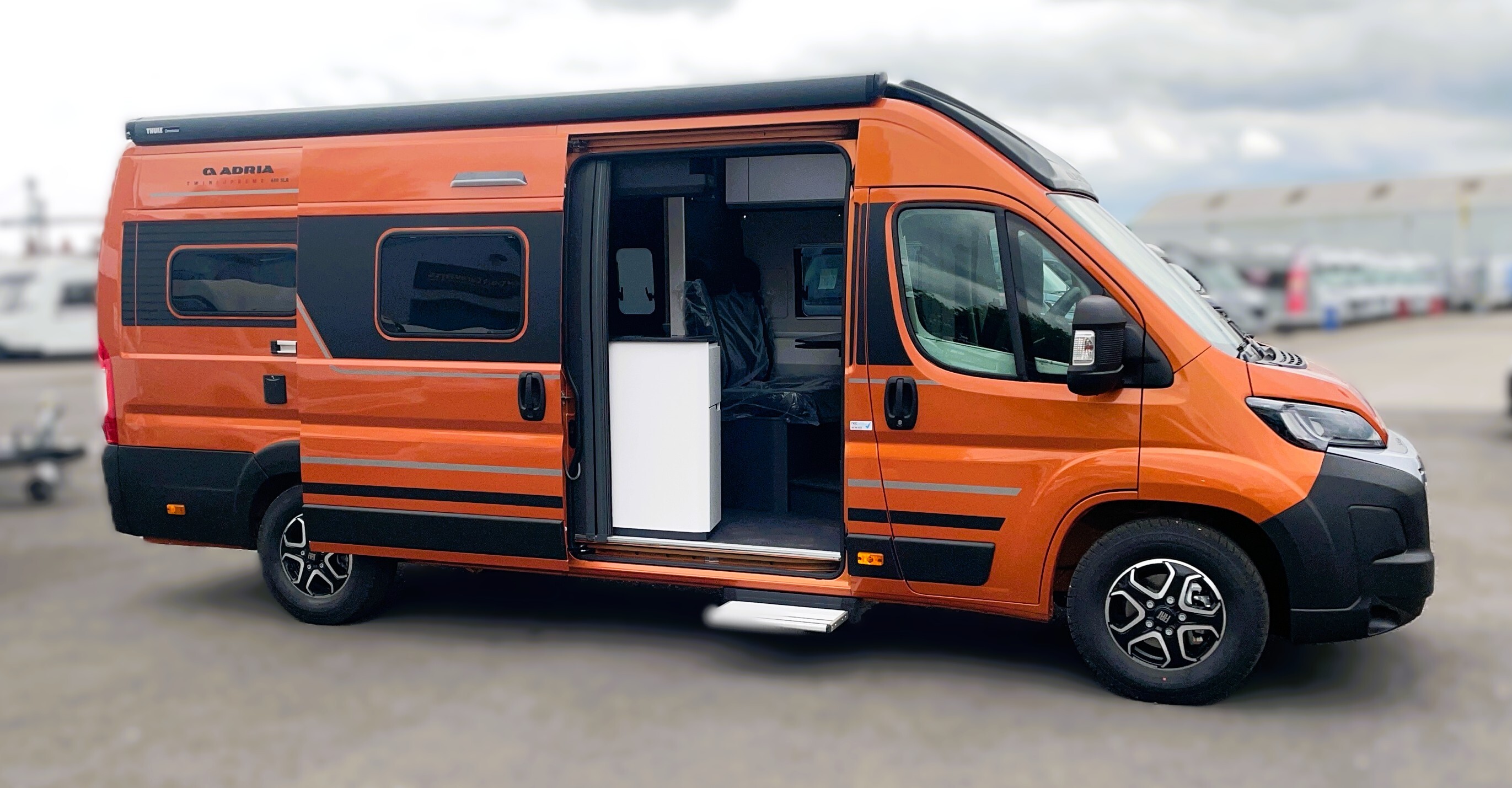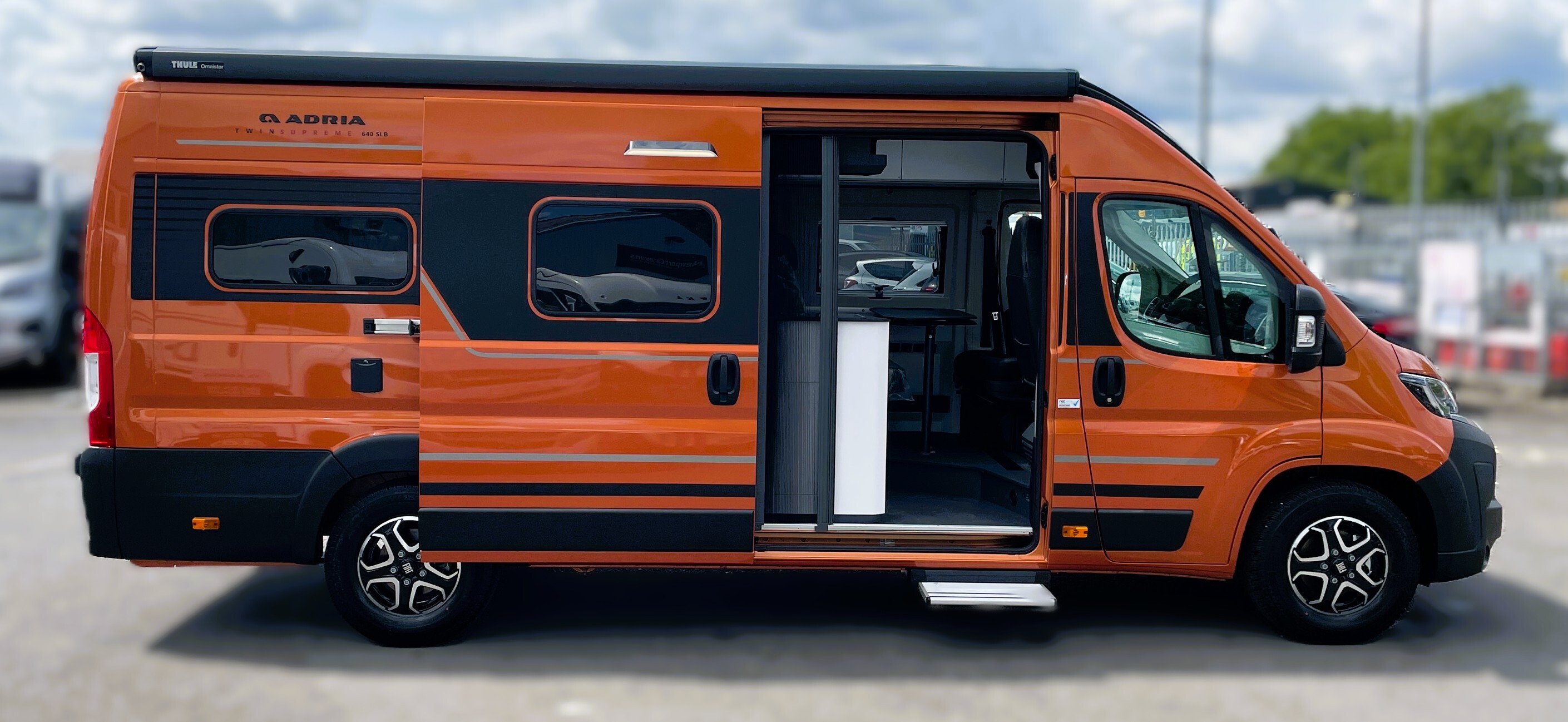 2025 Adria Twin Supreme 640LB Fiat 140BHP, Automatic 8-speed AT8, All Inclusive, Fiat Lux Pack, BATIC ORANGE 505 (black Front Bumper),10” Radio Navi DAB Rev. Camera, Full LED headlamps, Electric Park brake, Fuel tank 60L Diesel-electric heater with boiler Truma Combi D 6 E, Auxiliary battery X2 100ah AGM Solar Panel, PANORAMIC ROOF WINDOW WITH OPENING OPTION, Refrigerator with compressor, Flyscreen sliding door, Thule Awning, AddOn Airbed with TearGuard & Air pump for "AddOn bed", Outdoor table holder, LEATHER EDWARD Interior Cushions CARBON KNIT, 640 SLB With cross rear bed 196 x 145 cm