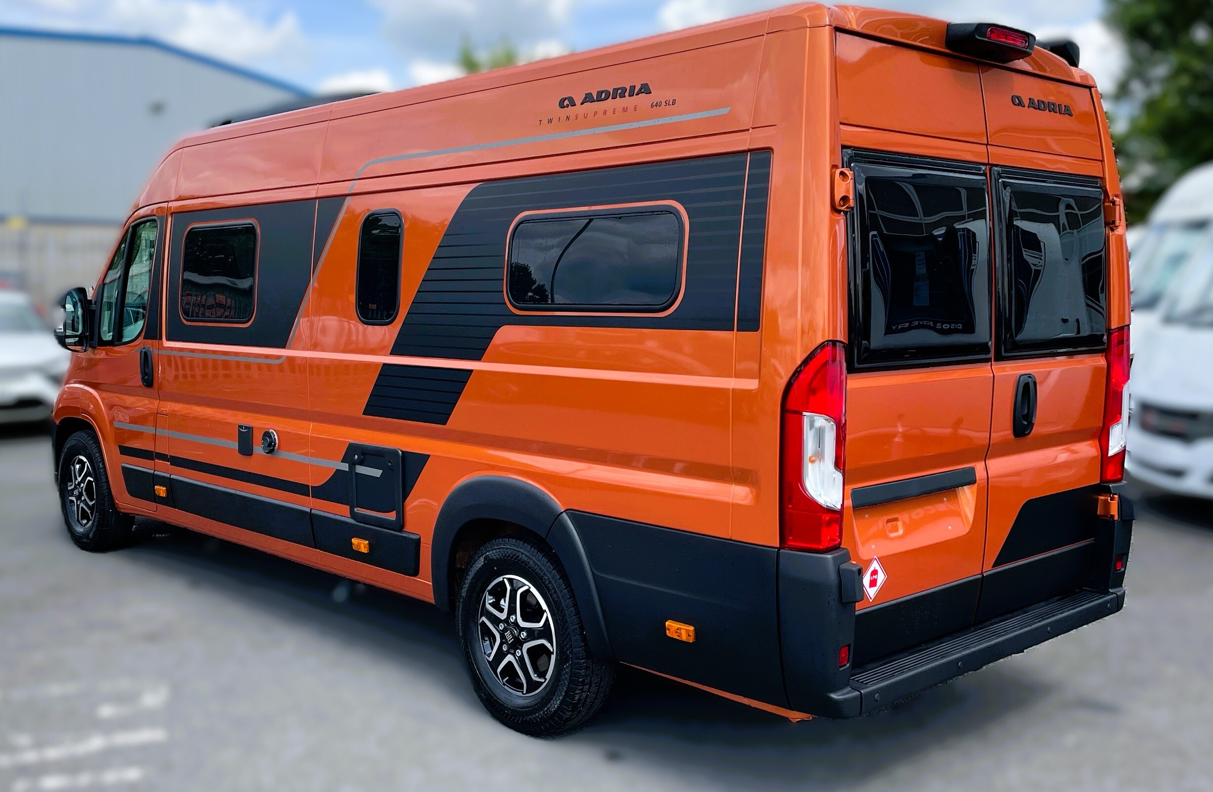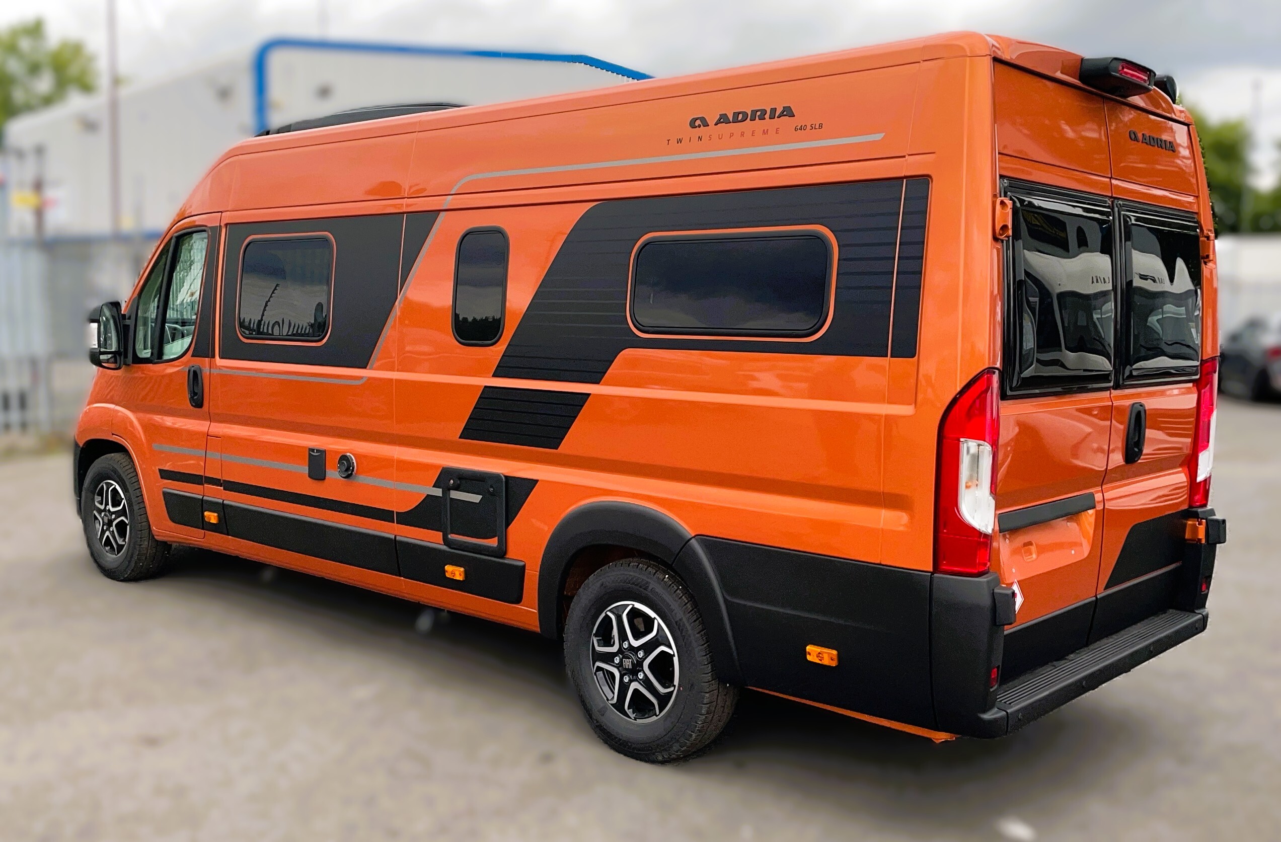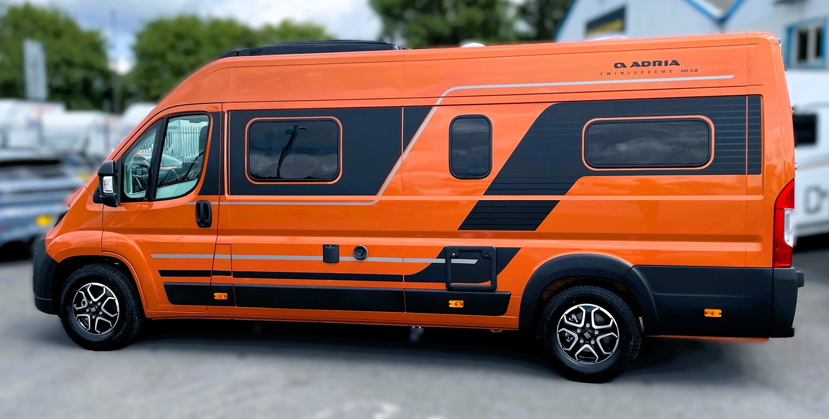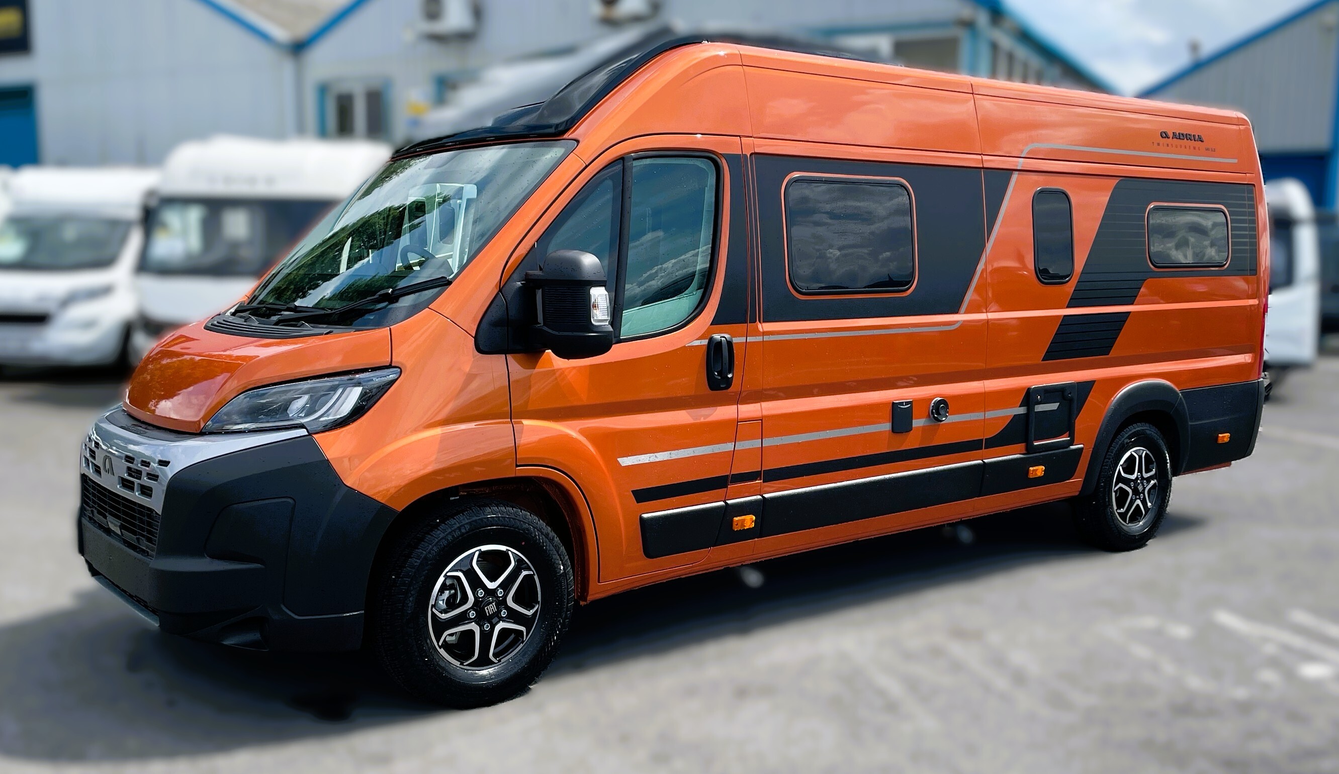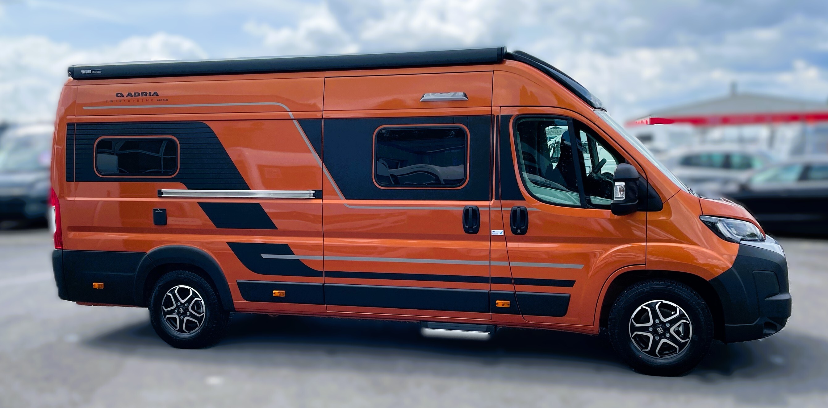 2025 Adria Twin Supreme 640LB Fiat 140BHP, Automatic 8-speed AT8, All Inclusive, Fiat Lux Pack, BATIC ORANGE 505 (black Front Bumper),10” Radio Navi DAB Rev. Camera, Full LED headlamps, Electric Park brake, Fuel tank 60L Diesel-electric heater with boiler Truma Combi D 6 E, Auxiliary battery X2 100ah AGM Solar Panel, PANORAMIC ROOF WINDOW WITH OPENING OPTION, Refrigerator with compressor, Flyscreen sliding door, Thule Awning, AddOn Airbed with TearGuard & Air pump for "AddOn bed", Outdoor table holder, LEATHER EDWARD Interior Cushions CARBON KNIT, 640 SLB With cross rear bed 196 x 145 cm