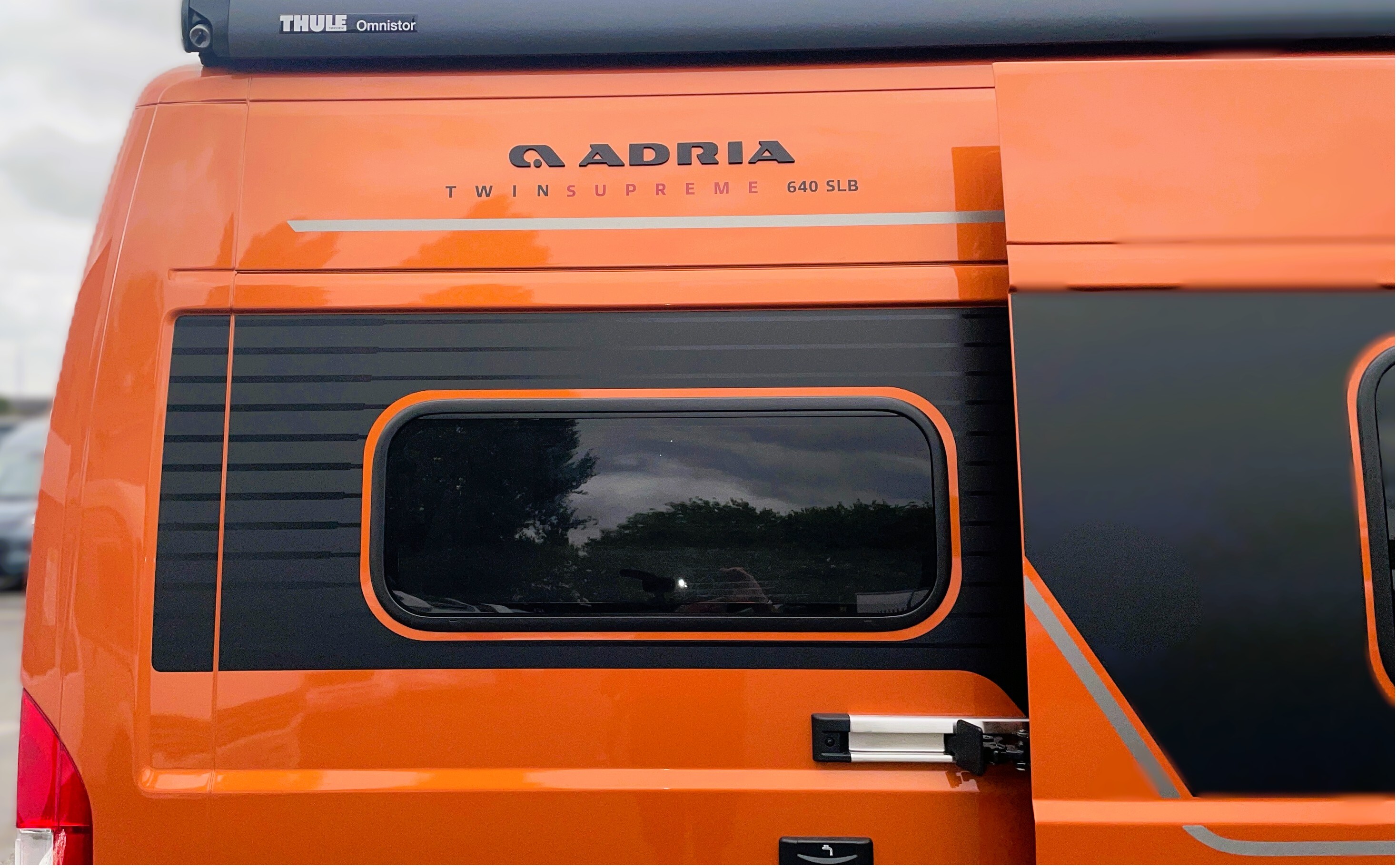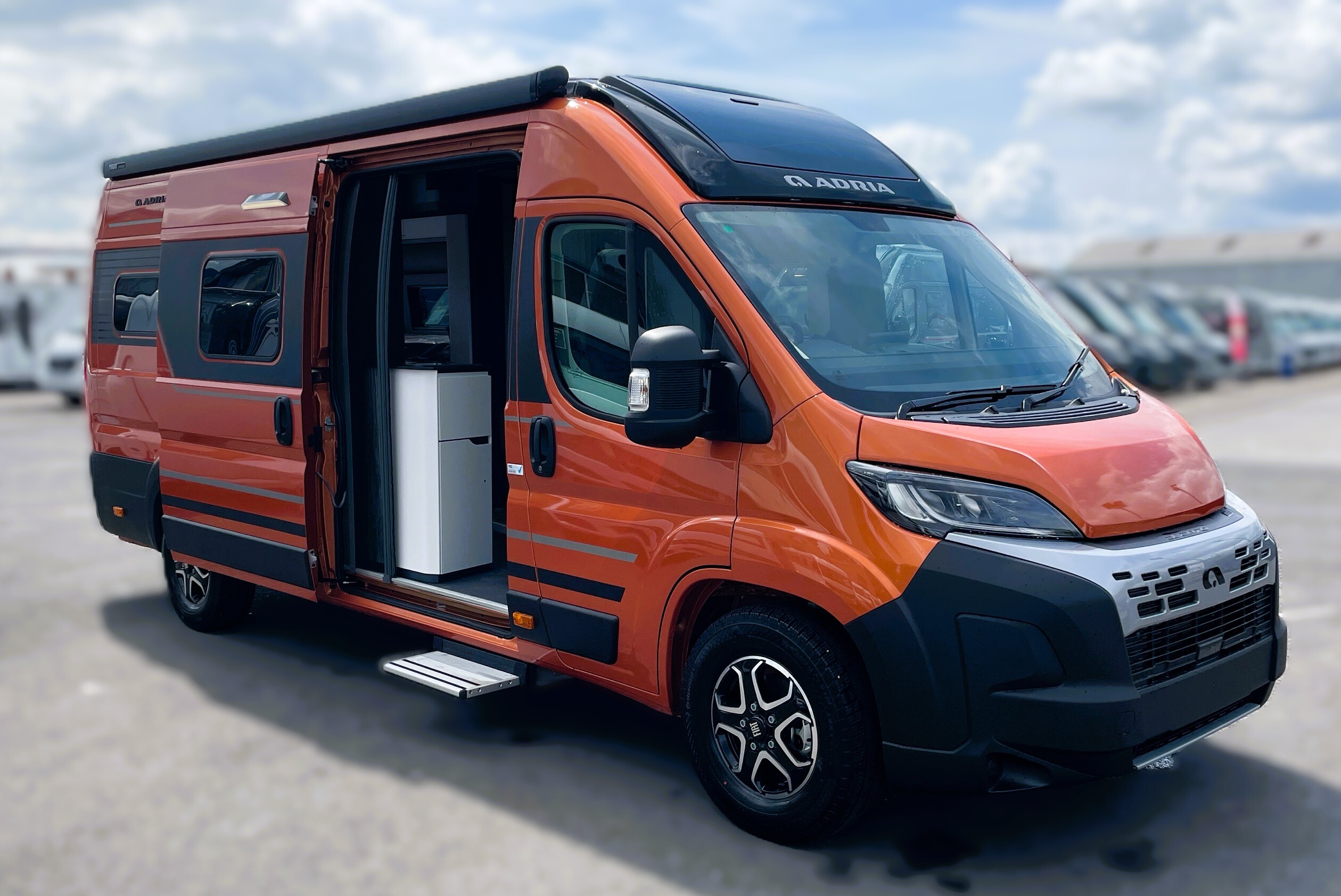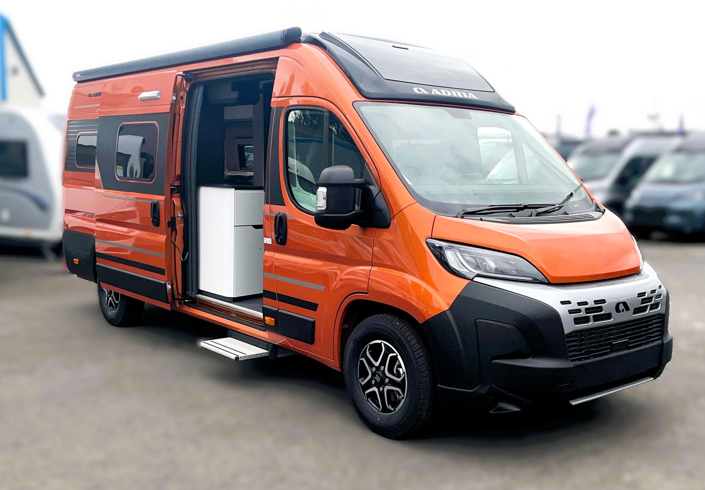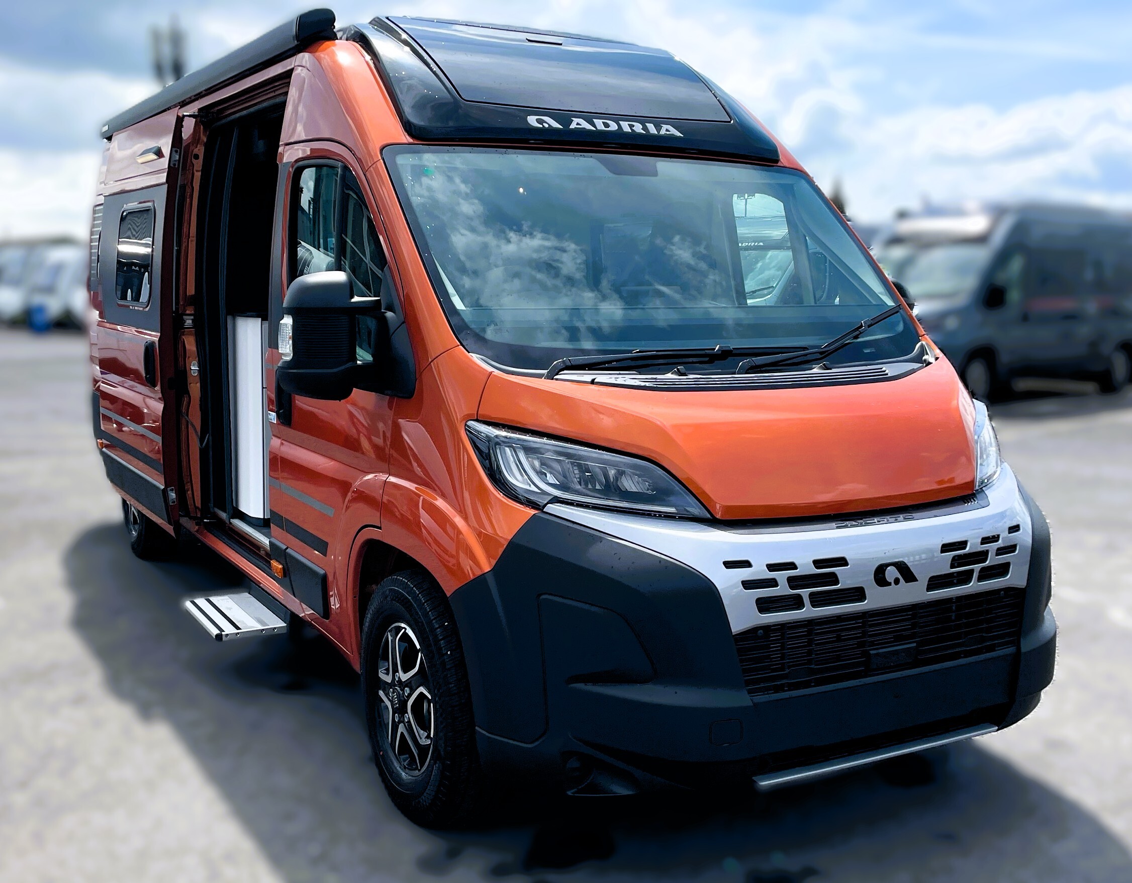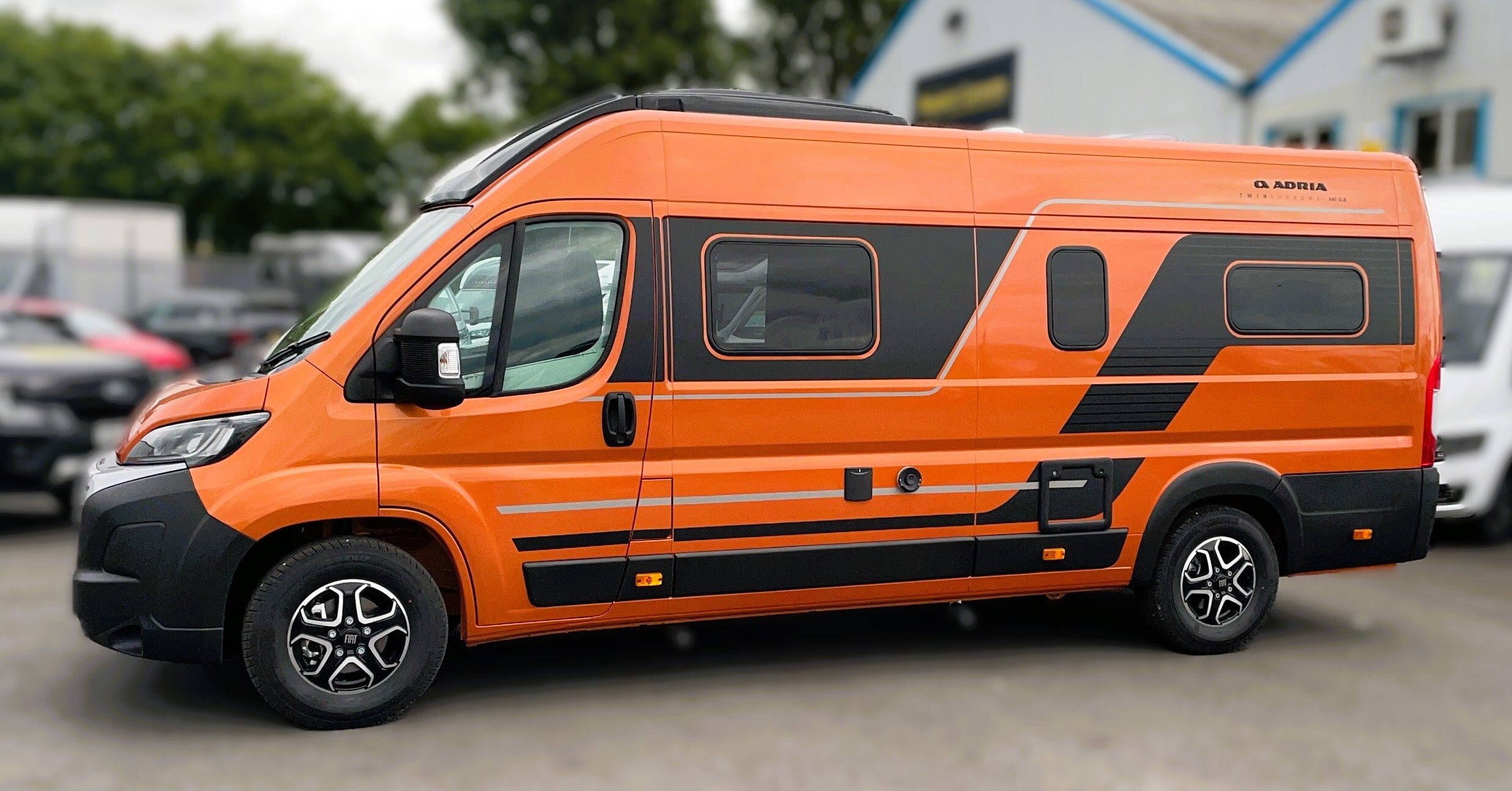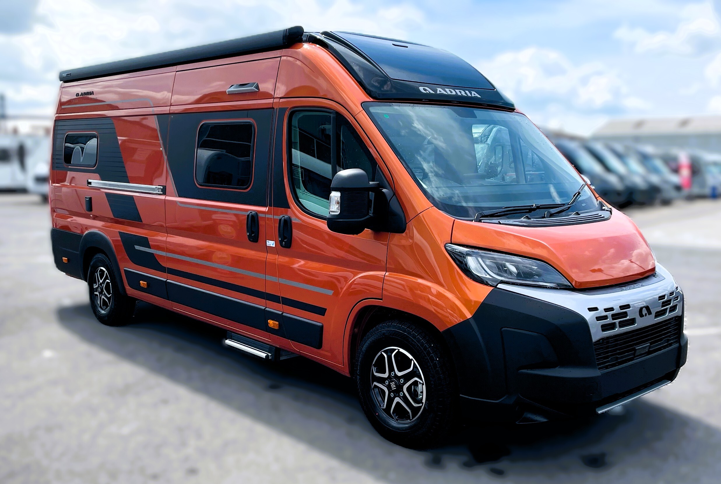 2025 Adria Twin Supreme 640LB Fiat 140BHP, Automatic 8-speed AT8, All Inclusive, Fiat Lux Pack, BATIC ORANGE 505 (black Front Bumper),10” Radio Navi DAB Rev. Camera, Full LED headlamps, Electric Park brake, Fuel tank 60L Diesel-electric heater with boiler Truma Combi D 6 E, Auxiliary battery X2 100ah AGM Solar Panel, PANORAMIC ROOF WINDOW WITH OPENING OPTION, Refrigerator with compressor, Flyscreen sliding door, Thule Awning, AddOn Airbed with TearGuard & Air pump for "AddOn bed", Outdoor table holder, LEATHER EDWARD Interior Cushions CARBON KNIT, 640 SLB With cross rear bed 196 x 145 cm