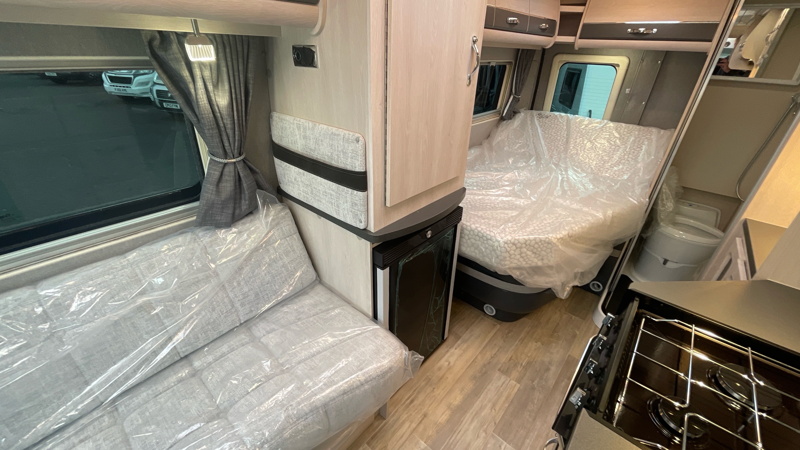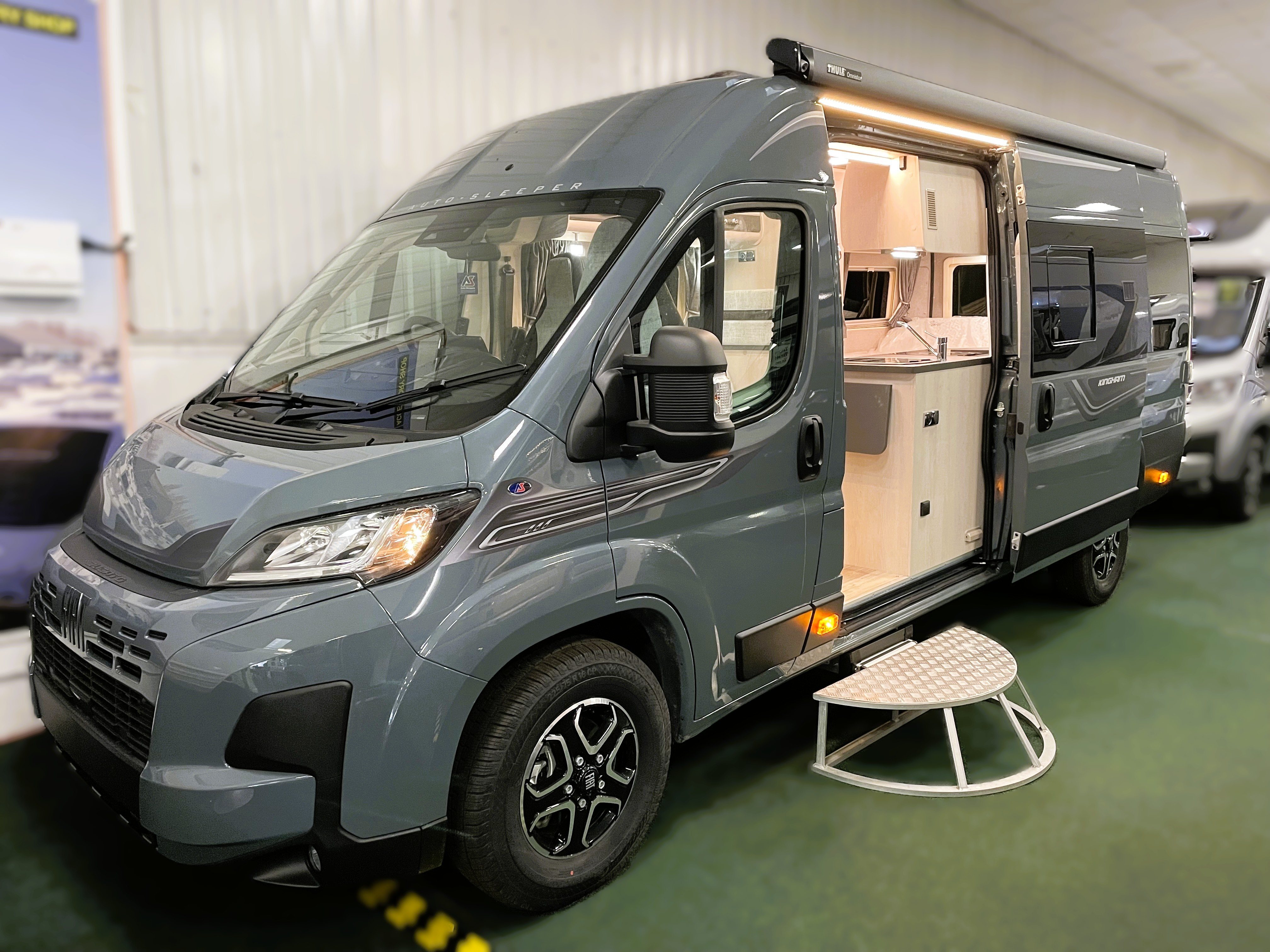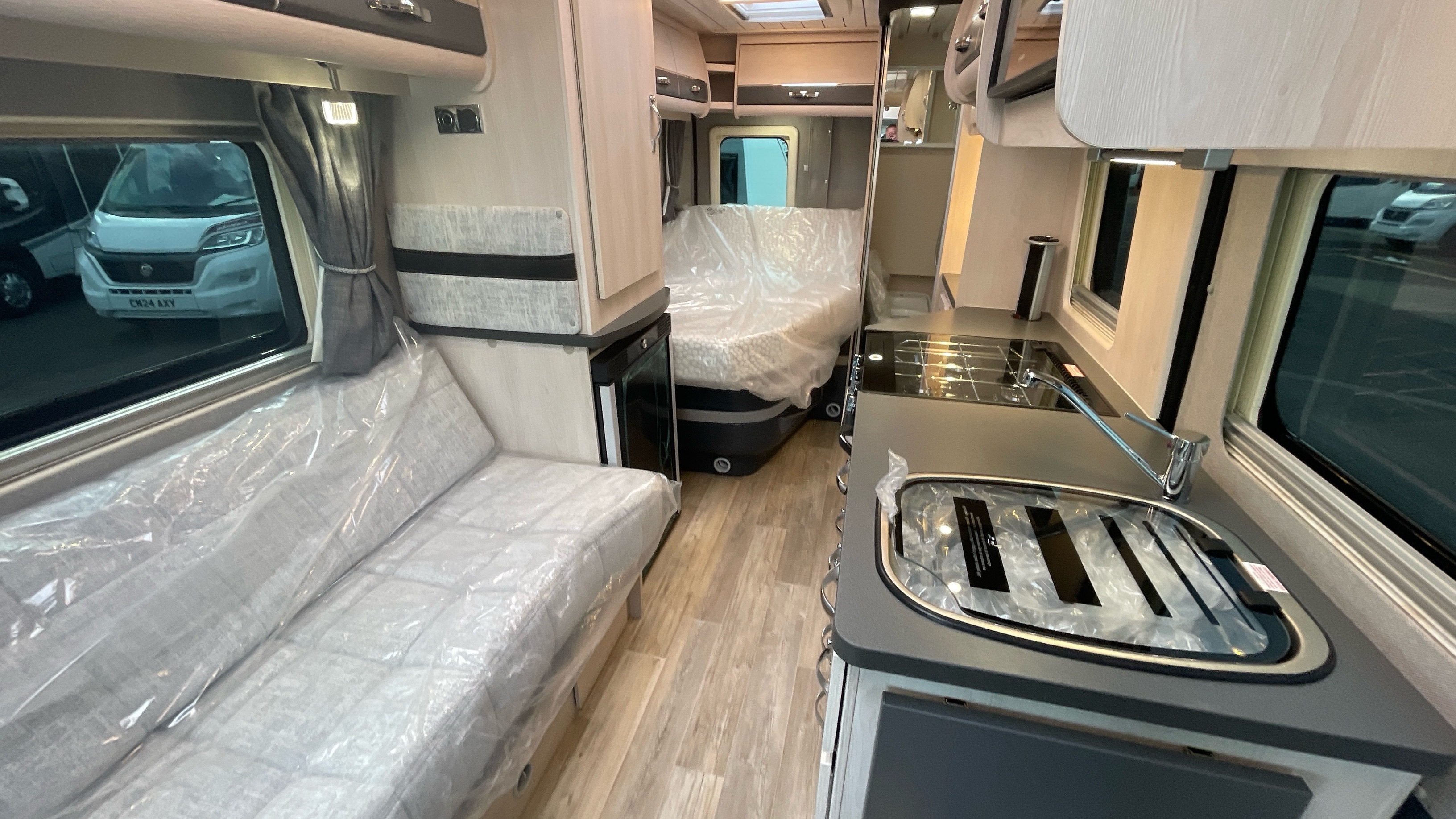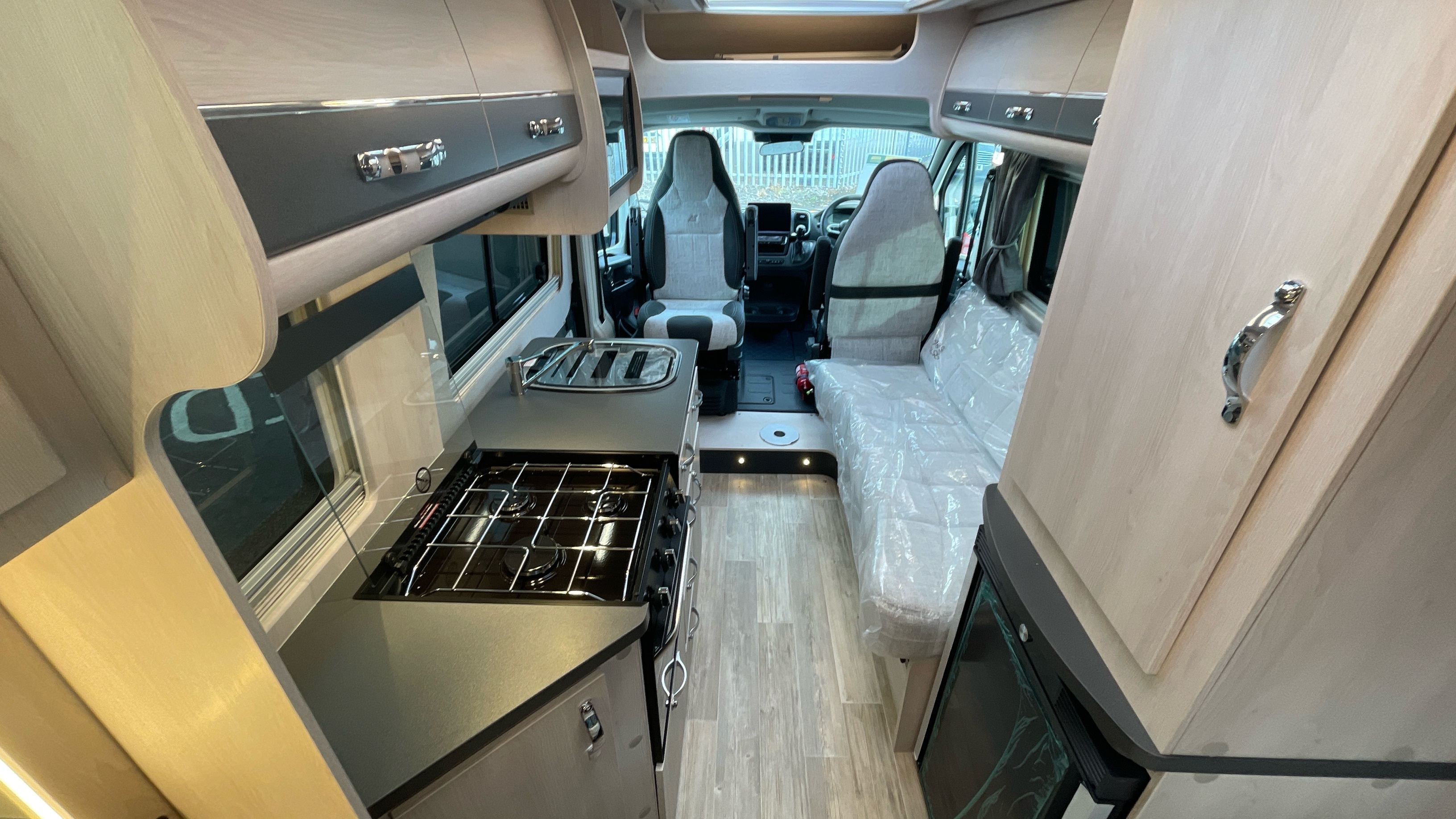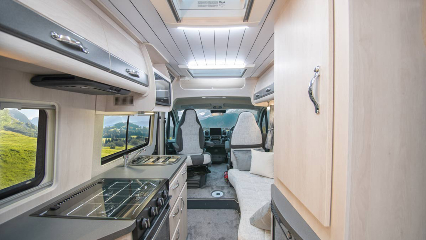The Kingham raises the bar to an all-new level, featuring a fixed French double bed that can slide back to lift the rear section to provide backrest support, pulls down flat for nighttime use and can lift up on gas struts for access to the large storage area beneath. A fully featured kitchen is on the nearside with bespoke sofa seating and swiveling cab seats at the front combining to make this a unique and exceptional proposition for luxury 2 berth accommodation.