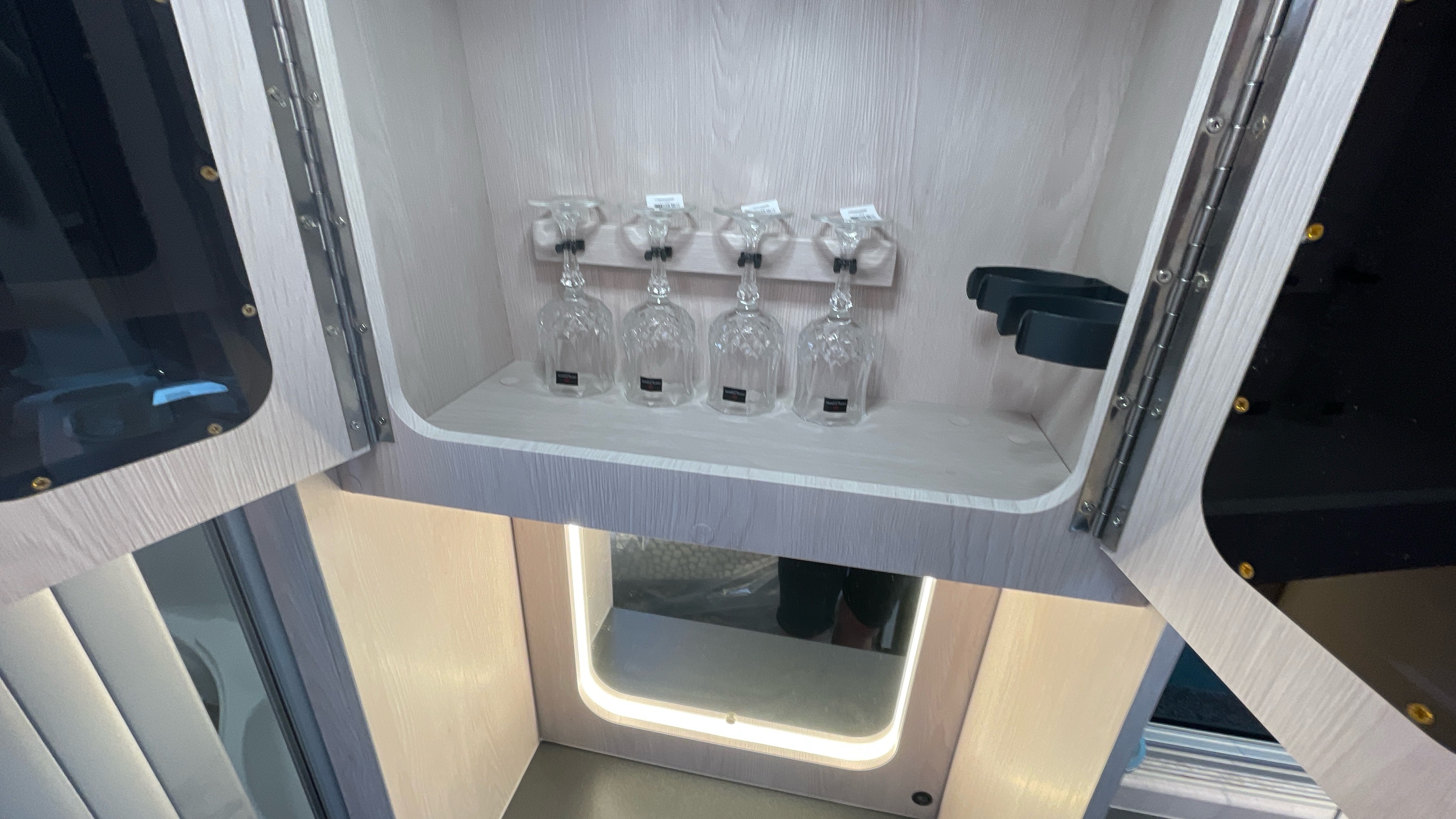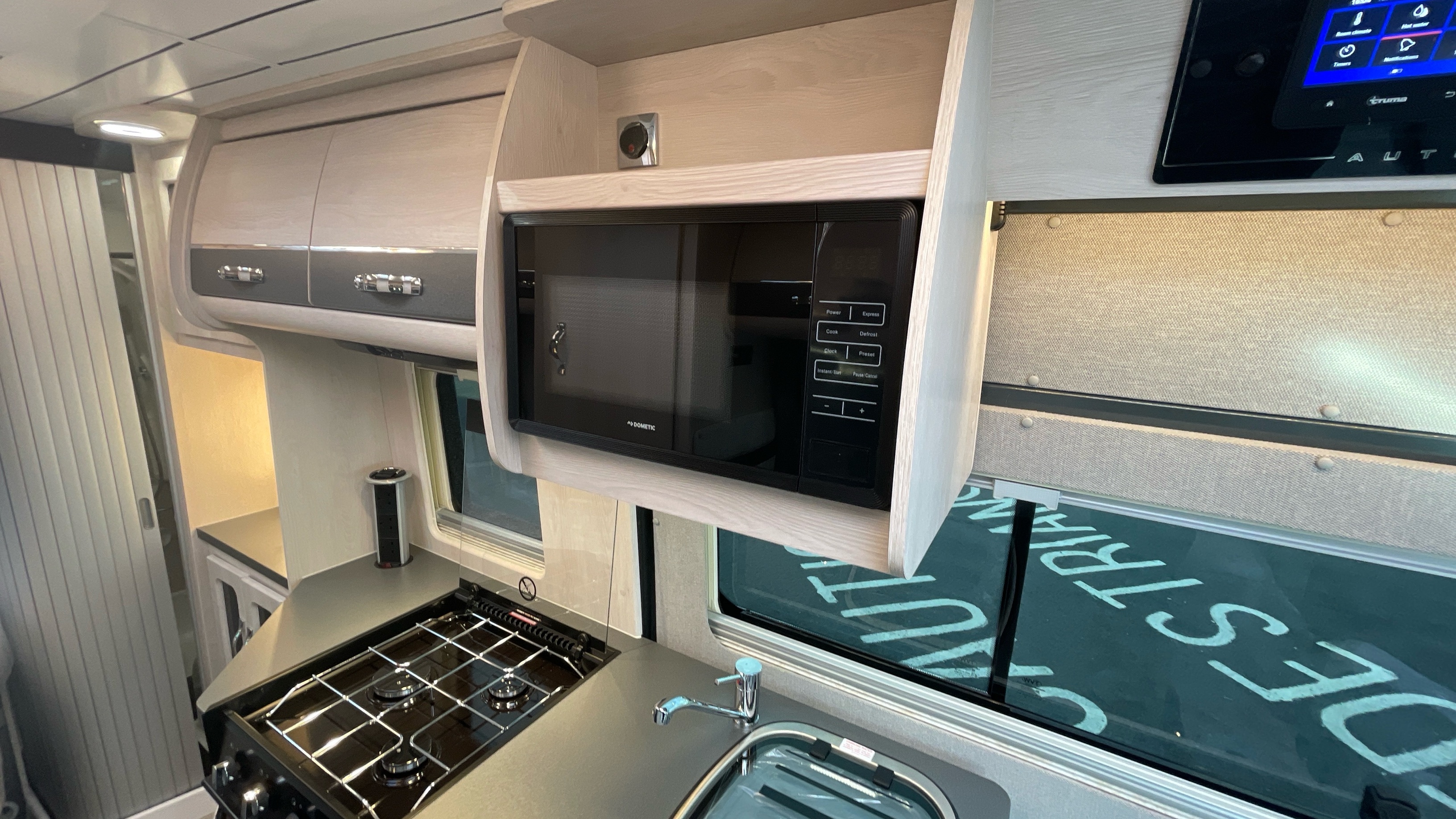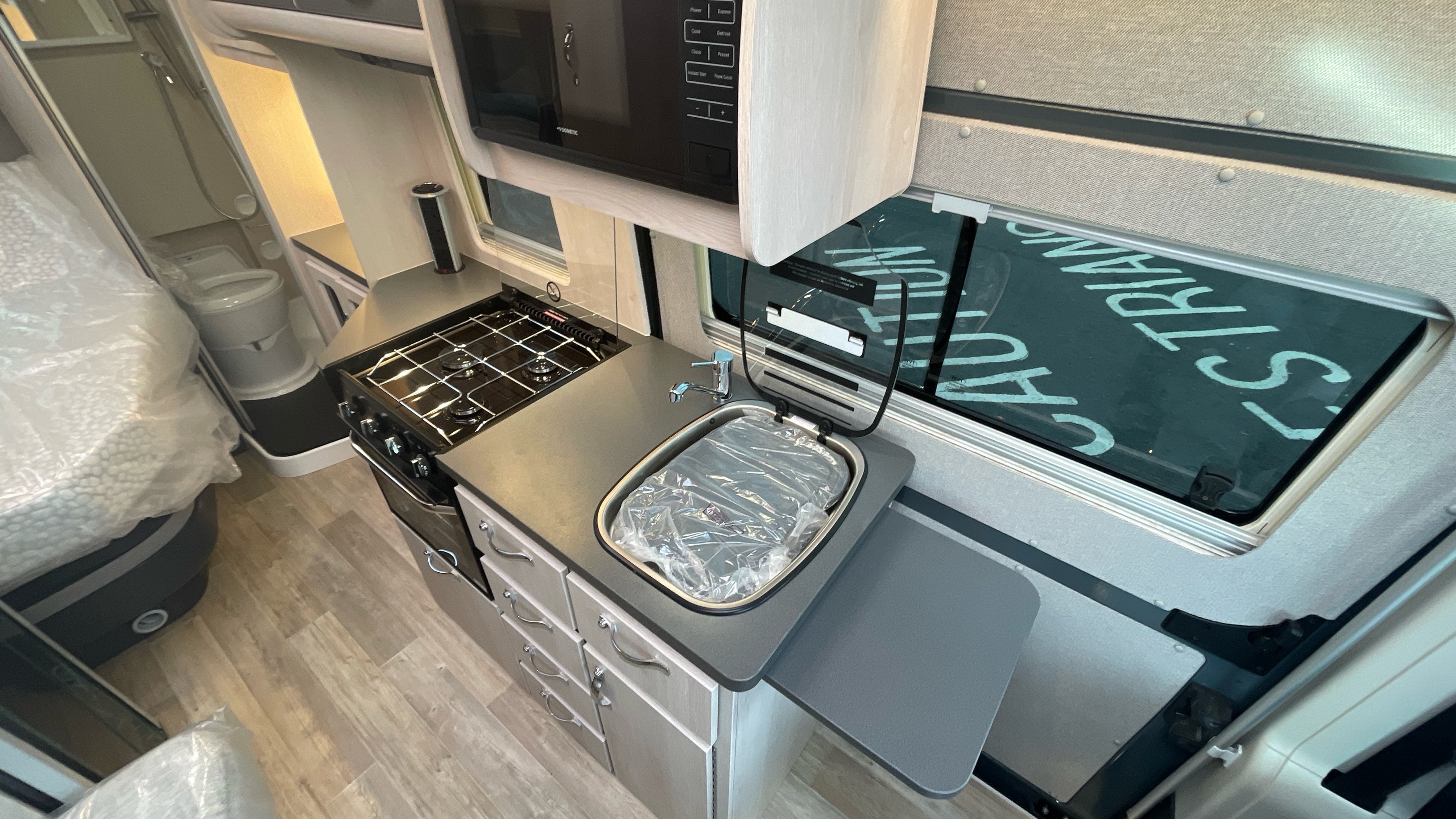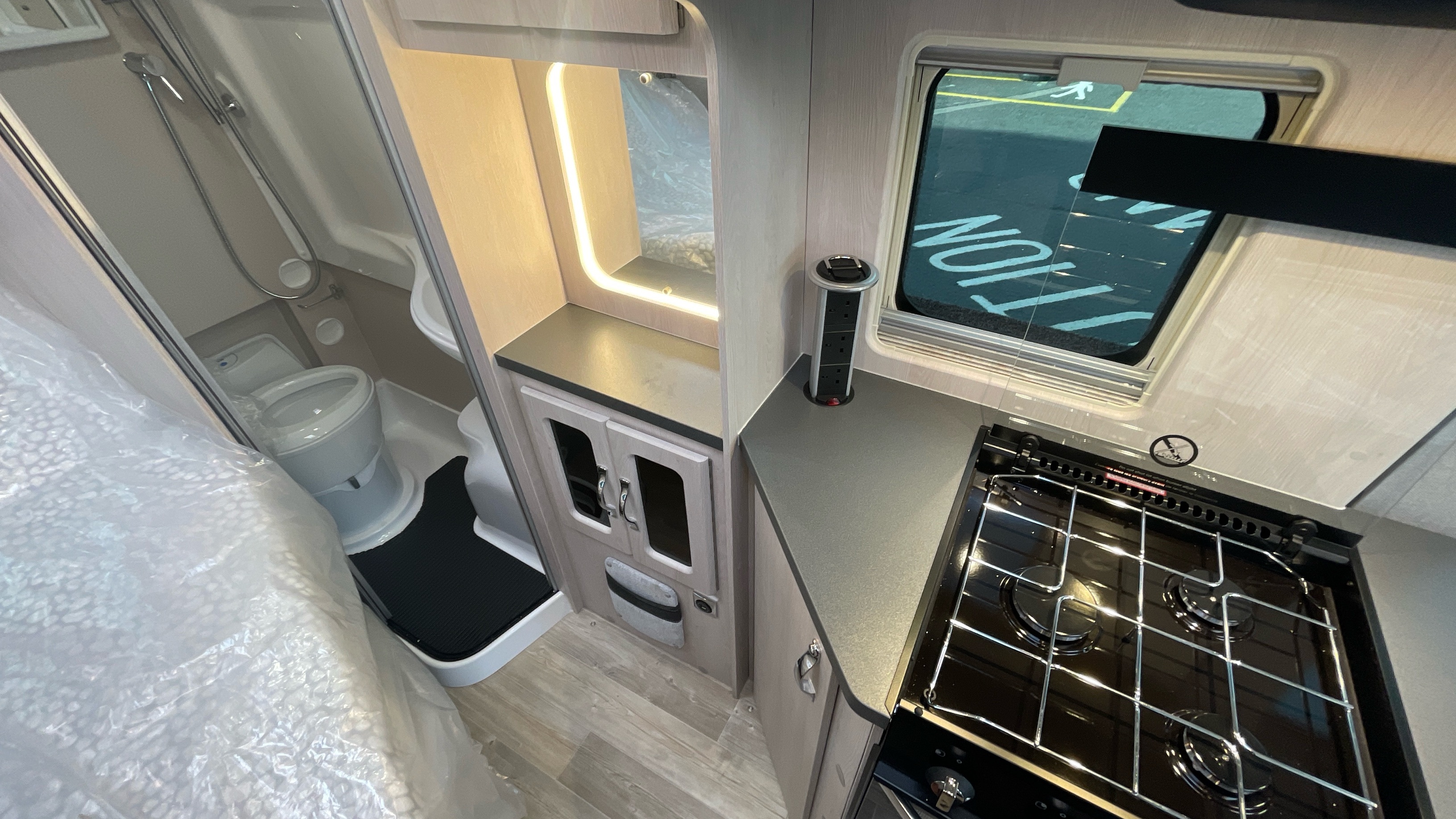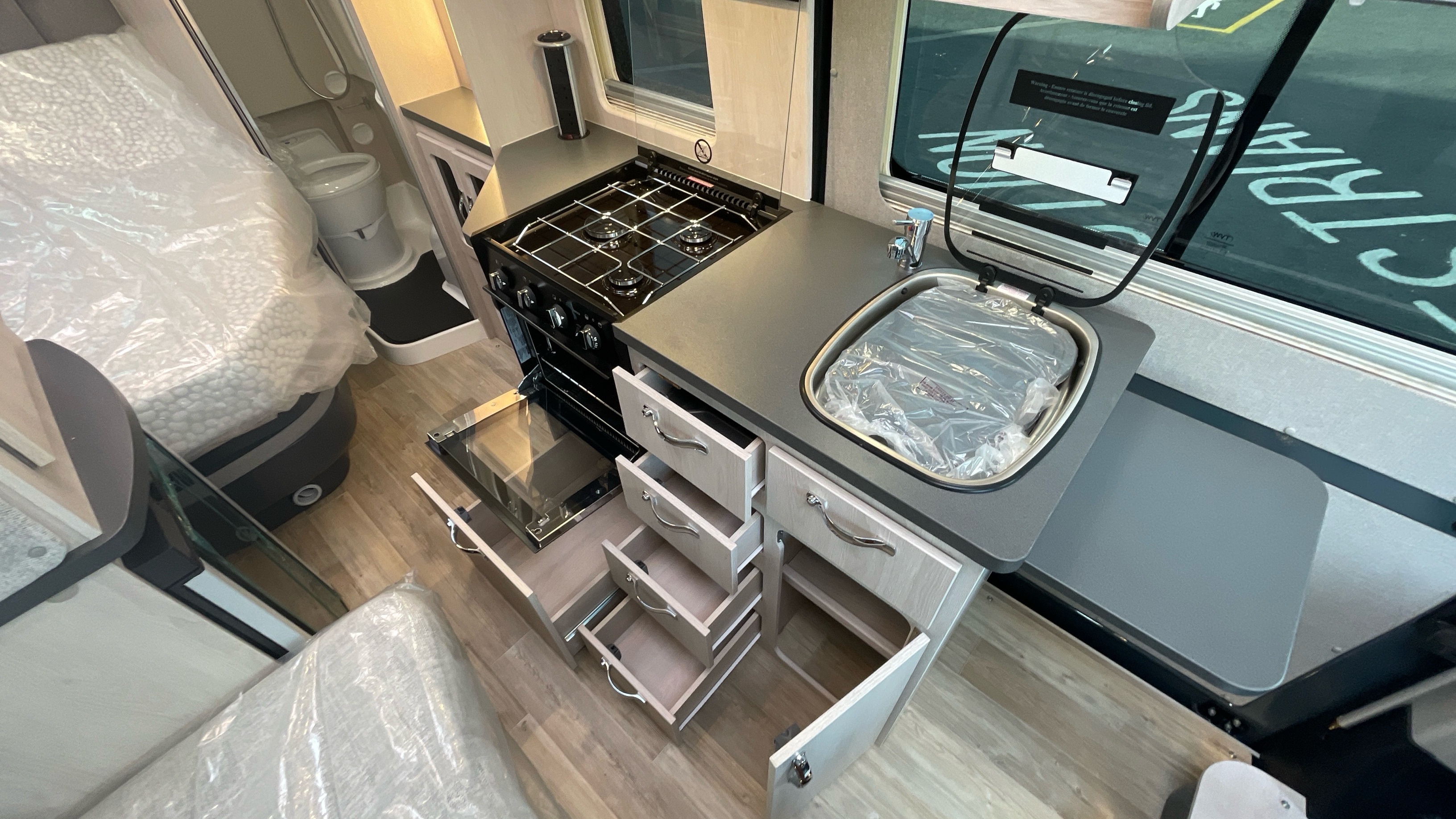The Kingham raises the bar to an all-new level, featuring a fixed French double bed that can slide back to lift the rear section to provide backrest support, pulls down flat for nighttime use and can lift up on gas struts for access to the large storage area beneath. A fully featured kitchen is on the nearside with bespoke sofa seating and swiveling cab seats at the front combining to make this a unique and exceptional proposition for luxury 2 berth accommodation.