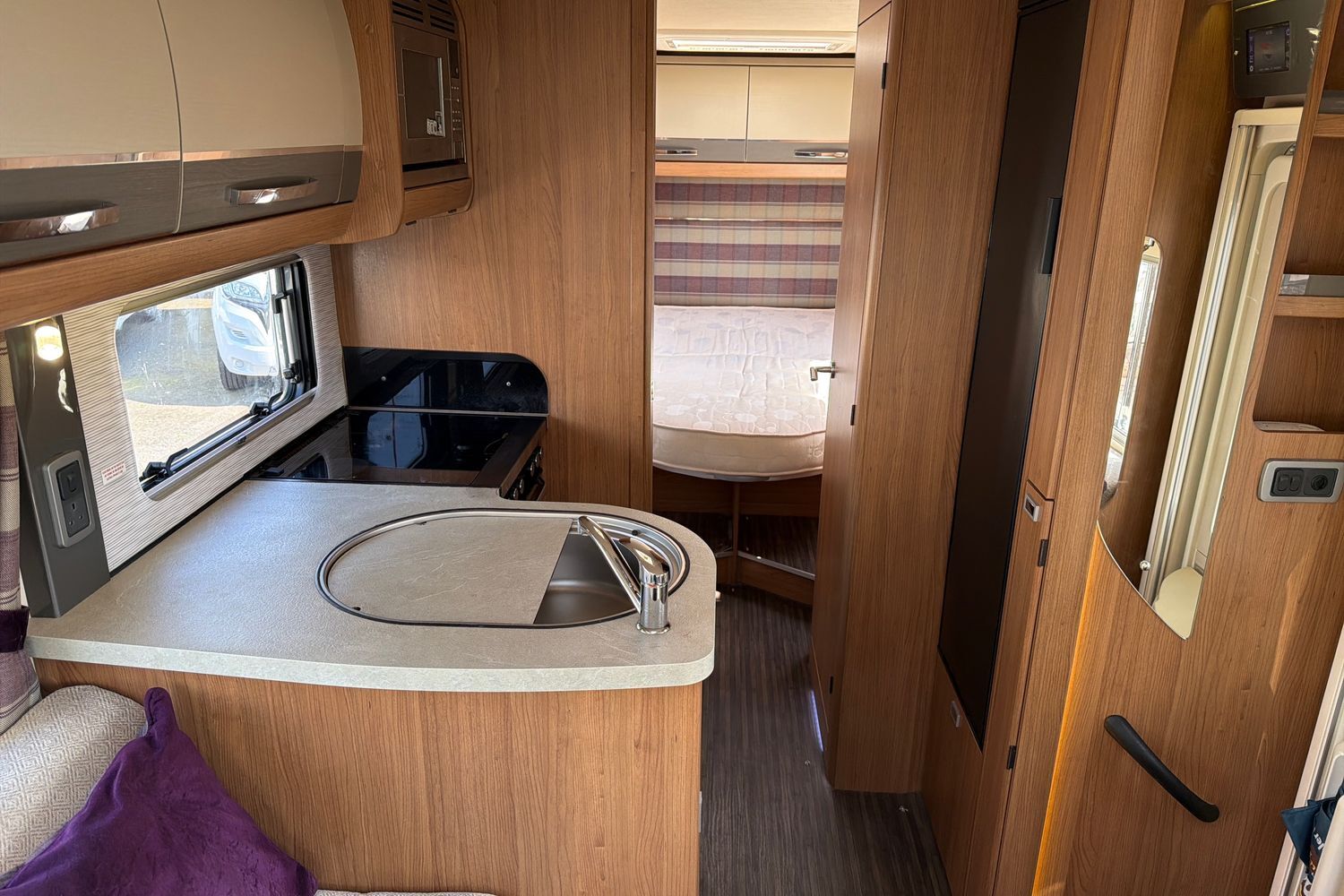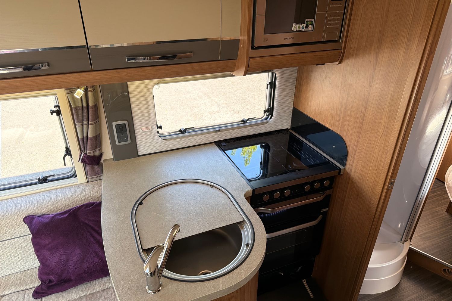 Inside, the popular rear lounge layout provides a bright, spacious seating area that easily converts into a generous double bed, making it ideal for couples who value flexible living space. The central kitchen is well equipped with ample storage and workspace, while the fully enclosed washroom offers a separate shower for added convenience on longer trips.