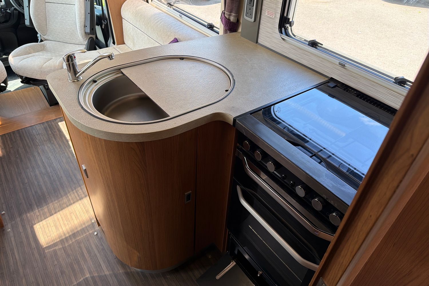 Up front, the cab benefits from swivel captain’s seats, seamlessly extending the living area, and the automatic gearbox ensures relaxed driving whether cruising motorways or navigating town centres. High build quality throughout reflects Auto‑Trail’s reputation for durable, well‑finished motorhomes.