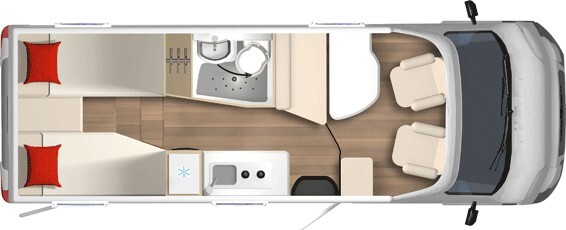 Burstner's Nexxo Van T 690 G motorhome comes in just under 7 metres so you can enjoy extra comforts such as a full height wardrobe and a large fridge with freezer. The layout features two single beds which can also convert to one extra-large king size double and sits over a very spacious garage that is sectioned off to provide excellent internal clothes storage and more wardrobe space. Enjoy the extra feeling of wellbeing that is core to Burstner's concept of living the dream. Extra care has gone into delivering a well-designed environment that is ergonomically enhanced such as the comfortable bed dimensions, slatted bases and cold foam mattresses. Other extra touches include interior head room of 198cm, warm air vents in the lounge, USB charging sockets, ventilated storage cupboards to the rear, LED lighting throughout the vehicle and roof vents above the living and kitchen area as well as the toilet compartment.