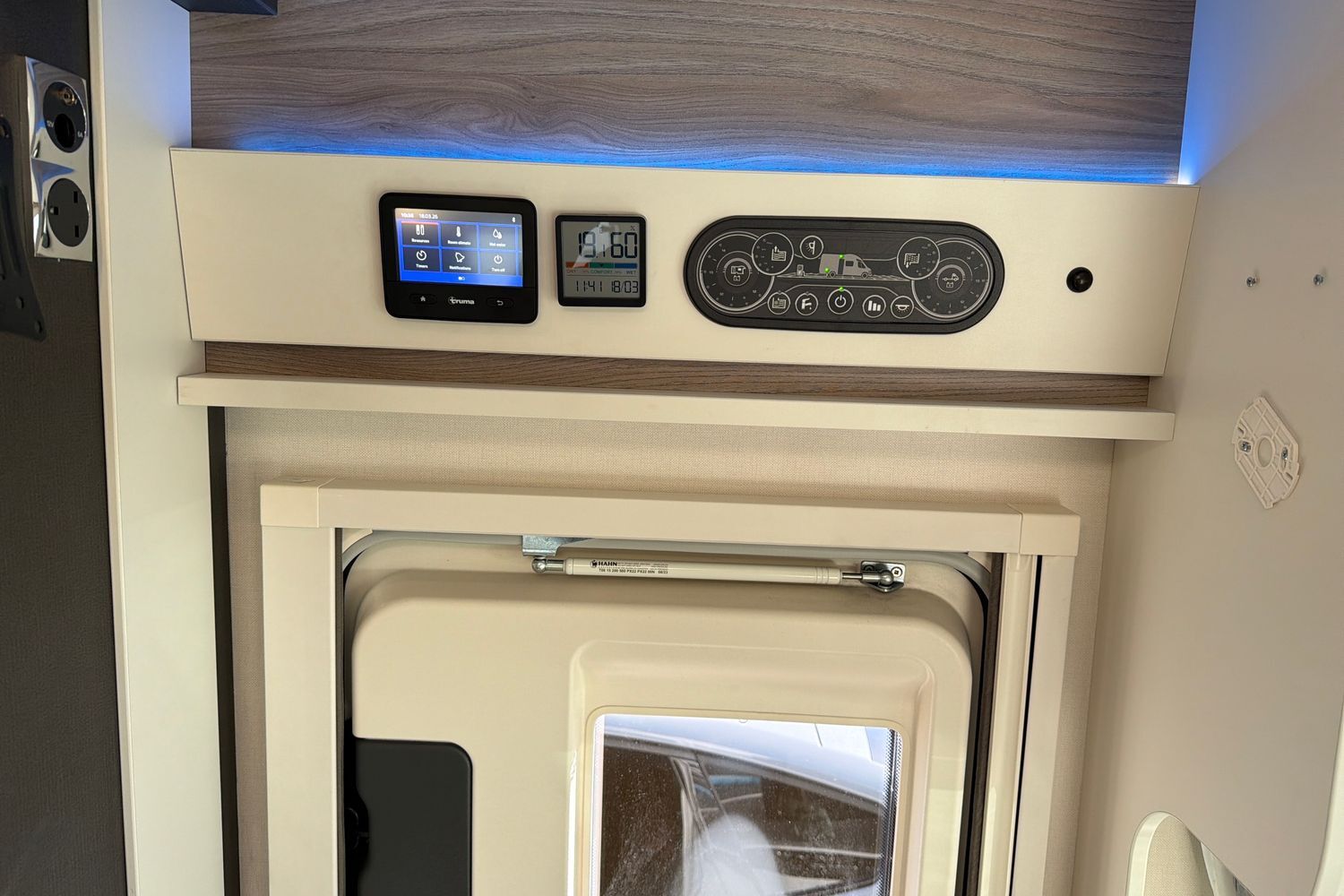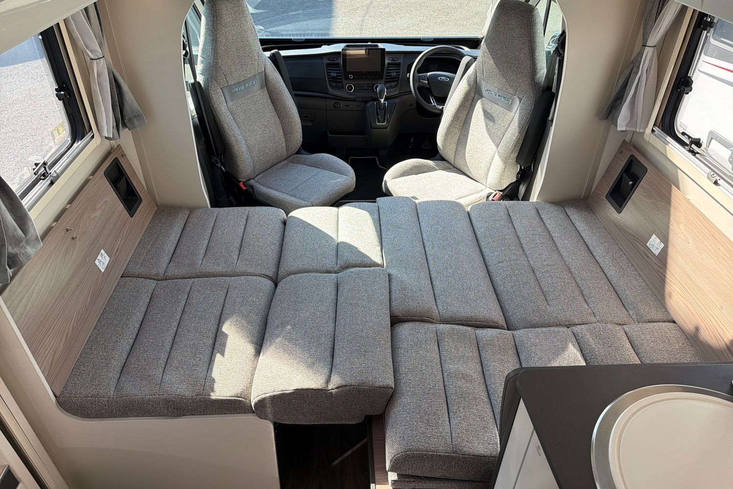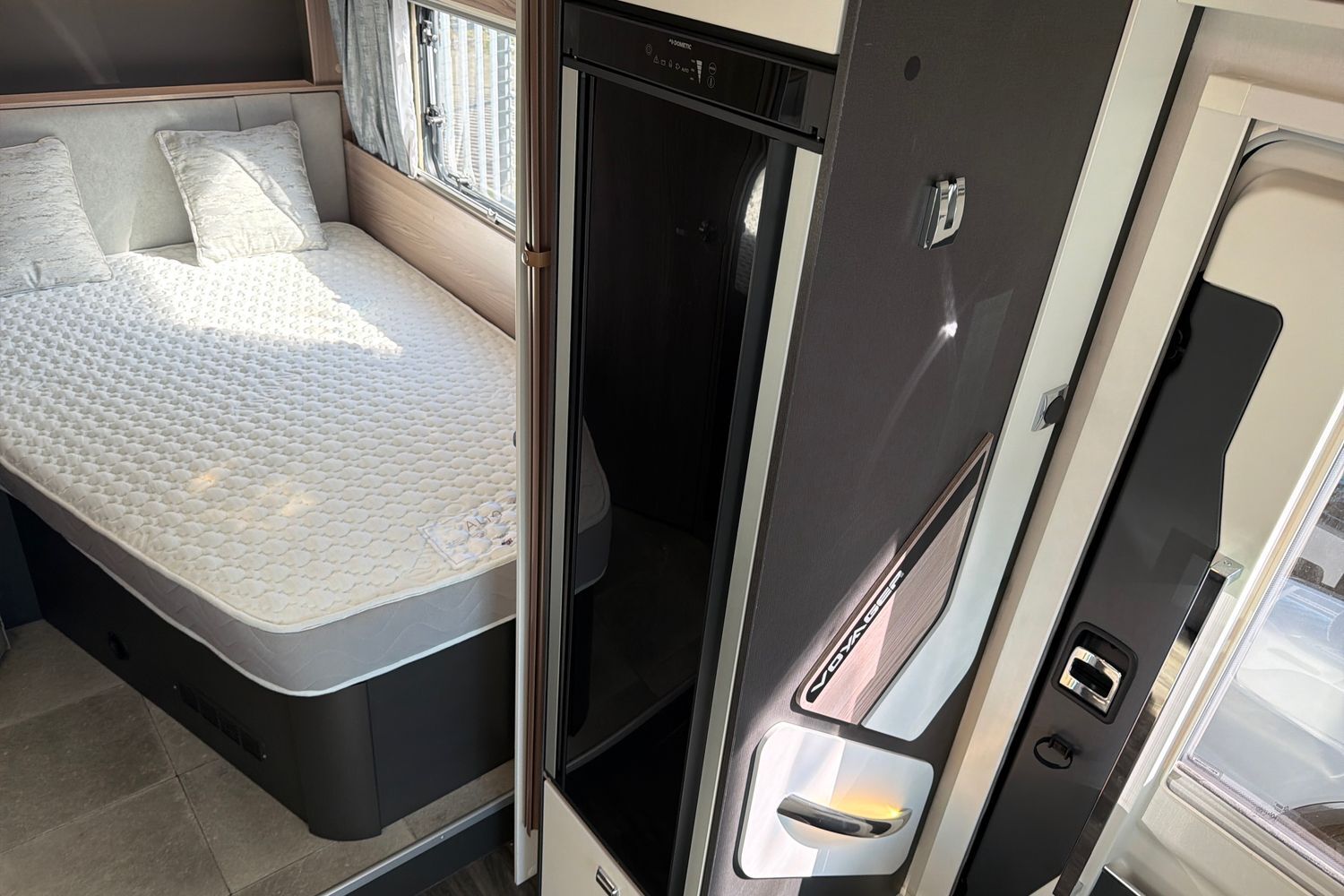 Integrated Thule‑style awning light. Good garage/storage capacity beneath the fixed bed