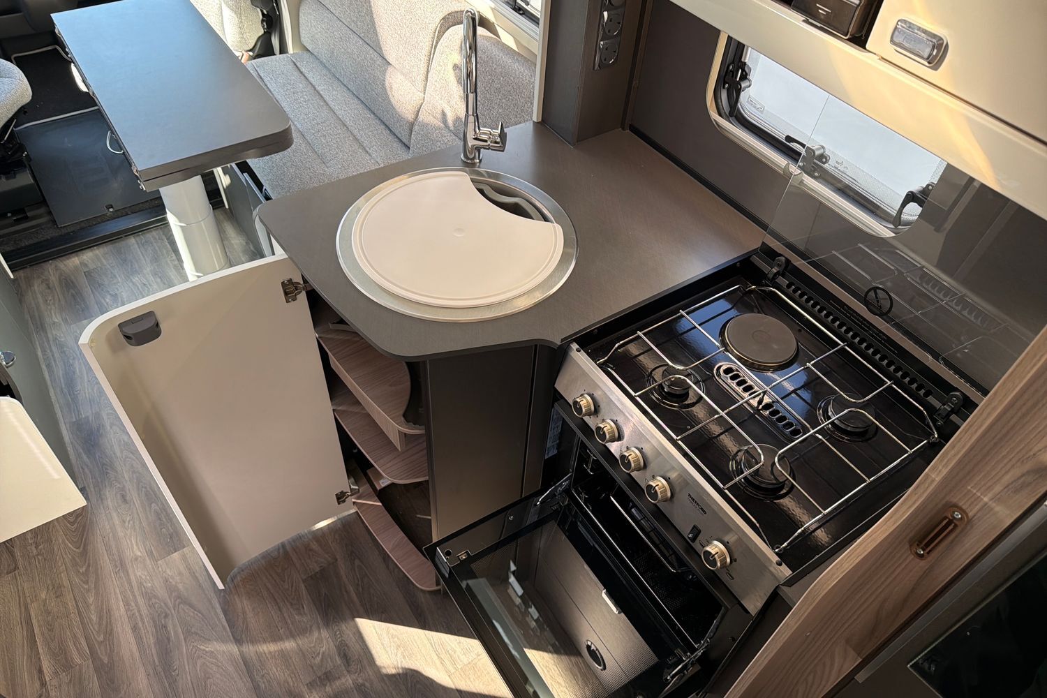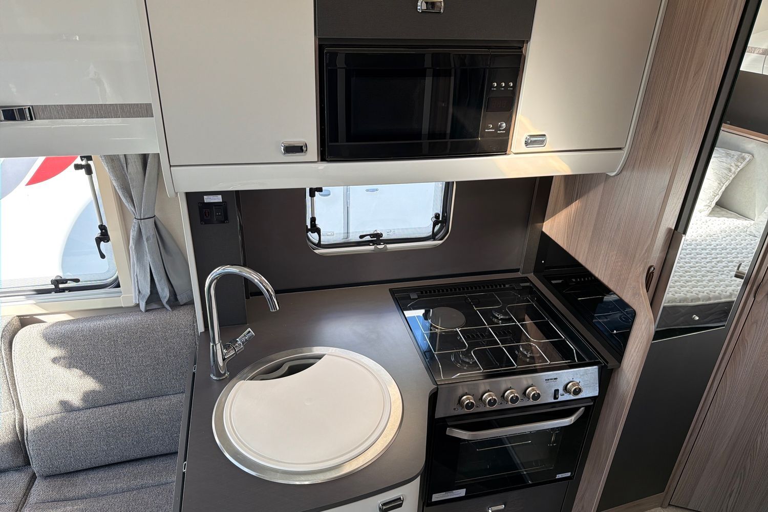 Fully equipped galley with 3‑burner hob, oven/grill, and microwave. Large fridge/freezer
