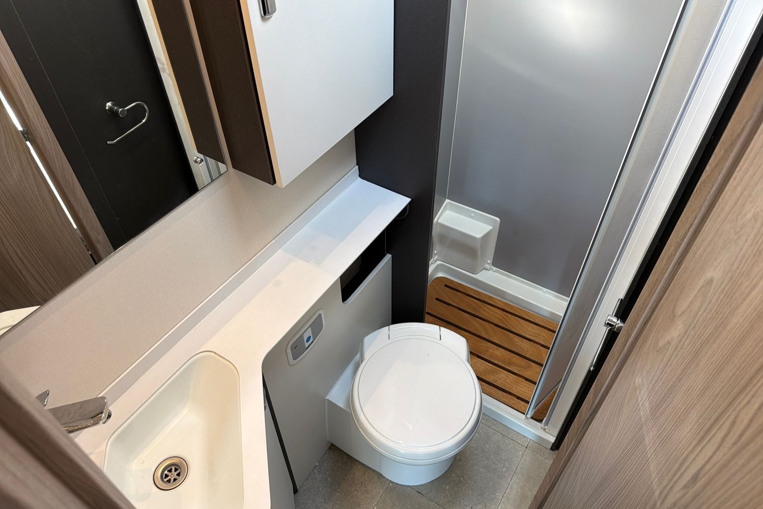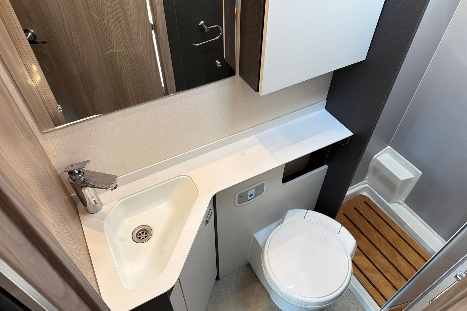 Ample worktop and storage. Washroom Well‑designed washroom with shower enclosure, toilet, and washbasin